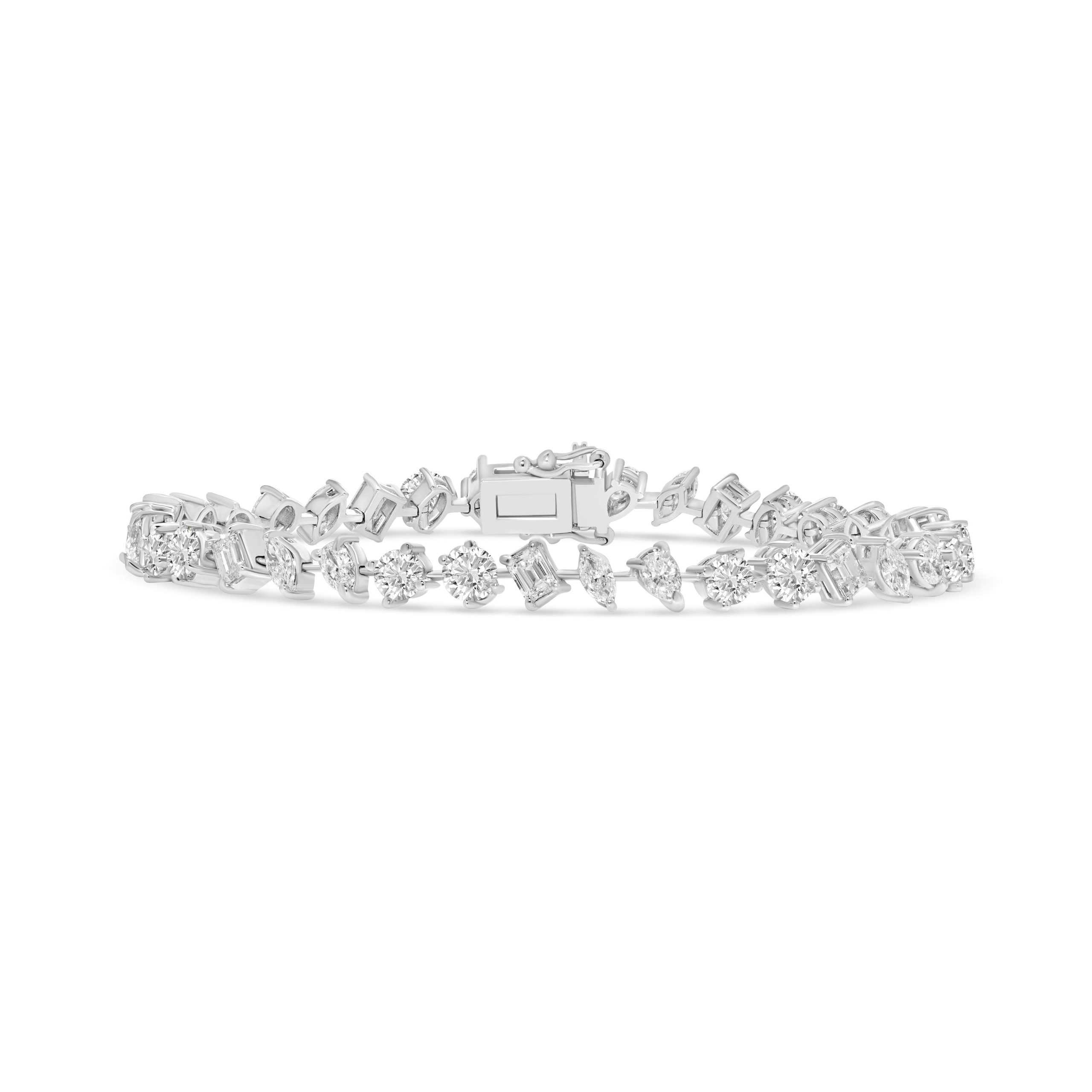 Adorn your wrist with timeless elegance with our 14 karat white gold diamond tennis bracelet. This luxurious piece features a stunning array of diamonds, including 6.73cts. of emerald, marquise, oval, and round brilliant cuts. The diverse shapes of the diamonds create a captivating and unique design, ensuring every angle sparkles with brilliance. Perfect for special occasions or to add a touch of sophistication to your everyday attire, this diamond tennis bracelet is a breathtaking addition to any jewelry collection.