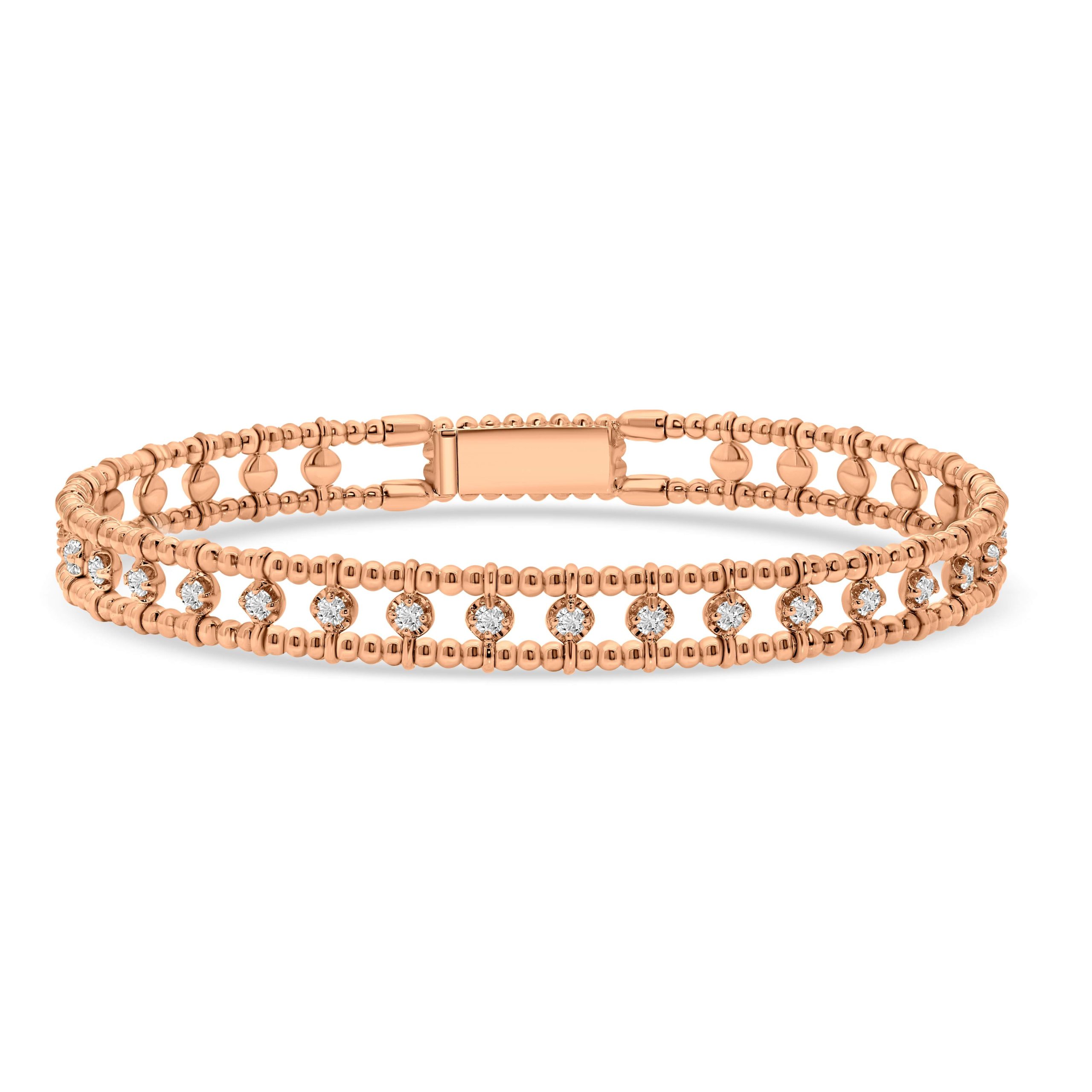 Welcome to a world of understated elegance and captivating charm with our 14 karat rose gold diamond flexible bangle. Adorned with 0.49cts. of round brilliant cut diamonds, this bangle is a testament to refined sophistication. The centerpiece showcases a mesmerizing arrangement of diamonds, delicately embraced by lustrous rose gold balls on either side, exuding a soft, romantic allure. Embrace the warmth of rose gold and the brilliance of diamonds in this gracefully designed bangle, a true embodiment of timeless beauty and graceful femininity. Elevate your style effortlessly with this stunning piece, designed to adorn your wrist with an enchanting touch of luxury and allure.