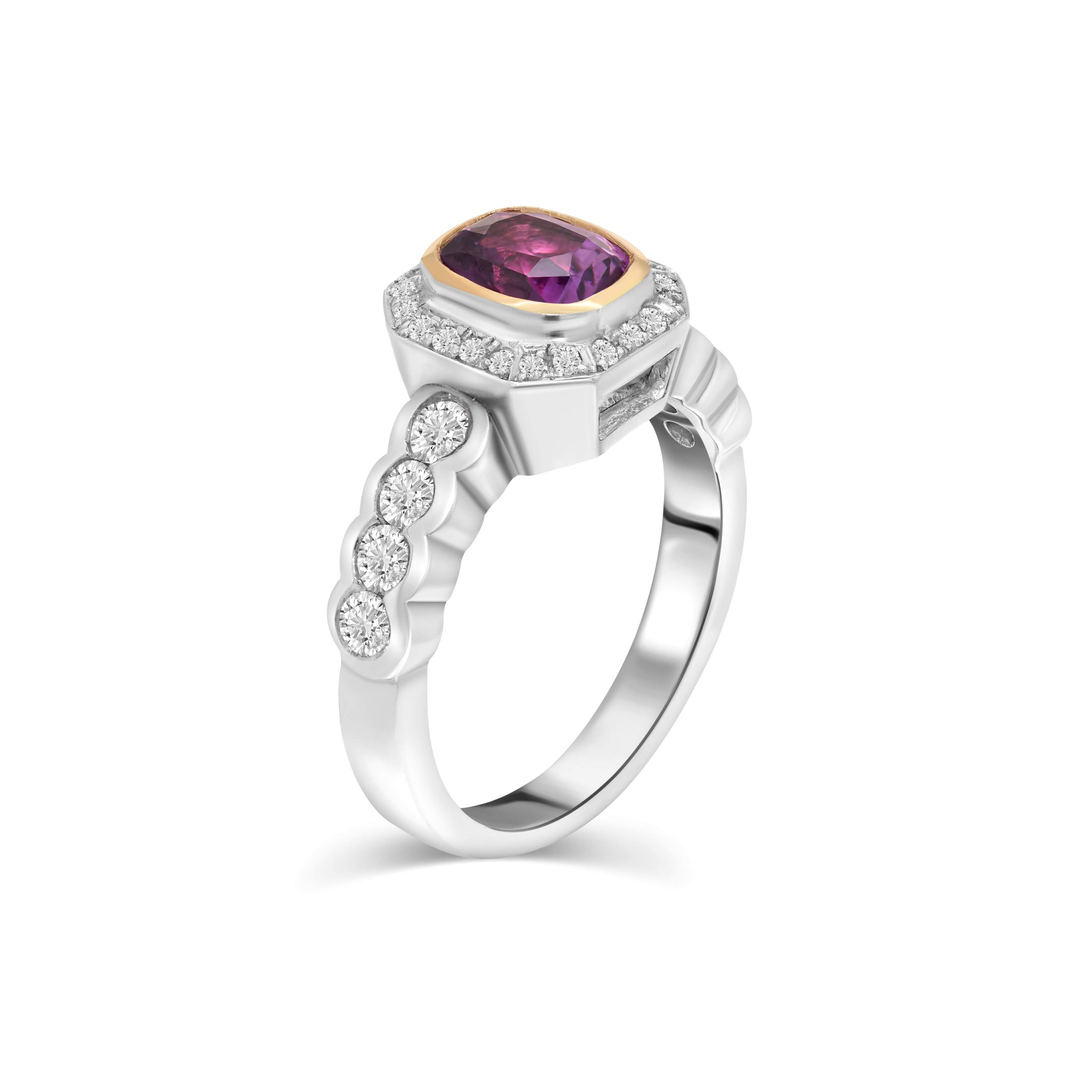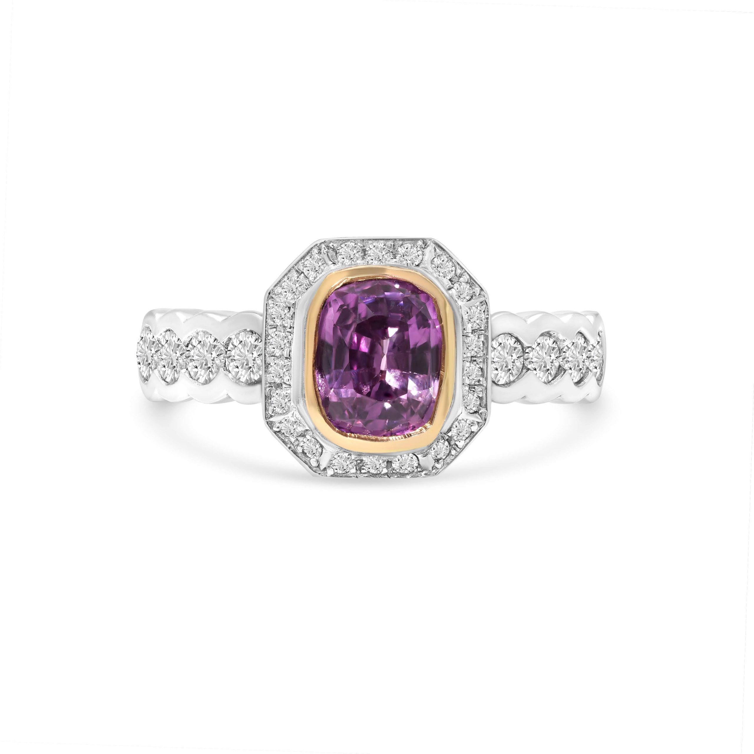 Embrace timeless elegance with our enchanting 14 karat two tone diamond and pink sapphire ring, a true symbol of sophistication and grace. At its heart, a mesmerizing 1.35ct. pink sapphire takes center stage, delicately set in a radiant yellow gold bezel for a pop of vibrant color. Surrounding the captivating sapphire are shimmering diamonds totaling 0.12cts., adding a touch of brilliance and luxury to the design. Flanking either side of the ring, four semi bezel set round brilliant cut diamonds totaling 0.48cts. further enhance the beauty and allure of this exquisite piece. Elevate your jewelry collection with this stunning ring, a perfect fusion of style and elegance that will leave a lasting impression.