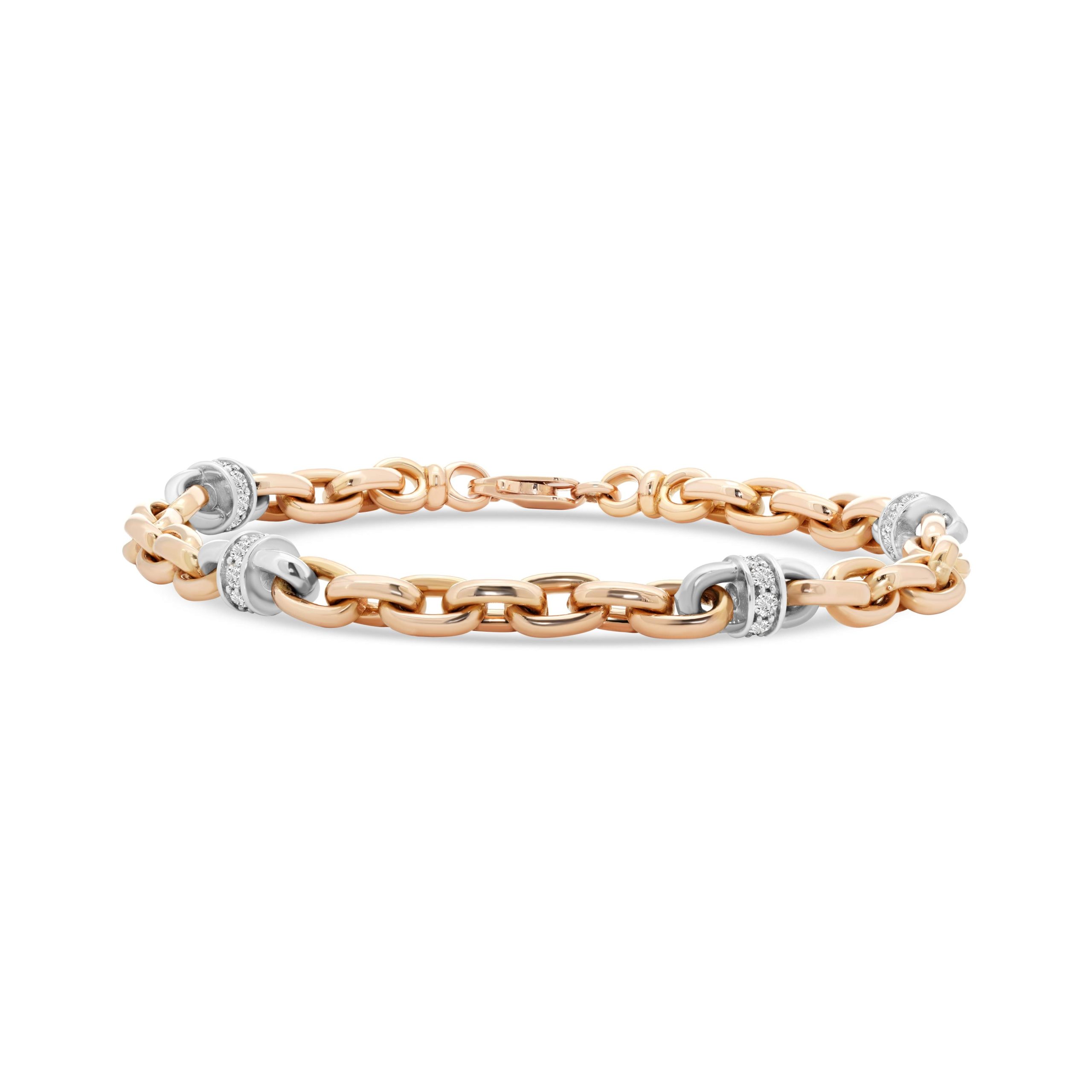 Discover the artistry of contrast with our 14 karat two toned gold linked diamond bracelet, a harmonious blend of sophistication and contemporary style. Set within the white gold segments, 0.76cts. of mesmerizing round brilliant cut diamonds exude brilliance and allure. The seamless transition between the rose gold and the diamond-adorned white gold sections creates a captivating visual contrast, infusing modern elegance into timeless design. Elevate any ensemble with this exquisite bracelet, a radiant expression of refined craftsmanship and refined beauty.