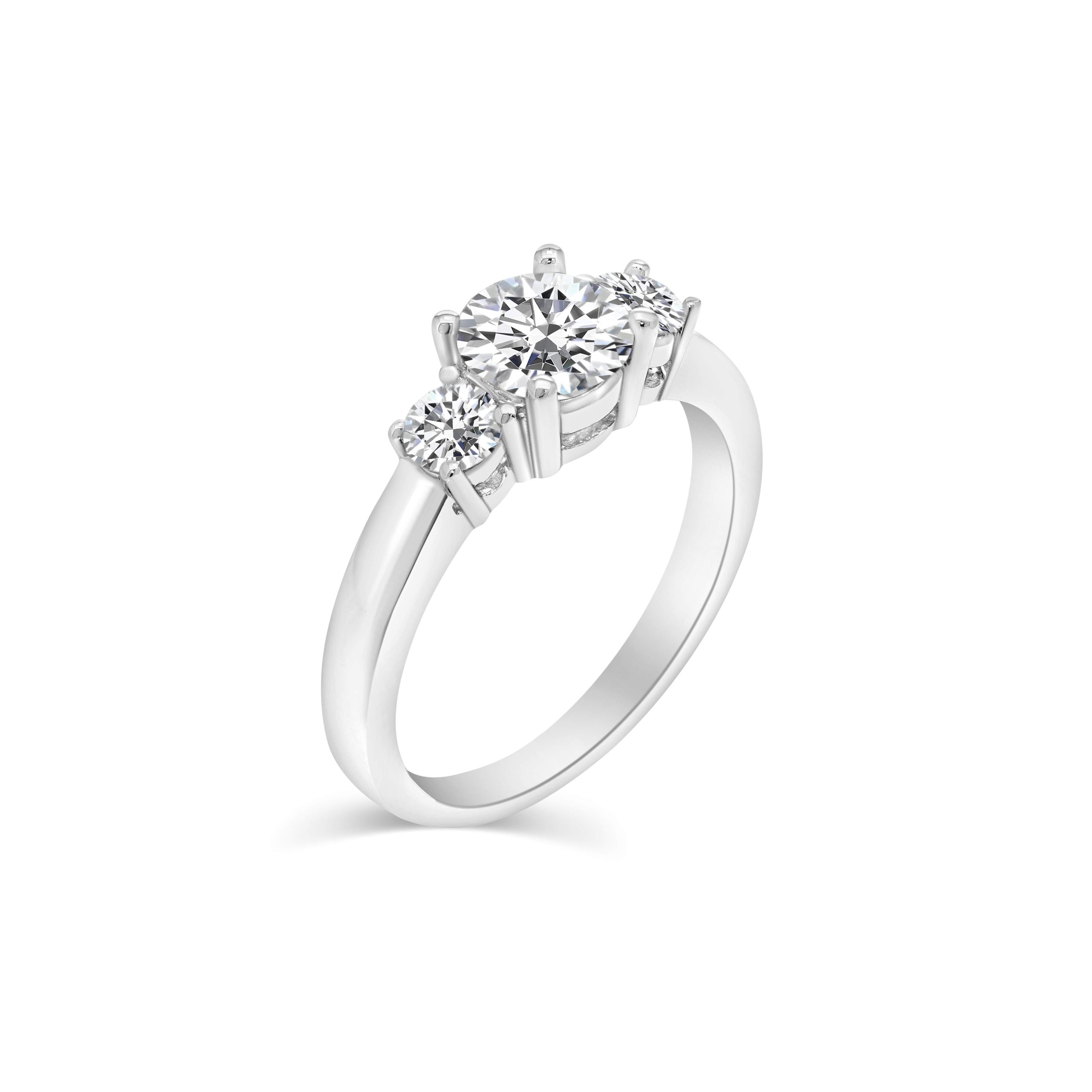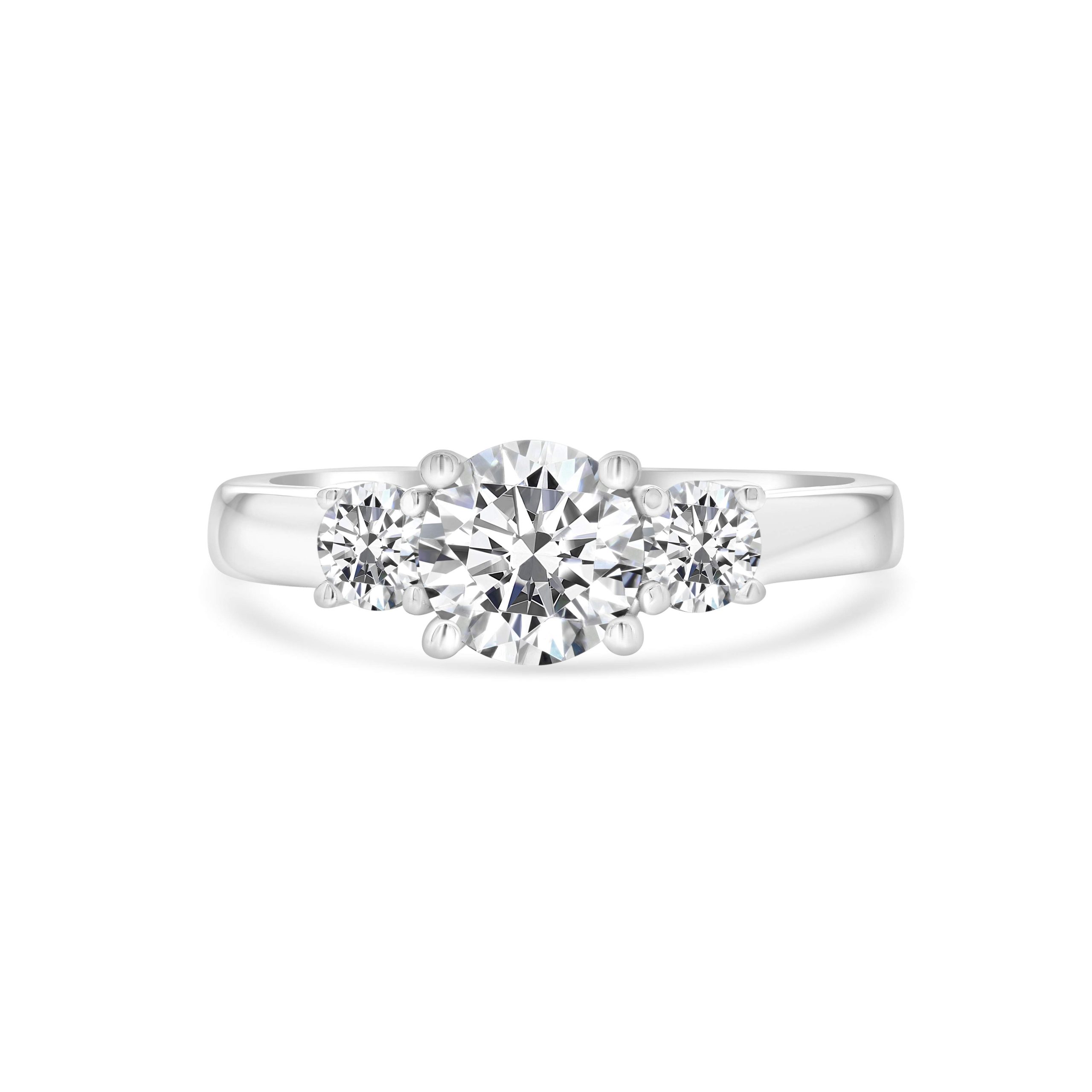 Introducing our timeless 14 karat white gold classic three stone ring, a perfect blend of elegance and sophistication. The centerpiece of this exquisite ring is a dazzling 1.01ct.t round brilliant cut diamond, chosen for its exceptional brilliance and clarity. Flanking this central gem are two additional round brilliant cut diamonds, with a combined weight of .38cts., adding extra sparkle and enhancing the overall allure of the ring. Crafted from luxurious 14 karat white gold, this three stone ring is an enduring symbol of love and commitment, making it an ideal choice for engagements, anniversaries, or any special occasion.