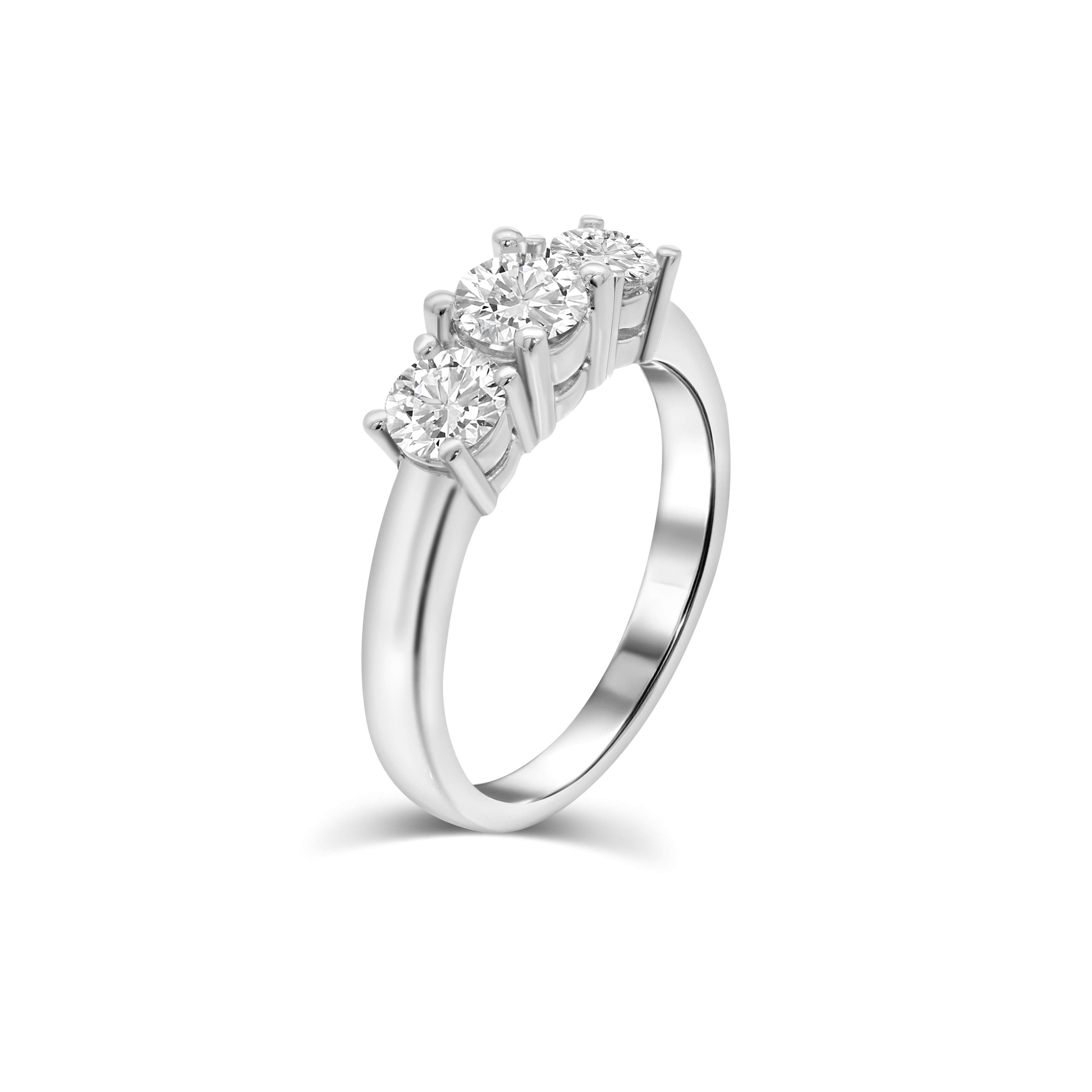 Introducing our exquisite 14 karat white gold three stone diamond ring, a symbol of enduring love and timeless elegance. At its heart lies a stunning .53ct. round brilliant cut diamond, radiating with brilliance and sophistication. Flanking this center stone are dazzling round brilliant cut diamonds, totaling .39ct. each, adding a touch of opulent sparkle and balance to the design. The lustrous white gold setting provides the perfect backdrop, enhancing the brilliance of each diamond. This enchanting ring is a testament to refined craftsmanship and understated luxury, making it the perfect choice to celebrate life’s special moments.