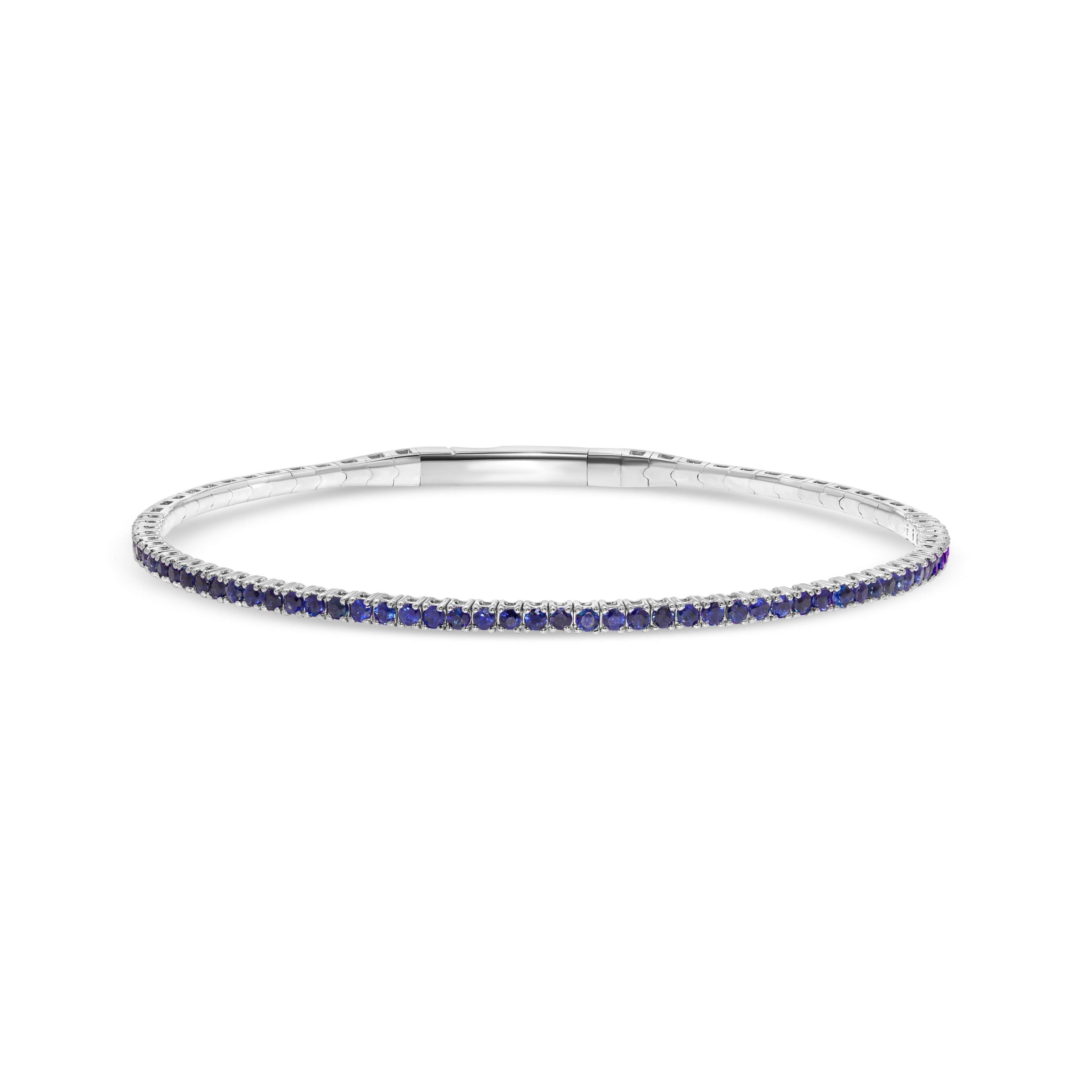 Discover the epitome of elegance with our stunning 14 karat white gold blue sapphire flexible bangle, a mesmerizing blend of sophistication and charm. Crafted to perfection, this exquisite piece features a captivating array of round natural blue sapphires totaling one carat. Each sapphire is meticulously set within the flexible design, allowing for effortless movement and comfort while showcasing the intense blue hues that evoke a sense of timeless allure. The lustrous white gold setting provides the perfect contrast, enhancing the brilliance of each sapphire. Elevate your ensemble with this radiant bangle, a symbol of refined luxury and enduring beauty.