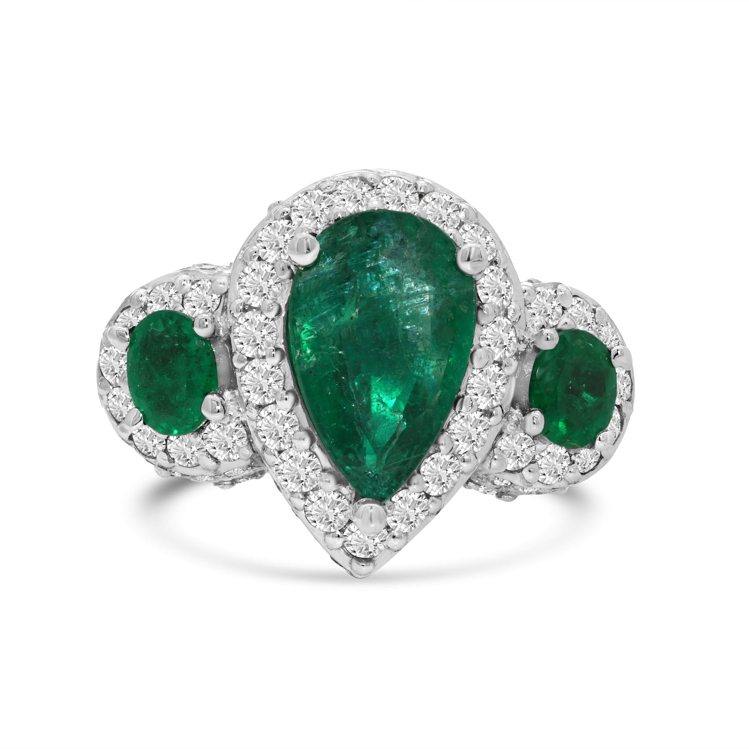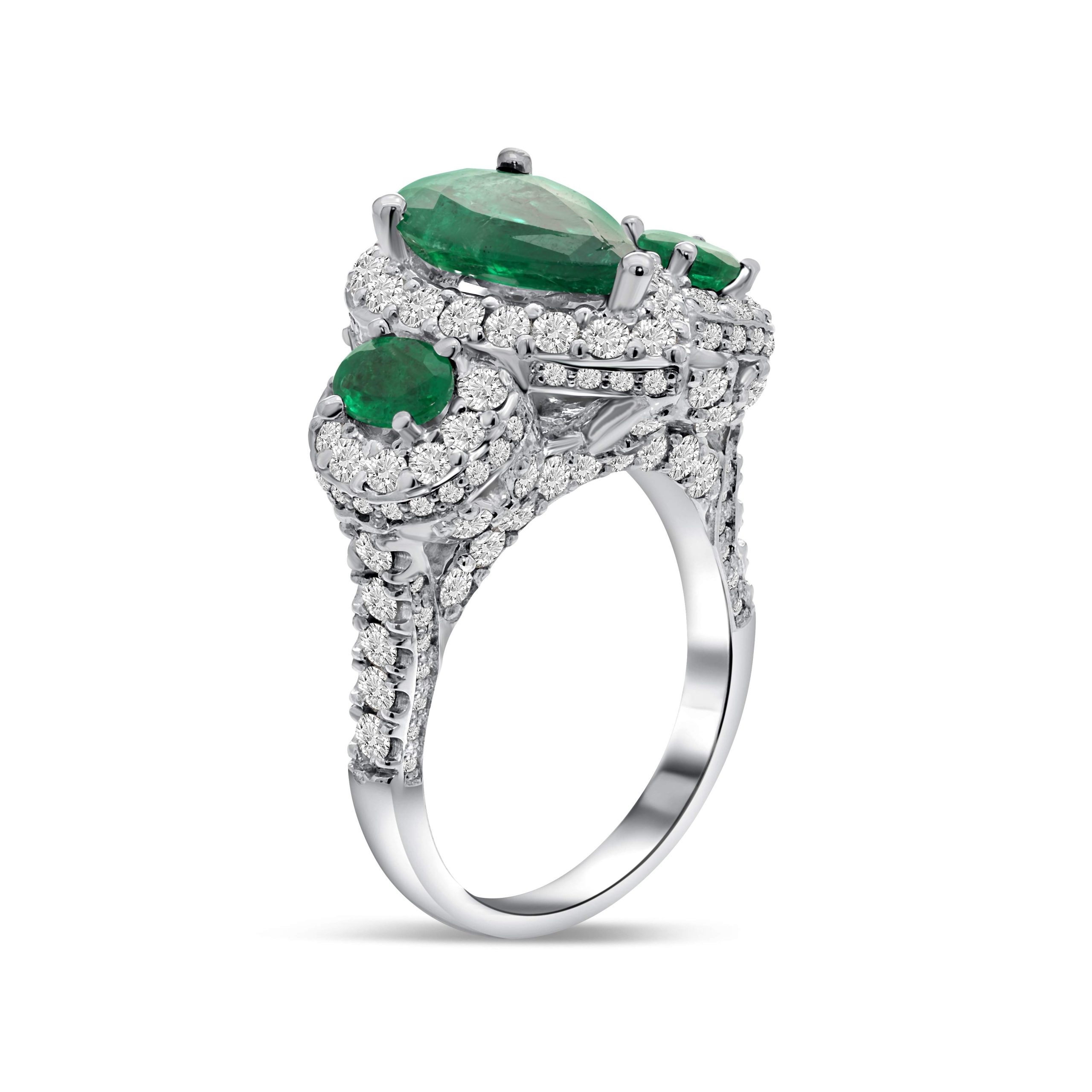 Introducing an exquisite statement piece: our 14 karat white gold three stone emerald and diamond ring. At its heart lies a mesmerizing 1.98ct. pear shaped emerald, flanked by two delicate .29ct. oval shaped emeralds on either side, forming a stunning halo. Surrounding this captivating trio are round brilliant cut diamonds totaling 2.81cts., meticulously set to enhance the allure and brilliance of the emeralds. The harmonious blend of emeralds and diamonds creates a breathtaking symphony of color and sparkle, making this ring a true testament to timeless elegance and sophistication. Embrace the beauty of this exceptional ring, an embodiment of refined craftsmanship and the allure of emeralds and diamonds, destined to grace your hand with unparalleled grace and style.