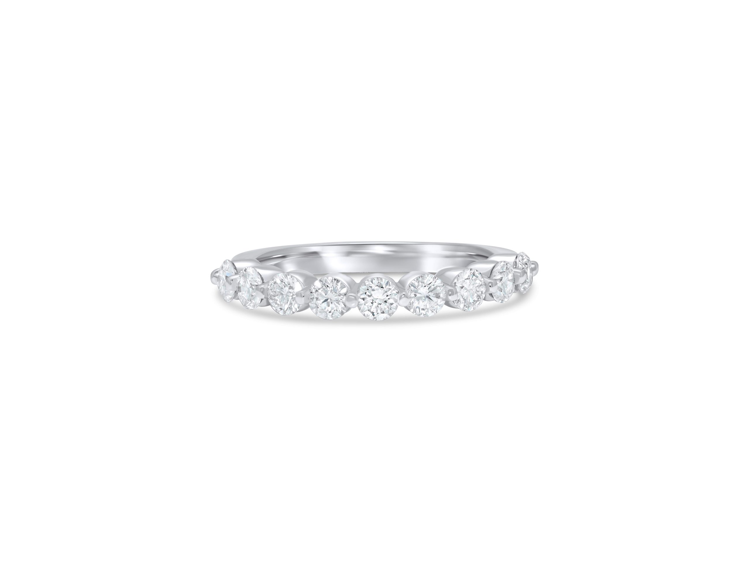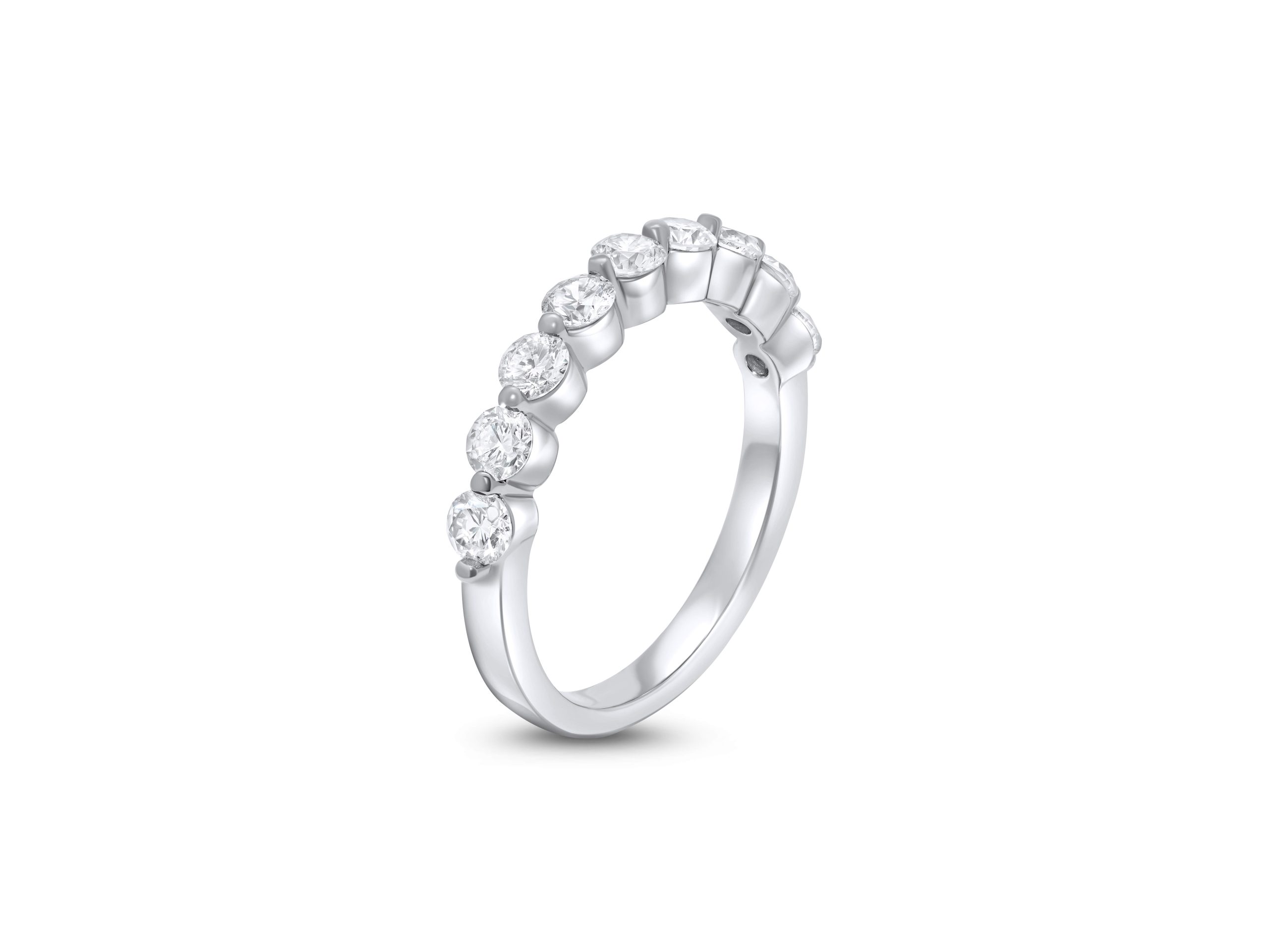 Experience the epitome of elegance with our 14 karat white gold single shared prong diamond band, a graceful and timeless expression of refined beauty. Adorned with 0.99cts. of meticulously set round brilliant cut diamonds, this band exudes understated sophistication and allure. The single shared prong setting delicately cradles each diamond, allowing their brilliance to radiate effortlessly. Whether worn alone for a touch of sophistication or paired with other bands, this piece adds a touch of brilliance to any ensemble, symbolizing eternal love and grace in every facet.
