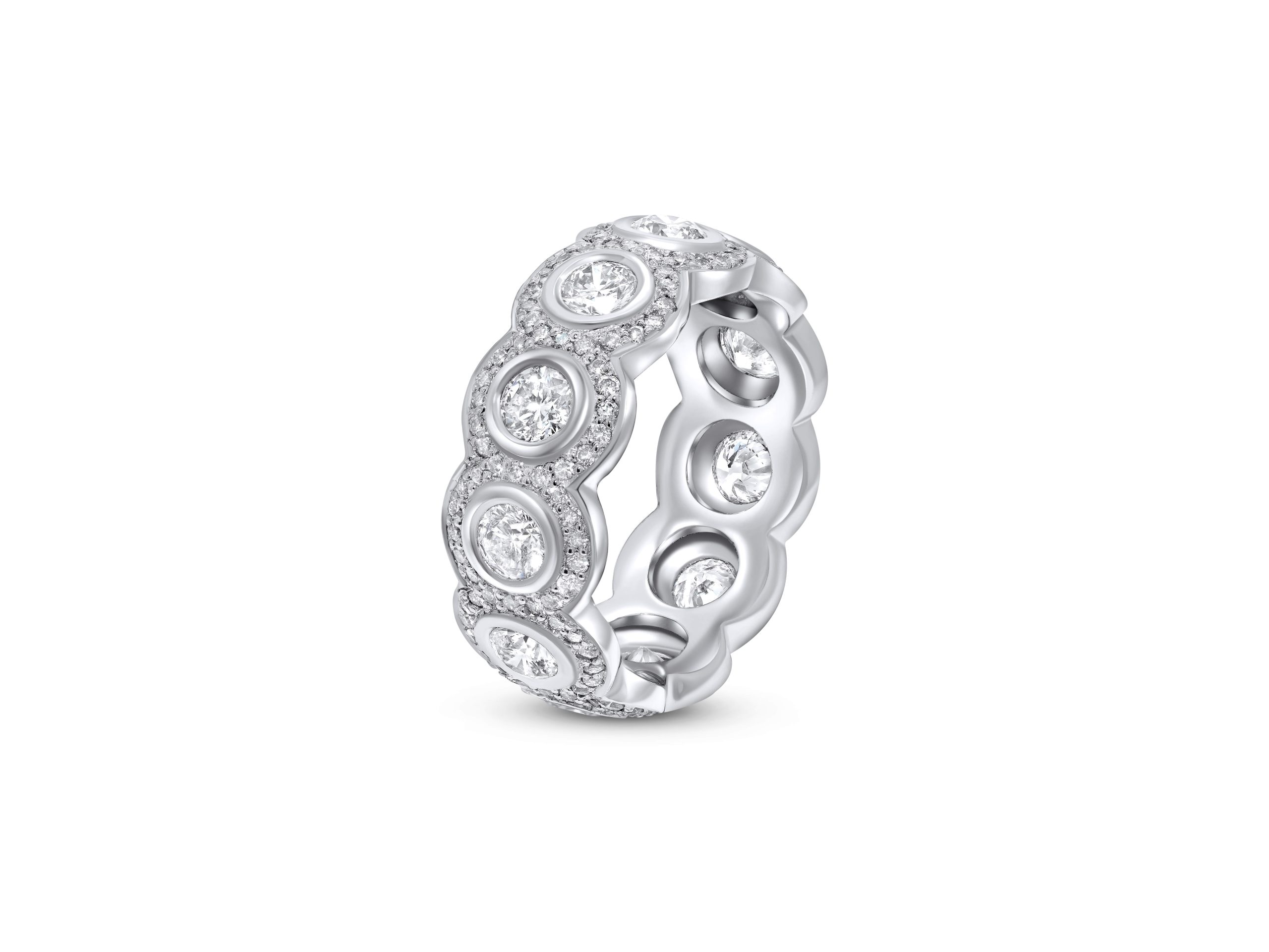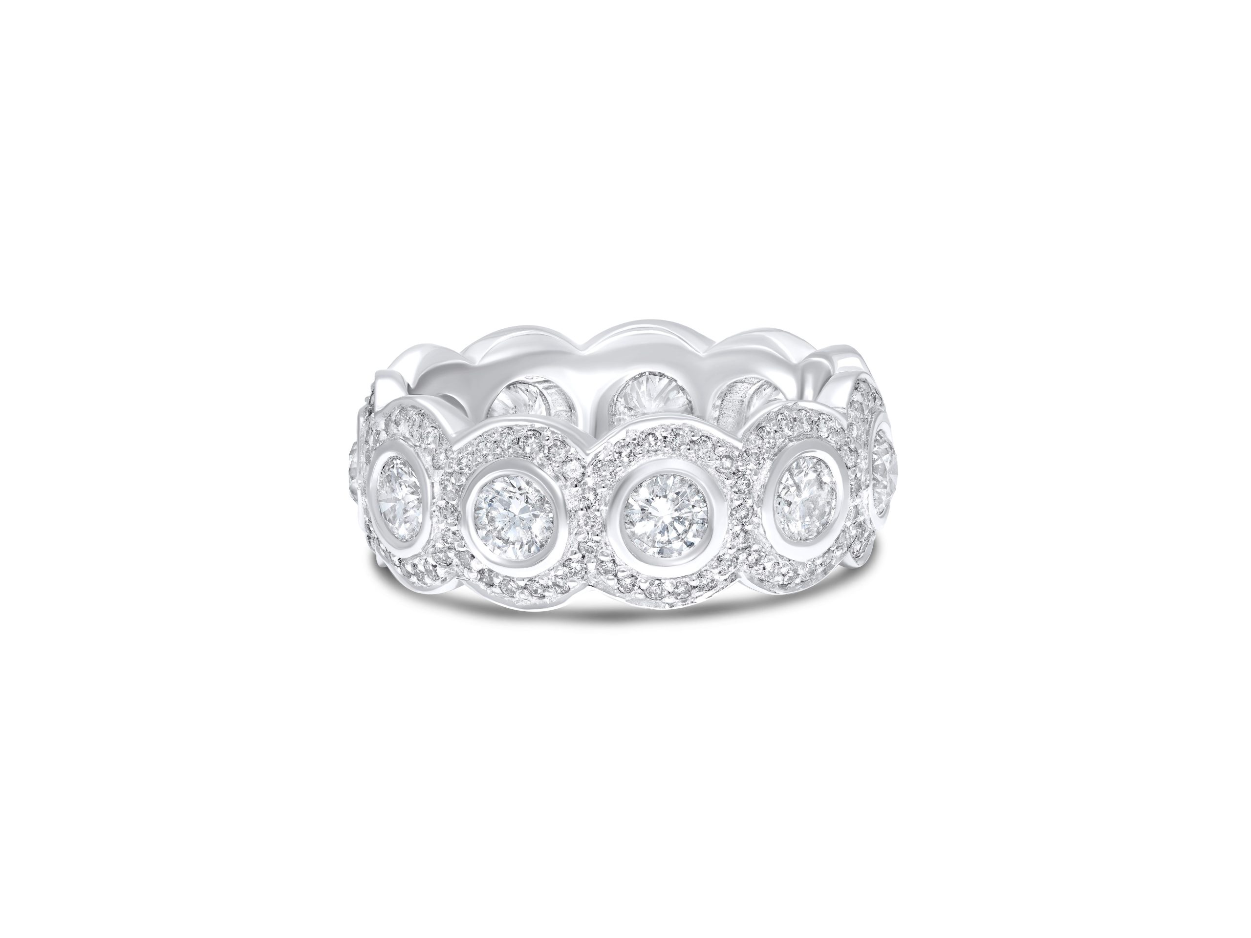 Elevate your style with our stunning 14 karat white gold diamond eternity band. This exquisite piece boasts 1.98cts. of round brilliant cut diamonds, each larger stone elegantly nestled within a sleek bezel and encircled by a halo of shimmering diamonds. A perfect blend of sophistication and glamour, this eternity band offers timeless beauty and unmatched sparkle, making it a mesmerizing statement piece for any occasion.