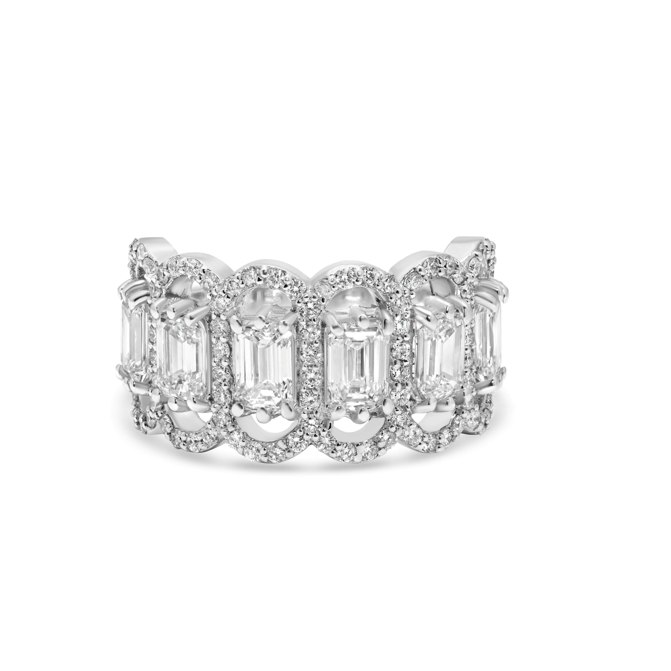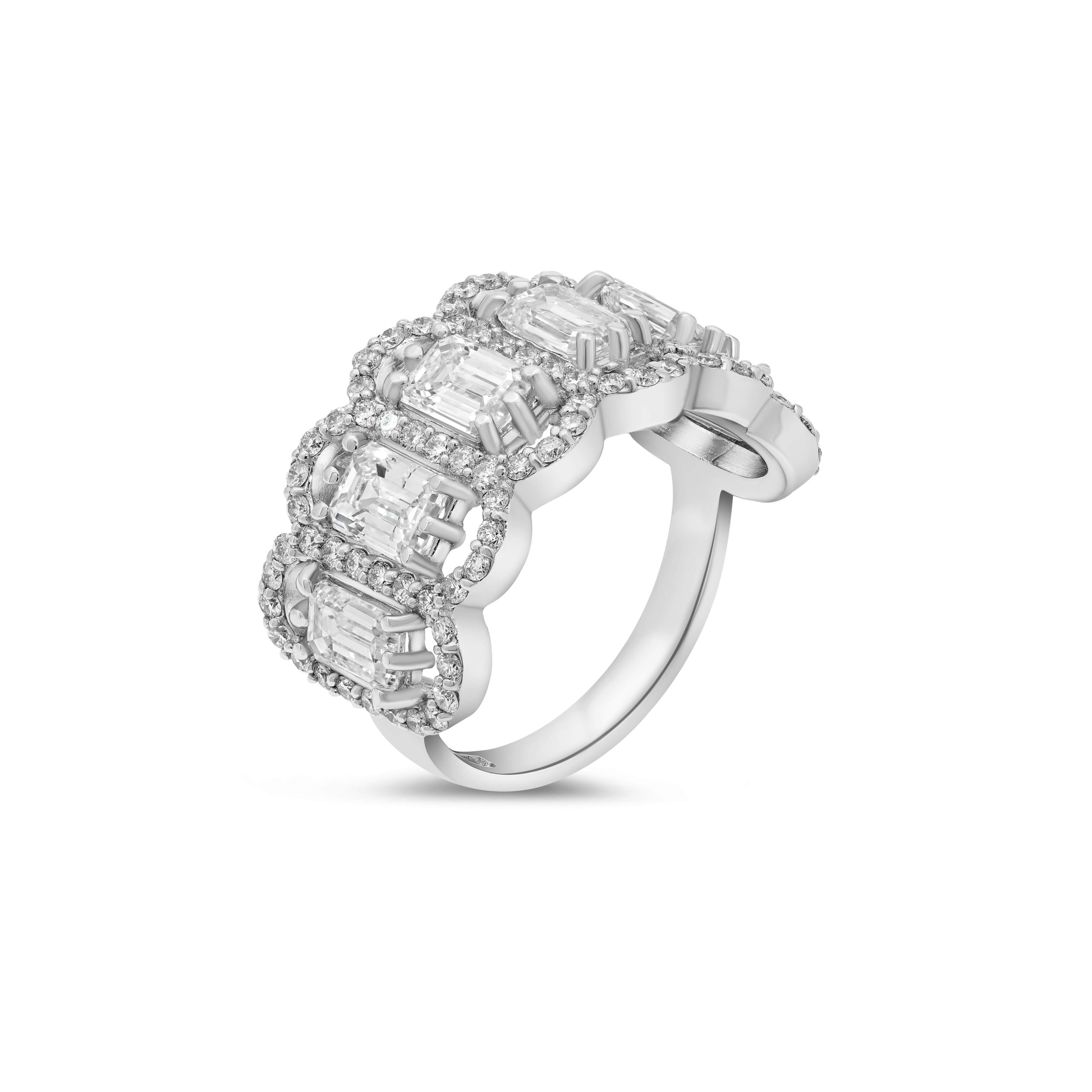 Elevate your elegance with our exquisite 14 Karat White Gold Diamond Cocktail Ring. This masterpiece features a stunning 3.05cts. of emerald cut diamonds, exuding timeless sophistication and charm. A halo of 0.76 carats of round brilliant cut diamonds gracefully surrounds the centerpieces, adding a brilliant, sparkling touch. Designed to make a statement, this luxurious cocktail ring is a true symbol of refinement and allure, perfect for those special moments that deserve a touch of opulence. Explore the epitome of craftsmanship and luxury with this captivating piece, destined to leave a lasting impression.