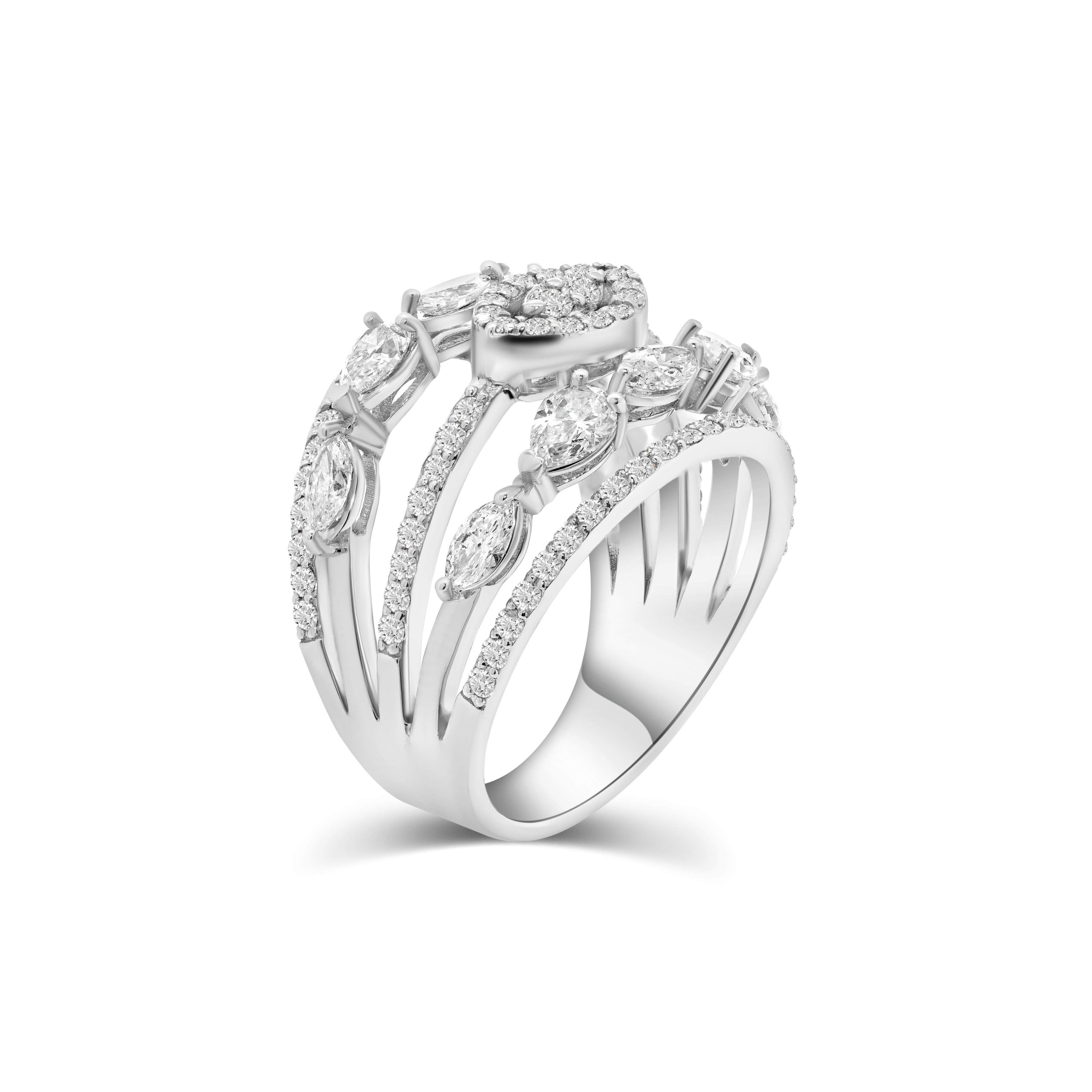 Unveiling our exquisite 14 karat white gold diamond cocktail ring–a stunning, multi-row design that radiates opulence and sophistication. At its heart lies a mesmerizing marquise cut diamond embraced by a halo of scintillating round brilliant cut diamonds, adding a captivating brilliance to the centerpiece.In another row are dazzling marquise cut diamonds totaling 0.65cts., with 0.75cts. of elegant pear shaped diamonds, beautifully accentuating the intricate openness of the ring. Additionally, 0.77cts. of round brilliant cut diamonds adorn this opulent design, creating a luxurious spectacle that exudes timeless elegance and glamour. A testament to craftsmanship and refinement, this cocktail ring is a true embodiment of luxurious style and individuality.