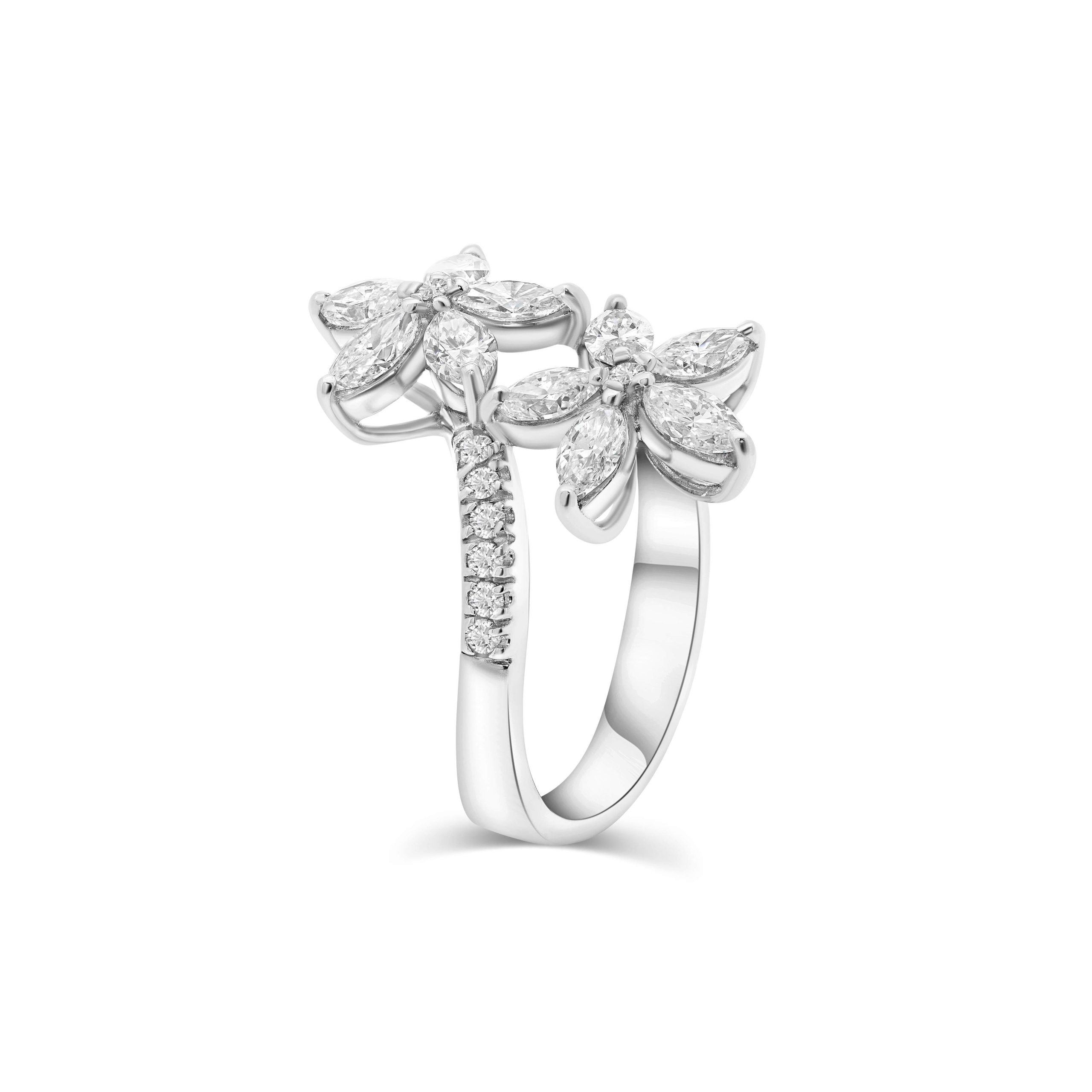 Introducing our captivating 14 karat white gold diamond crisscross cocktail ring, a stellar embodiment of elegance and allure. This mesmerizing ring features 1.59cts. of marquise cut diamonds meticulously arranged in a radiant star like pattern, creating a celestial aura that commands attention.Adding a distinctive touch to its celestial allure, the star inspired design is accentuated by 0.18cts. of stunning round brilliant diamonds, enhancing the ring with a rich and unique contrast. Impeccably crafted to exude sophistication, this ring is a true symbol of brilliance and individuality, making it a standout piece that captivates with its celestial charm and timeless beauty.
