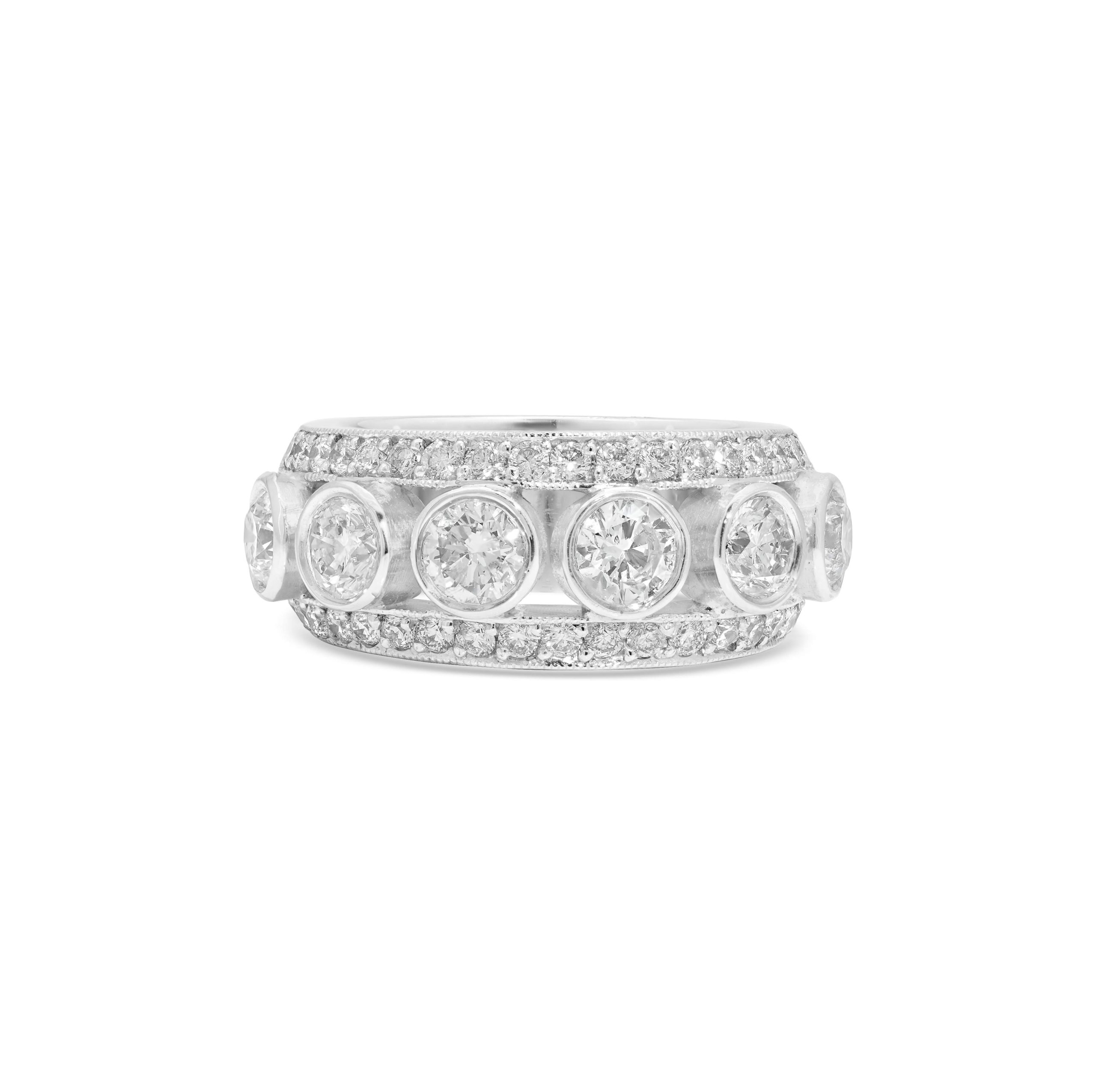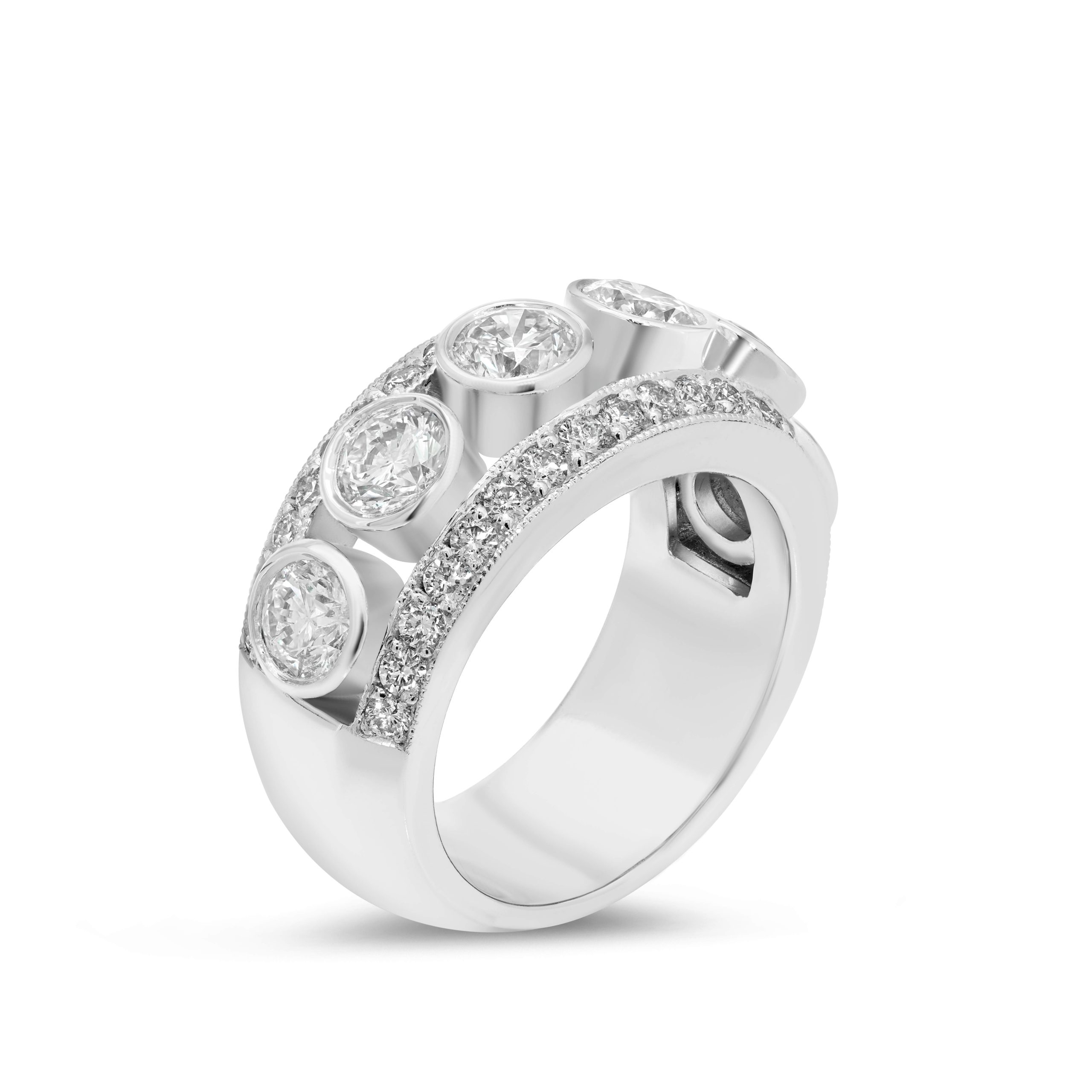 Introducing our exquisite 14 Karat White Gold Cocktail Ring, a true masterpiece of elegance and style. This enchanting piece features a total of 2.55cts. of scintillating round brilliant cut Diamonds, expertly set with meticulous precision. The larger, focal stones in the center are tastefully cradled within the luxurious embrace of bezel settings, adding an extra touch of sophistication to this radiant accessory. Elevate your presence and capture attention with this dazzling creation that effortlessly combines classic charm and modern allure.