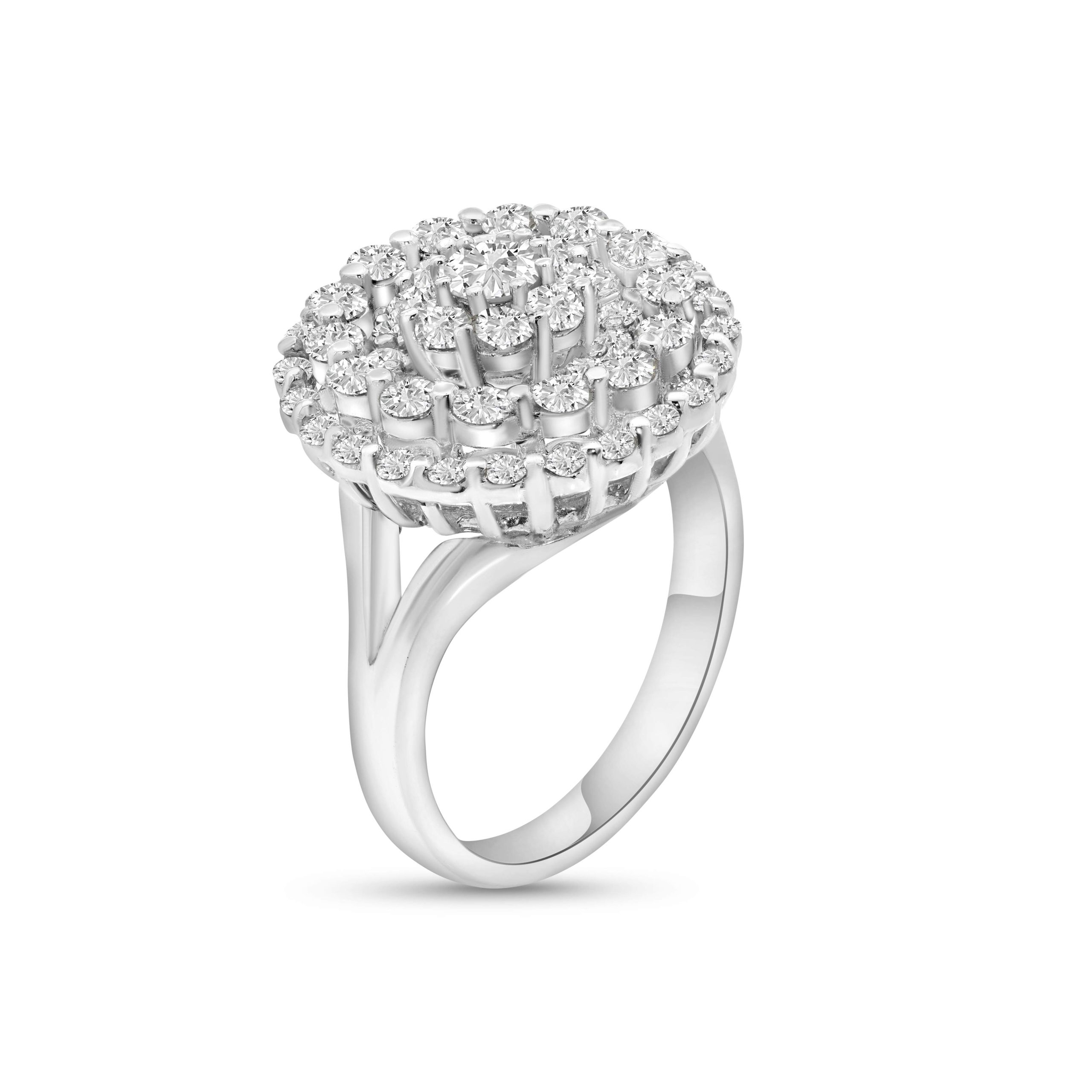 Indulge in sophistication with our captivating 14 karat white gold diamond cocktail ring, showcasing a stunning array of 1.81cts. of round brilliant cut diamonds. The elegant design and meticulous craftsmanship of this ring exude timeless beauty and charm. Each diamond is intricately set to create a mesmerizing sparkle, making this ring a statement piece that adds an air of refined luxury to any occasion. Elevate your style and make a bold statement with this breathtaking diamond-adorned cocktail ring.