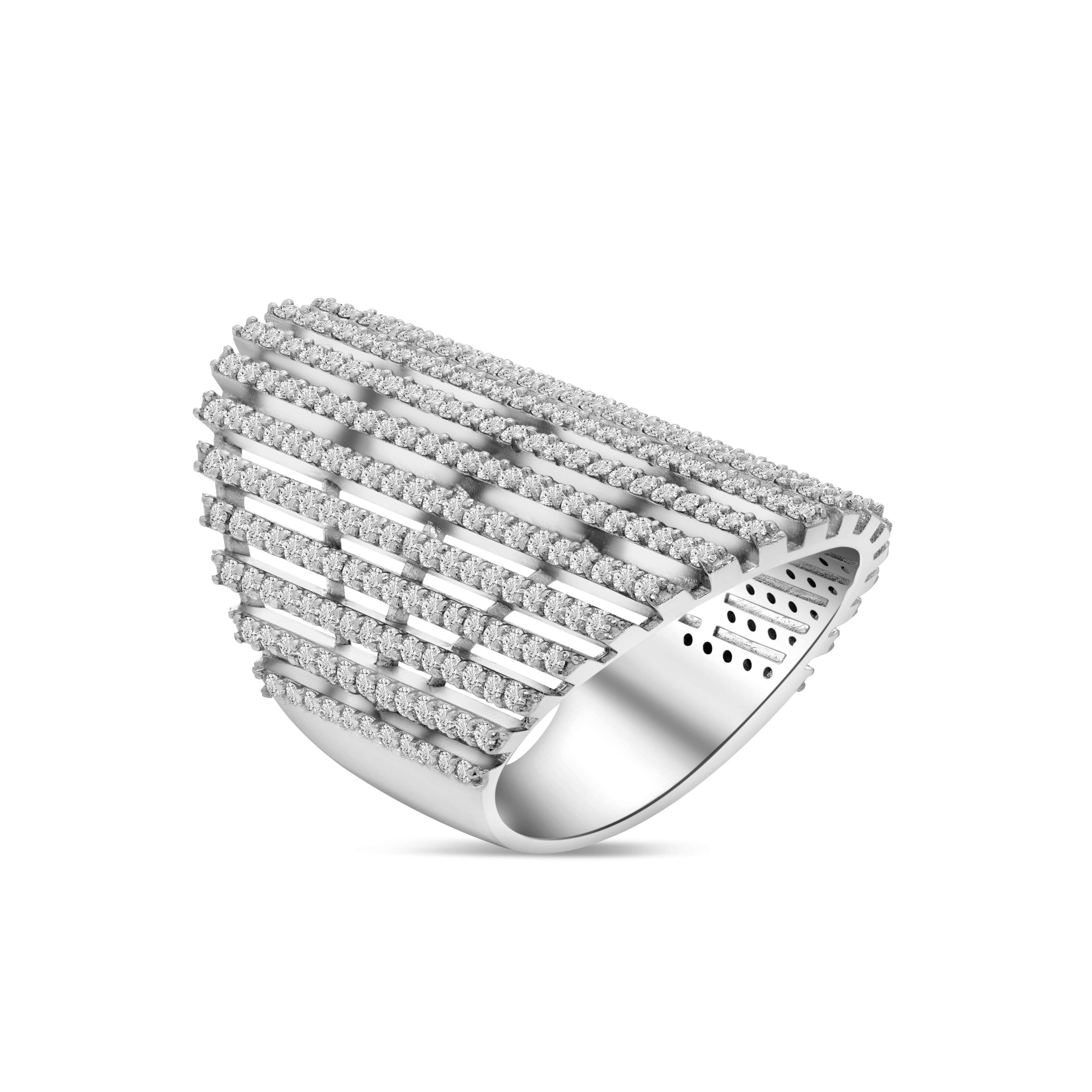 Welcome to a world of unparalleled allure and sophistication with our 14 karat white gold diamond cocktail ring. This captivating piece boasts a staggering 3.24cts. of round brilliant cut diamonds, meticulously set in long rows, creating a mesmerizing display of warmth and elegance. The unique allure of round diamonds, set against the backdrop of lustrous white gold, makes this ring a true statement piece. Its contemporary design coupled with the timeless appeal of diamonds creates a harmonious fusion of modernity and classic charm. Elevate your style with this exceptional ring, an embodiment of individuality and refined elegance that is sure to captivate all admirers.