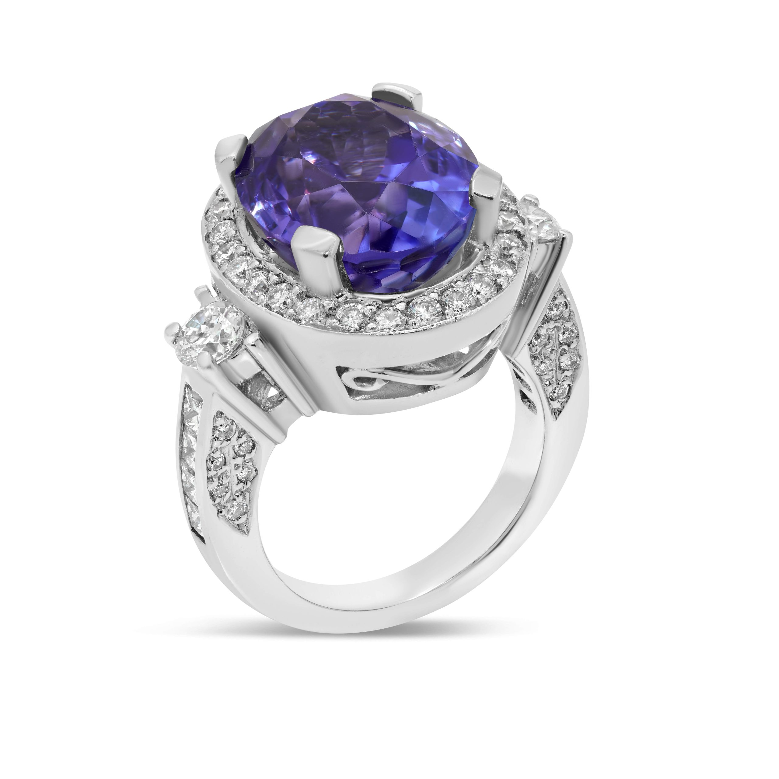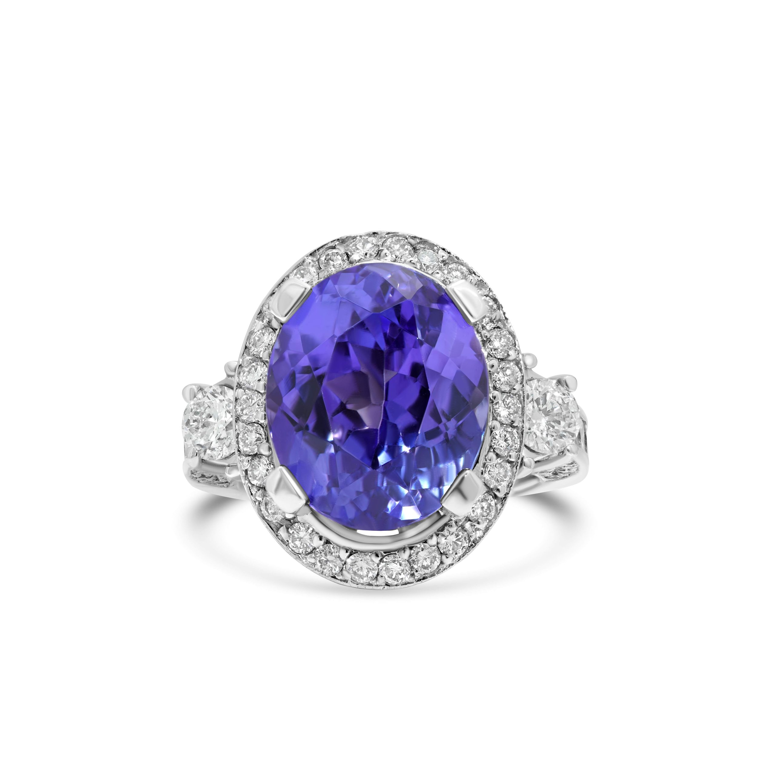 Introducing our 14 Karat White Gold Diamond and Tanzanite Ring, a captivating masterpiece that effortlessly blends the beauty of diamonds with the enchanting allure of a 13.98 carat oval Tanzanite. This stunning ring is adorned with a total of 0.59cts. of princess cut diamonds and 1.50cts. of round brilliant cut diamonds, adding layers of brilliance and elegance. The focal point of this ring is the mesmerizing oval Tanzanite, carefully set in the center. Its deep blue-purple hue and remarkable size make it a true showstopper. The surrounding diamonds accentuate the Tanzanite’s natural beauty, creating a harmonious combination of sparkle and color. Crafted with precision and artistry, this ring is a testament to luxury and timeless design. Whether it’s a symbol of your love, a statement piece for a special occasion, or a cherished addition to your jewelry collection, this diamond and Tanzanite ring is a true expression of refined taste and enduring glamour.
