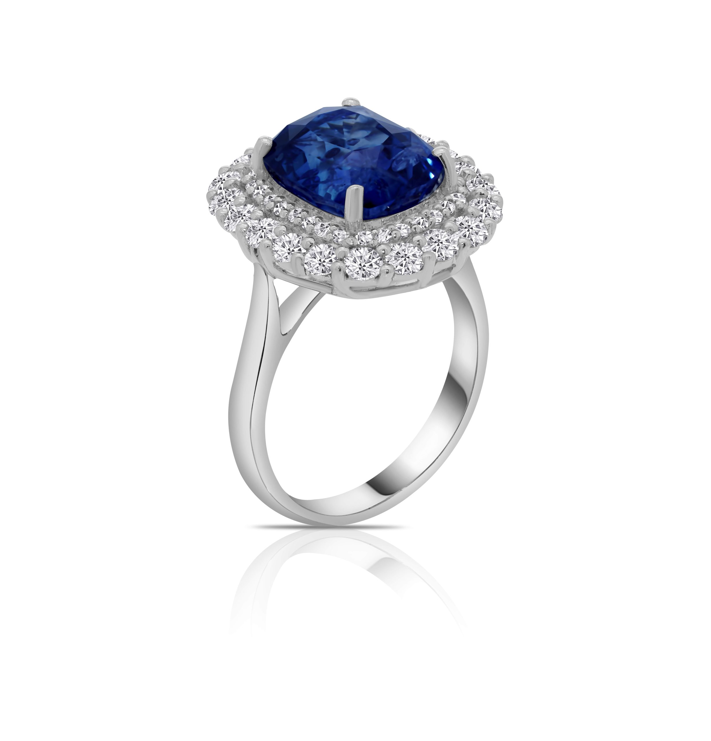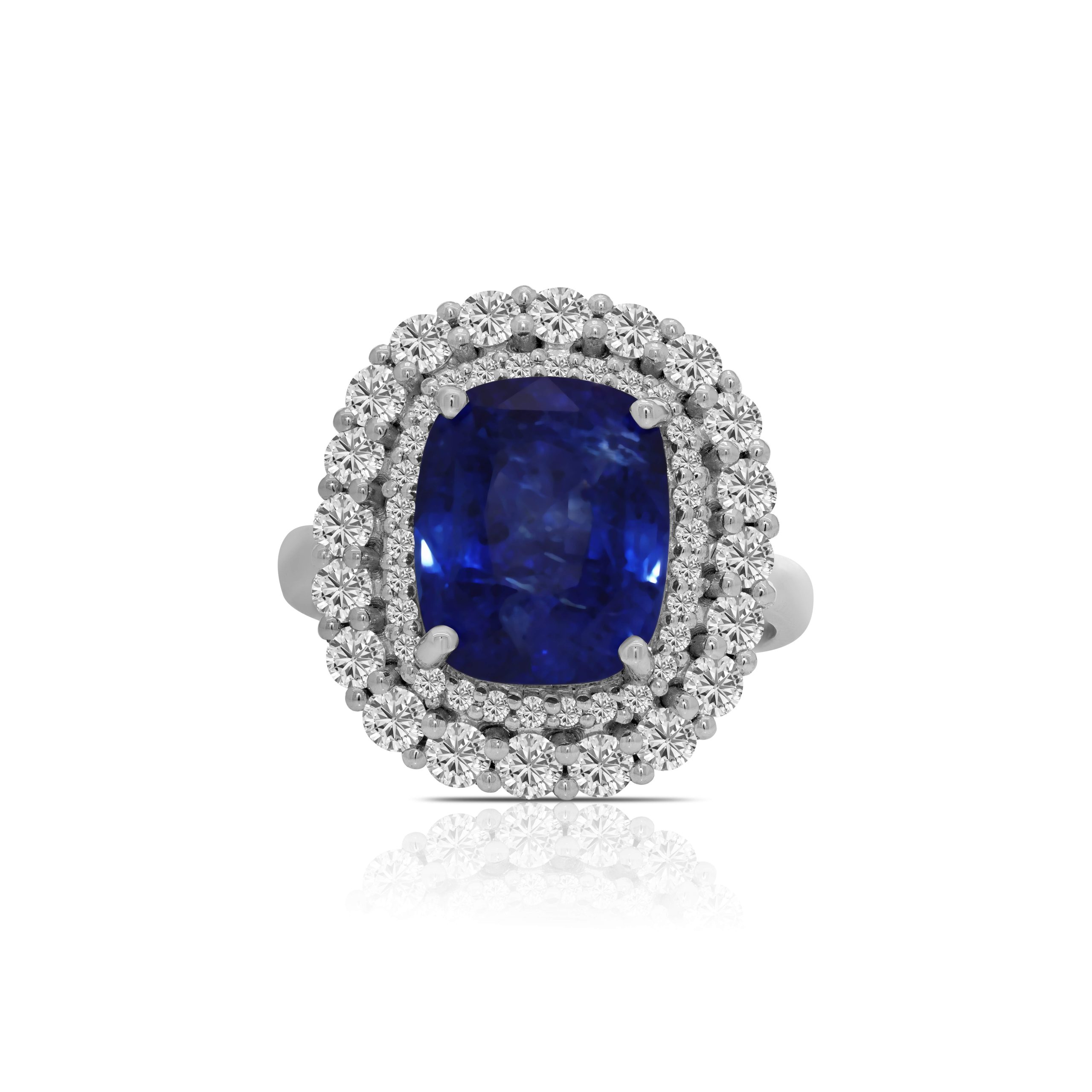 Discover the epitome of elegance with our 14 karat white gold colored stone ring, featuring a mesmerizing 6.49ct. blue sapphire at its heart. This exceptional gem, certified by the Gemological Institute of America (GIA), exudes a deep, enchanting blue hue that captivates all who behold it. Surrounding this magnificent sapphire, you’ll find two halos of 1.13cts. of round brilliant cut diamonds, meticulously set in a prong setting. The rich round diamonds create a striking contrast with the sapphire, enhancing its brilliance and beauty. This ring is a true masterpiece, perfect for marking significant moments or as a remarkable addition to your jewelry collection. Explore the allure of this extraordinary creation today and make it a cherished symbol of your impeccable taste and appreciation for fine jewelry.