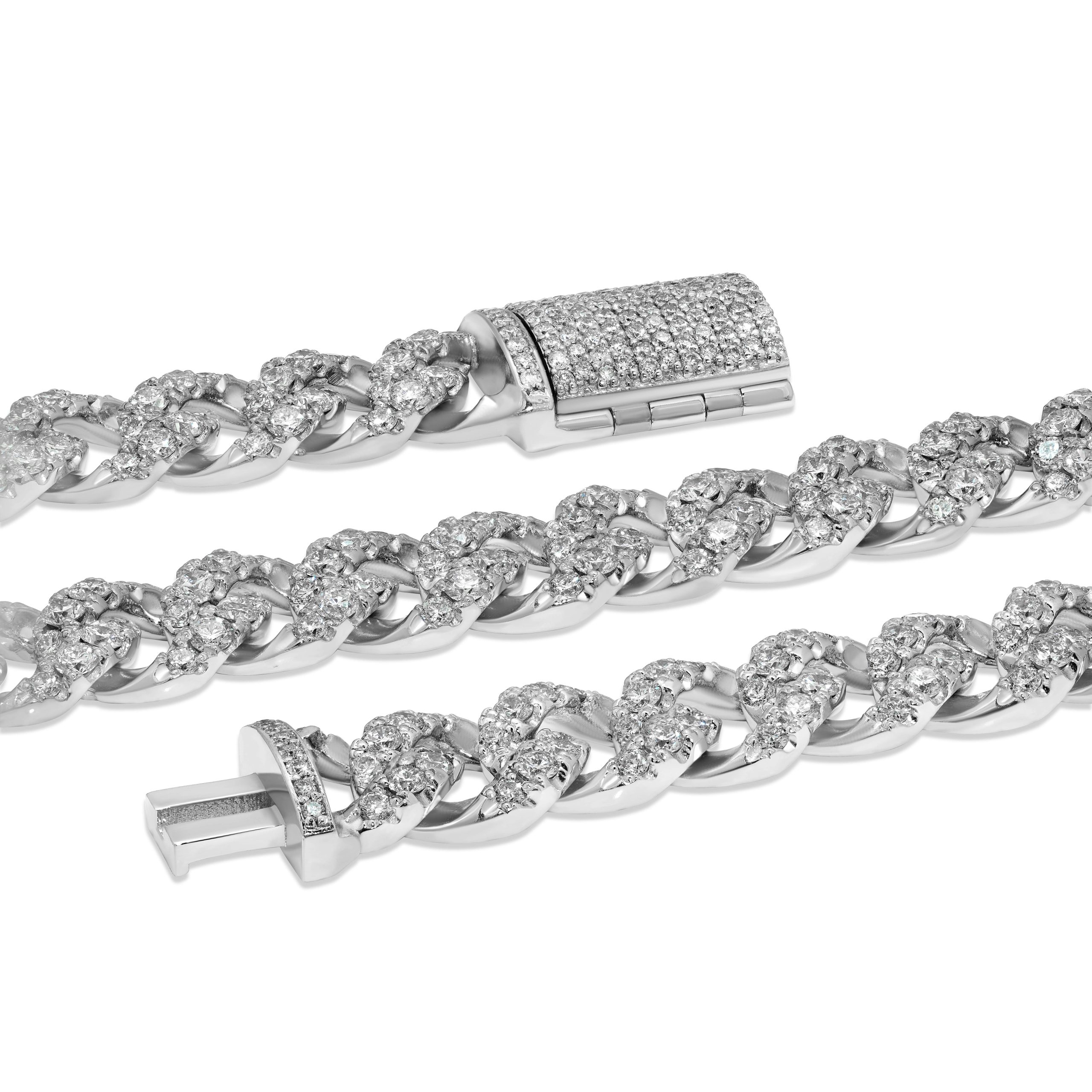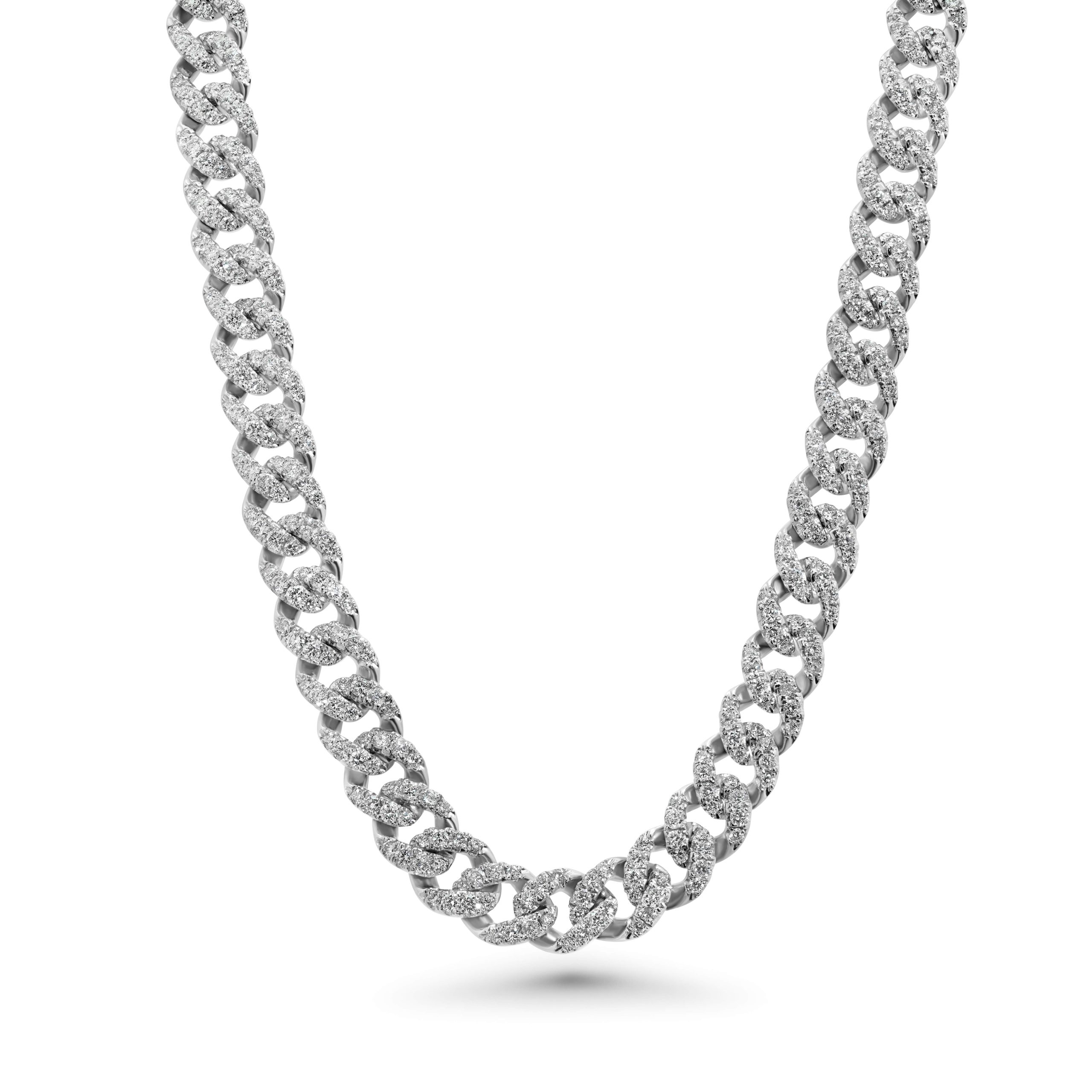 Introducing our 14 karat white gold Cuban necklace, a beacon of luxury adorned with an impressive 16.94cts. of round brilliant cut diamonds. Immerse yourself in the allure of this breathtaking piece, where classic design meets contemporary elegance. Crafted with precision and sophistication, this diamond-studded necklace is a testament to refined taste and timeless beauty. Elevate your style with the shimmering radiance of this exquisite 14 karat white gold diamond Cuban necklace, a statement accessory that transcends trends and captivates with every sparkle.