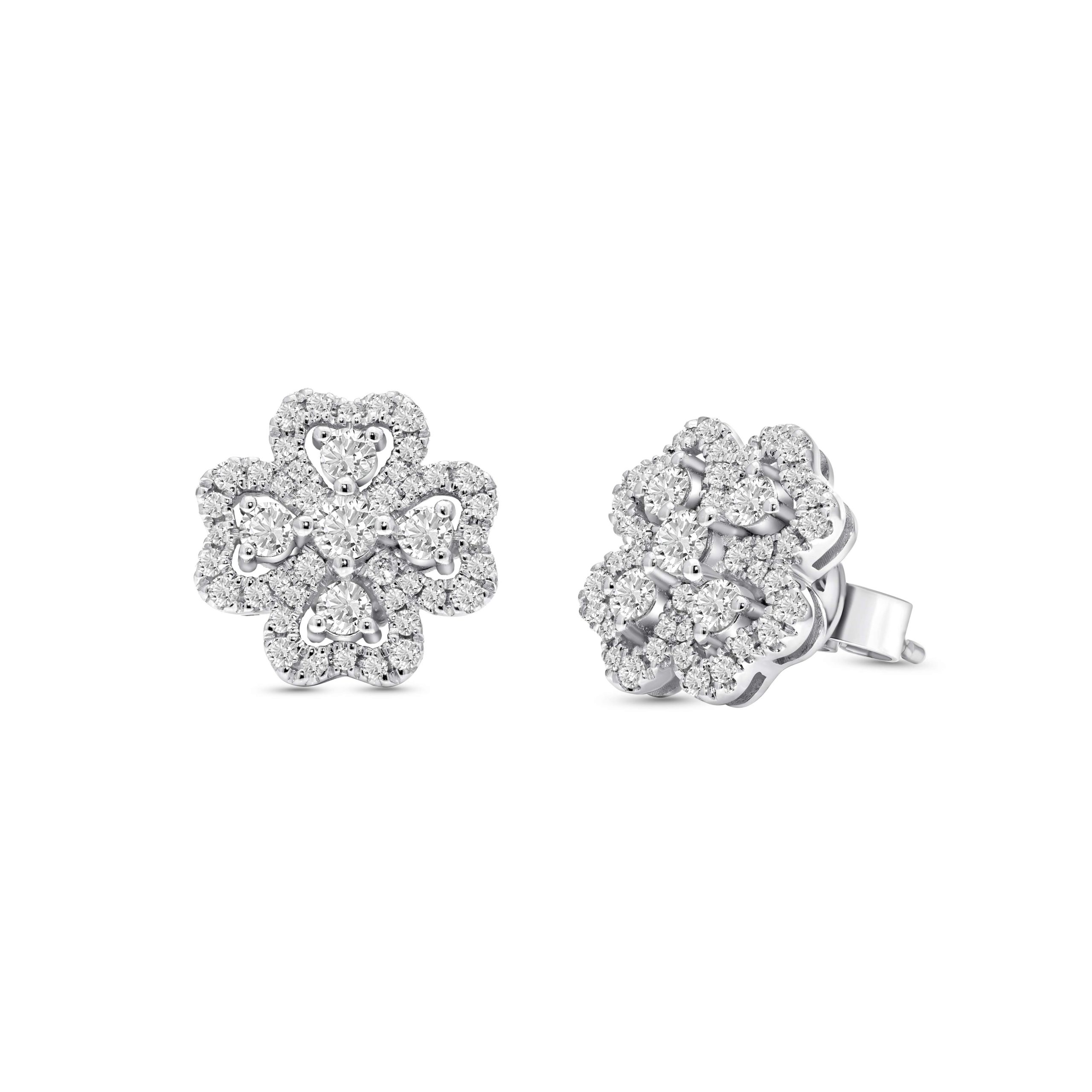 Embrace the blooming elegance with our pair of 14 karat white gold diamond floral inspired cluster earrings. This pair features a captivating display of 0.76cts. of round brilliant cut diamonds, intricately arranged in a mesmerizing floral cluster design. The delicate white gold setting accentuates the brilliance of the diamonds, creating an enchanting sparkle reminiscent of a blossoming flower. Elevate your look with these stunning earrings, a perfect fusion of nature-inspired beauty and refined luxury, ideal for adding a touch of sophistication to any ensemble.