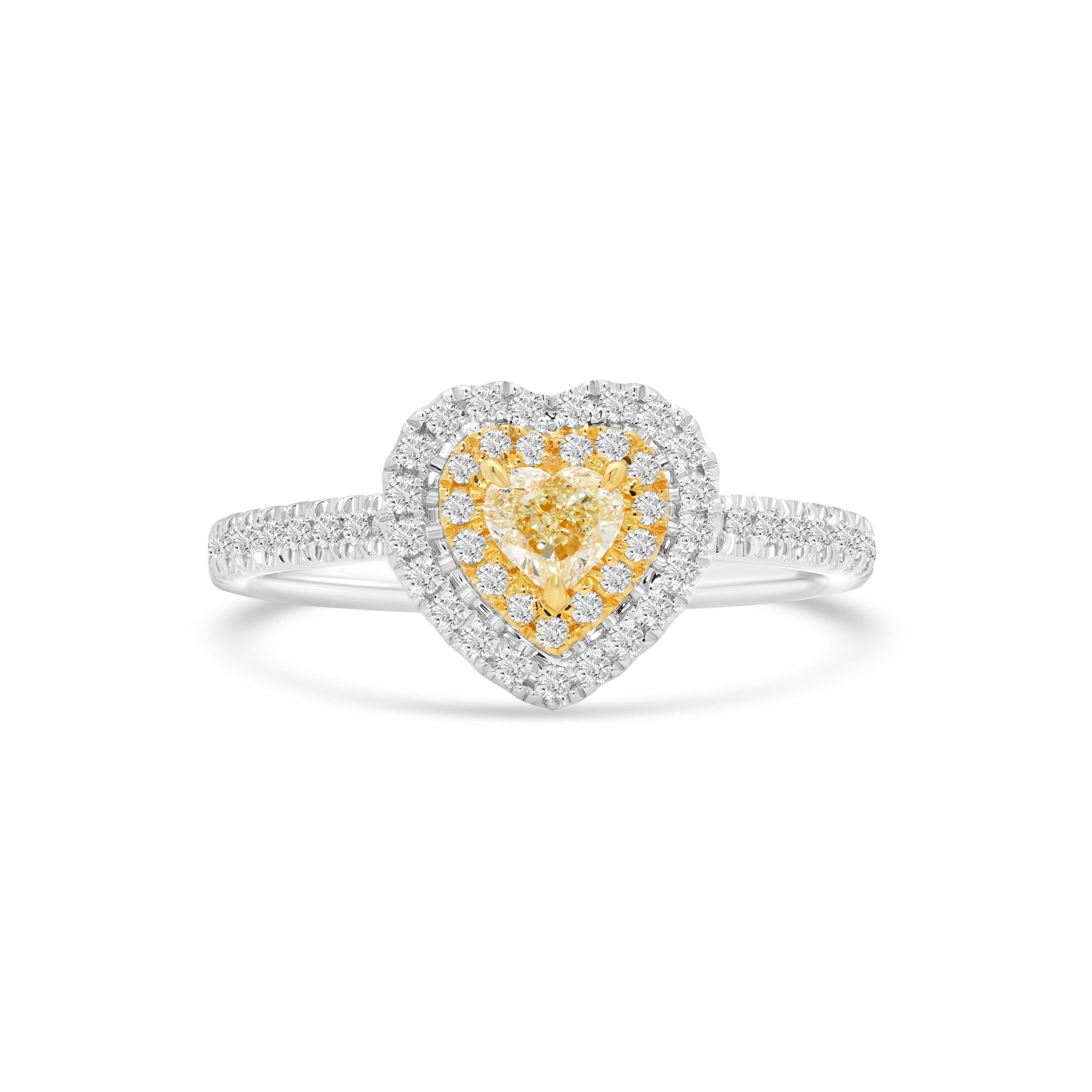 Embrace romance and sophistication with our stunning 14 karat white gold ring, featuring a mesmerizing .28ct. fancy yellow heart shaped diamond at its heart, delicately encircled by a double halo. The first halo sparkles with .06 carats of radiant fancy yellow diamonds, while the second halo and shank are adorned with .22cts. of scintillating white diamonds, creating a captivating contrast that amplifies the allure of this elegant piece. This ring is an exquisite celebration of love and refined taste."