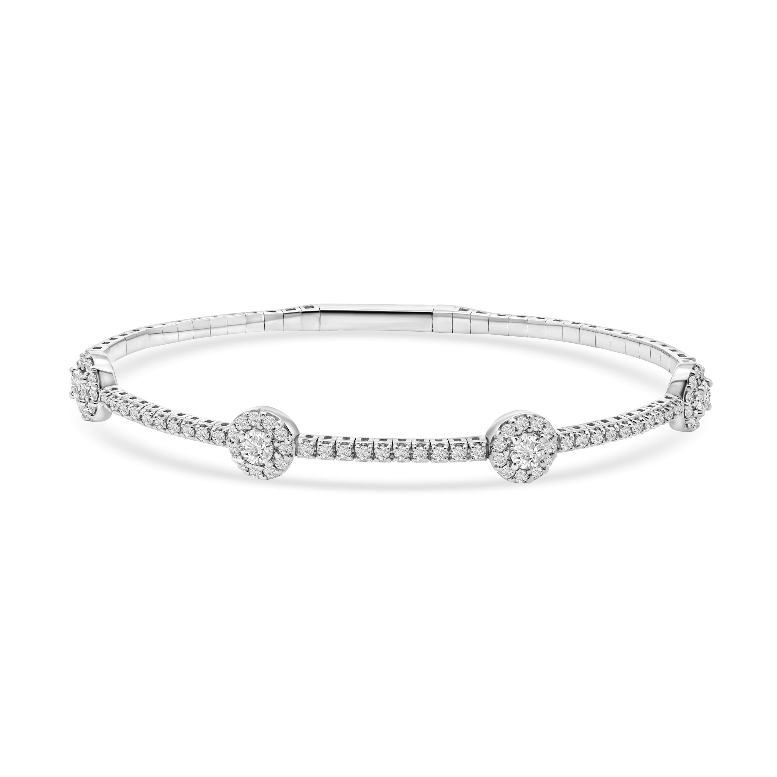 Explore elegance with our 14 karat white gold diamond flexible bangle, adorned with 1.44cts. of round brilliant cut diamonds. This single-row masterpiece features four captivating clusters, combining sophistication and sparkle in a timeless design. Elevate your style with this exquisite piece that seamlessly blends luxury and craftsmanship.