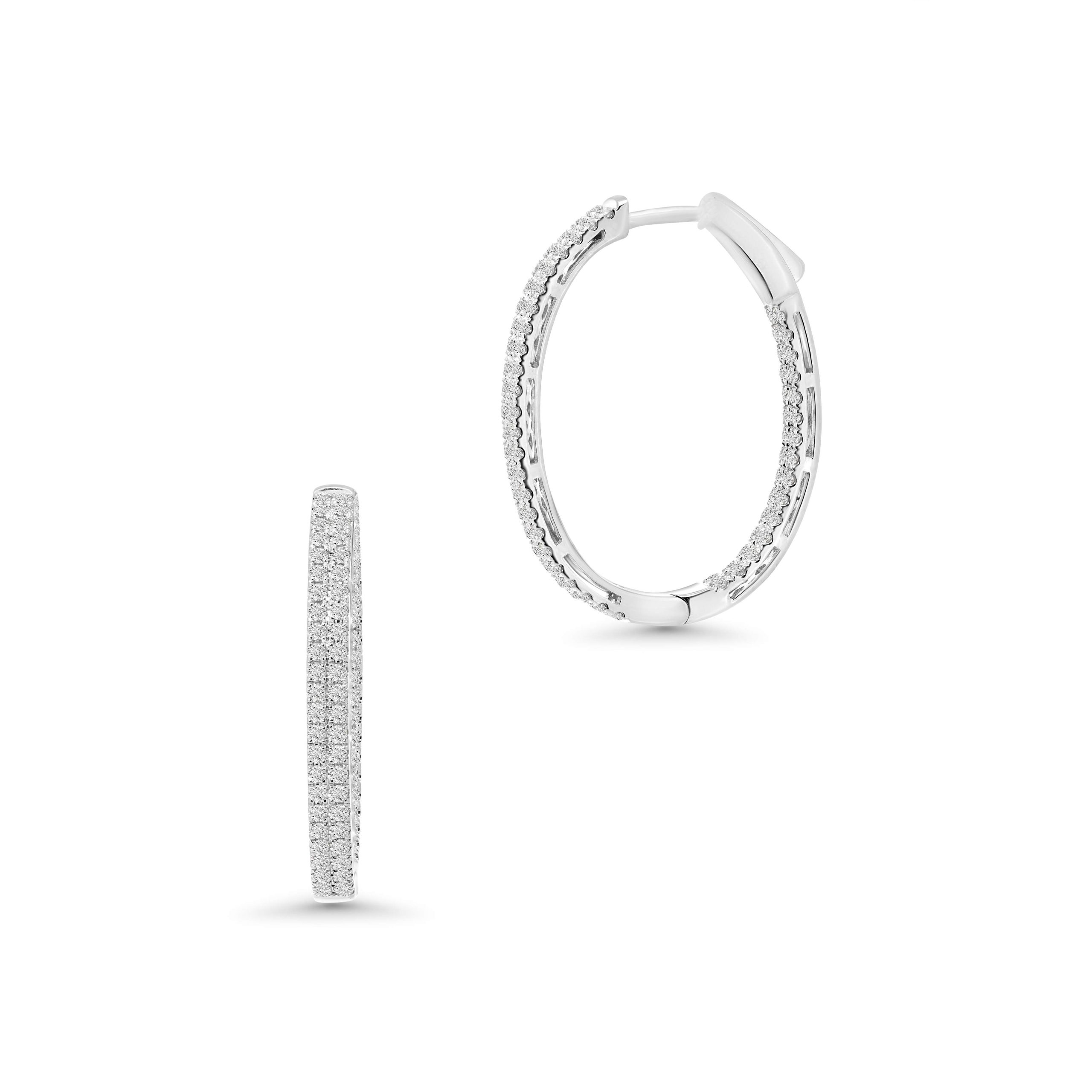 Indulge in elegance with our exquisite inside-outside diamond hoop earrings, a captivating embodiment of sophistication. Crafted to perfection, these hoops boast a total of 1.36cts. of round brilliant cut diamonds, meticulously set both on the inside and outside for an uninterrupted display of brilliance.Designed for both beauty and security, these earrings feature a safety lock, ensuring peace of mind while showcasing these dazzling diamonds. Effortlessly versatile and undeniably luxurious, these earrings are the perfect accessory to complement any outfit, radiating timeless charm and refined glamour.