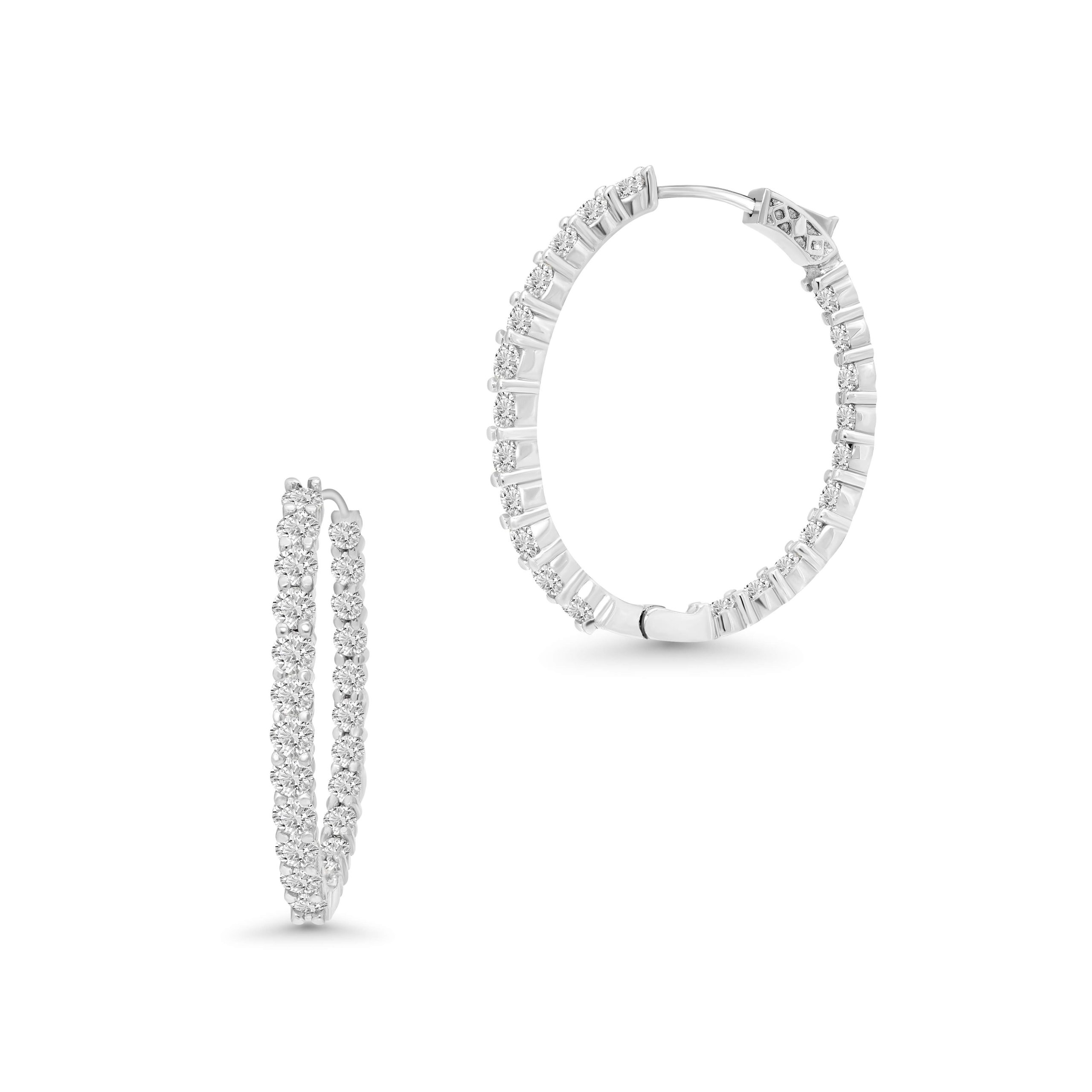 Adorn yourself in luxury with our mesmerizing pair of 14 karat white gold diamond inside-out hoops. Each hoop is meticulously crafted with a shared prong setting, showcasing a total weight of 5.36cts. of scintillating round brilliant cut diamonds. Radiating elegance from every angle, these hoops elevate any look with timeless sophistication. For added peace of mind, they feature a secure safety lock for enhanced security. Elevate your style effortlessly with these dazzling diamond hoops.