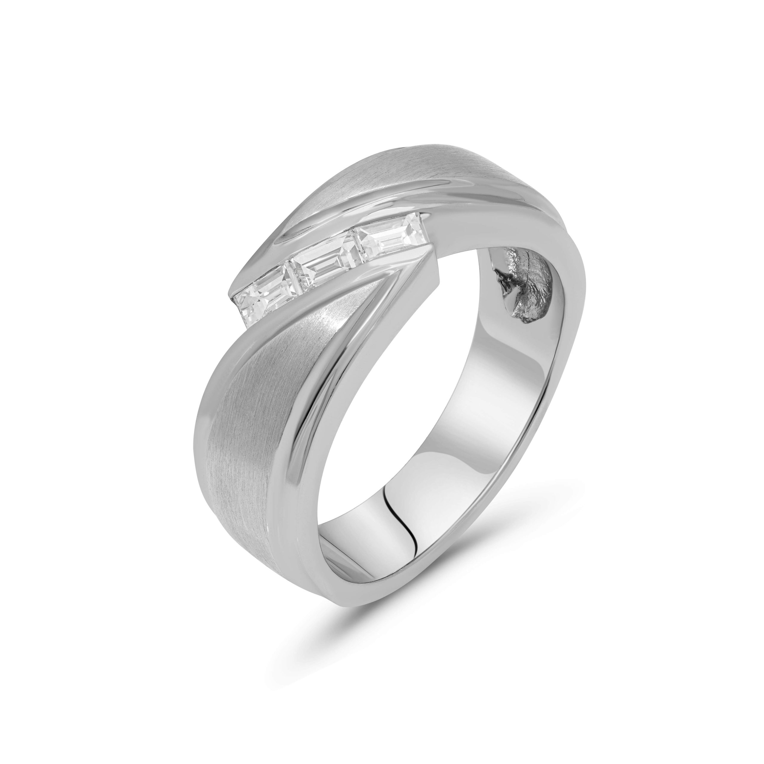 Presenting our distinguished 14 karat white gold diamond men’s ring, an embodiment of modern sophistication and timeless elegance. This ring features three exquisite baguette diamonds, totaling 0.42cts., meticulously set on an angle to create a striking visual appeal. The ring’s band boasts a unique combination of brushed and high polished finishes, offering a refined contrast that enhances its contemporary design. Perfect for the discerning gentleman, this diamond ring is a statement piece that exudes confidence and style.