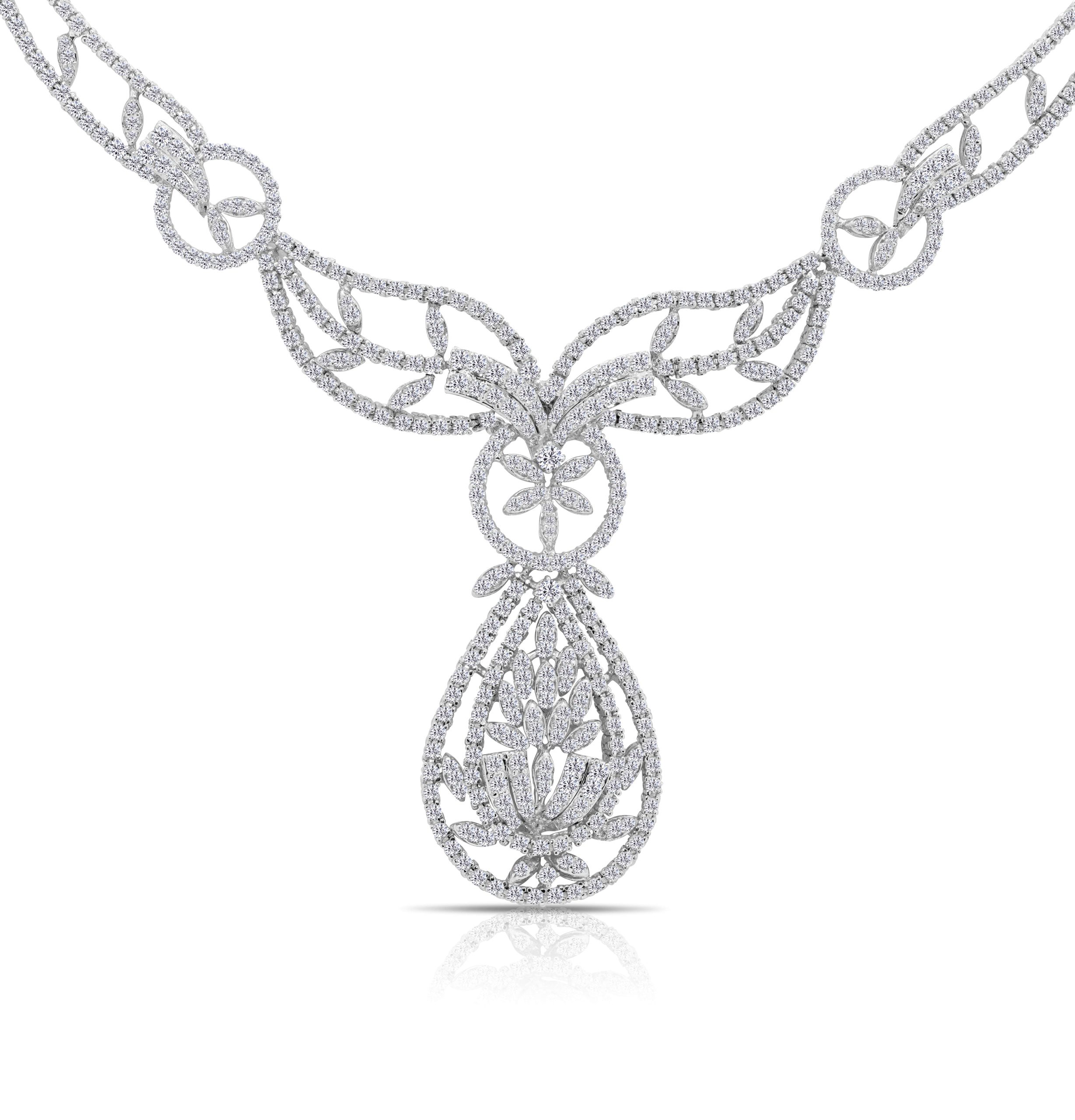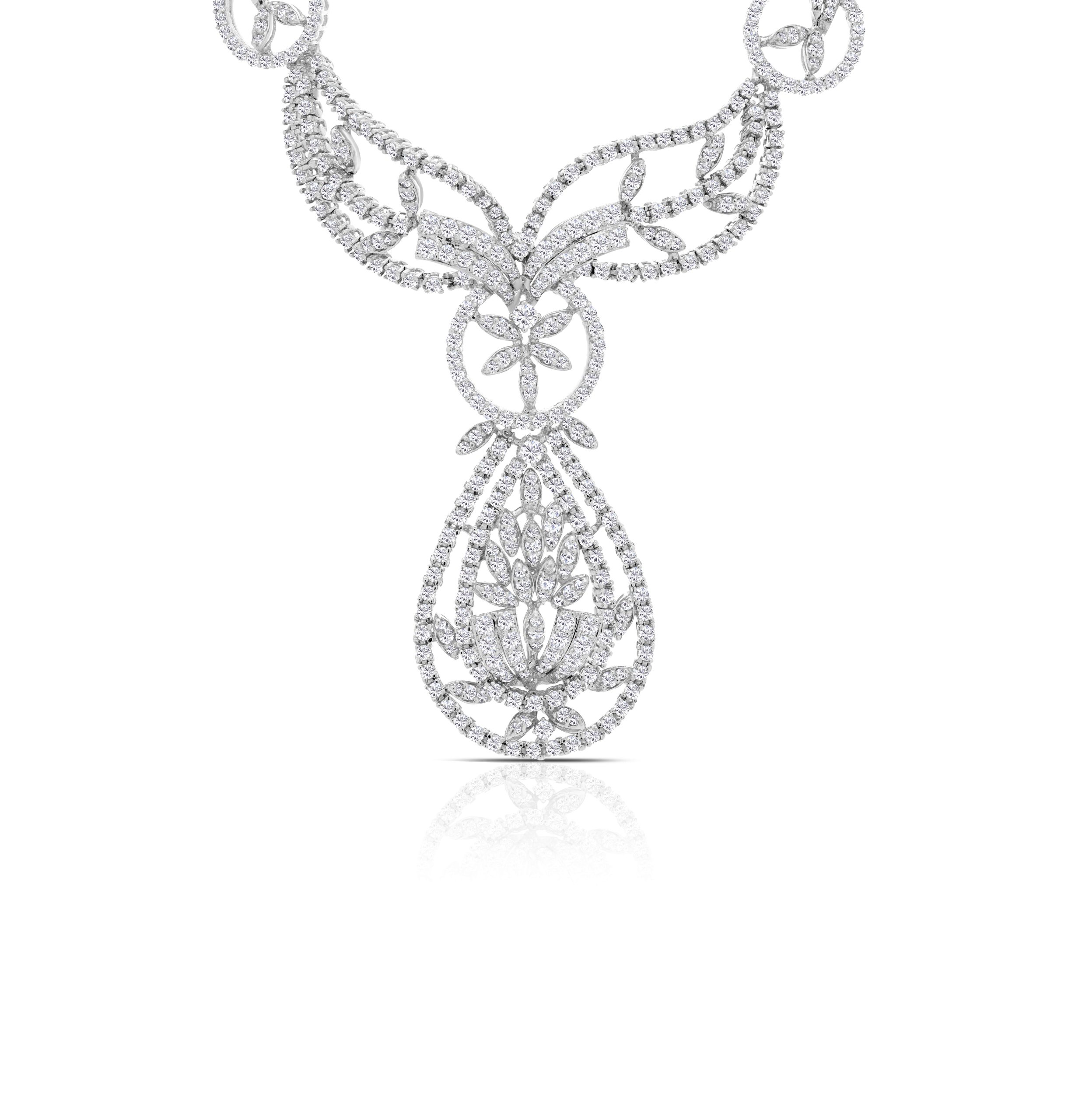 Introducing the epitome of opulence and sophistication in our 14 karat white gold diamond chandelier necklace. This exquisite piece exudes sheer luxury with its stunning ensemble of 10.46cts. of round brilliant cut diamonds intricately set in a breathtaking chandelier design. Each facet of this necklace reflects elegance and grace, illuminating the neckline with an unmatched brilliance that captivates the beholder. Perfect for those who seek a touch of extravagance and timeless beauty, this necklace serves as a symbol of refined glamour, accentuating any attire with a touch of unparalleled sophistication and splendor.