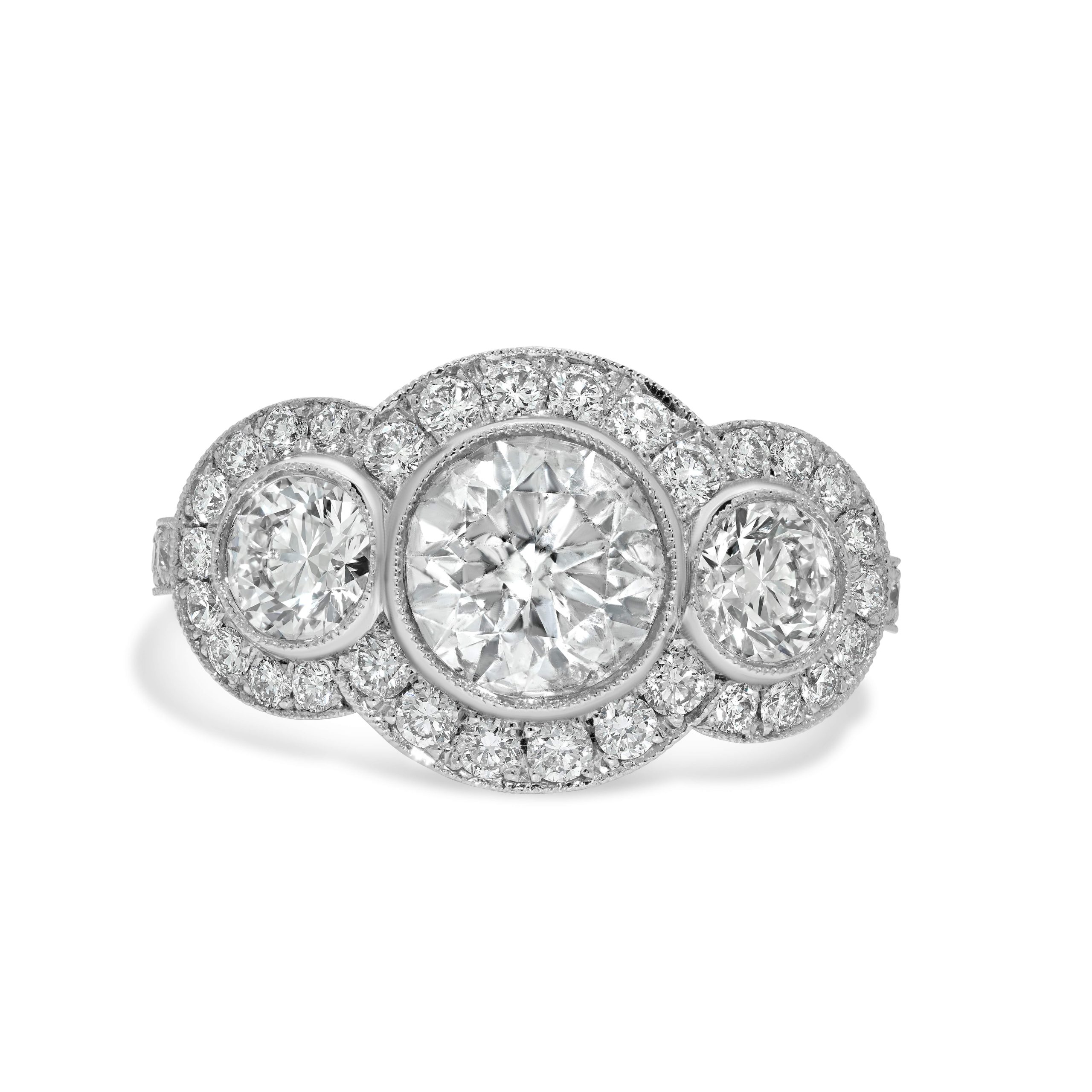 Captivate the essence of timeless love with our 14 karat white gold three-stone engagement ring. The heart of this exquisite piece is a stunning 2.01ct. round brilliant cut diamond, bezel-set with grace and poise. Flanking this center gem are two half-carat diamonds, also bezel-set, forming a symphony of brilliance. The allure continues with the delicate pavé setting, embracing the trio with an additional .74cts. of round brilliant cut diamonds. Meticulously crafted, this engagement ring is not just a symbol of commitment but a celebration of enduring elegance. Seal your love story with the unparalleled beauty of this 14 karat white gold masterpiece.