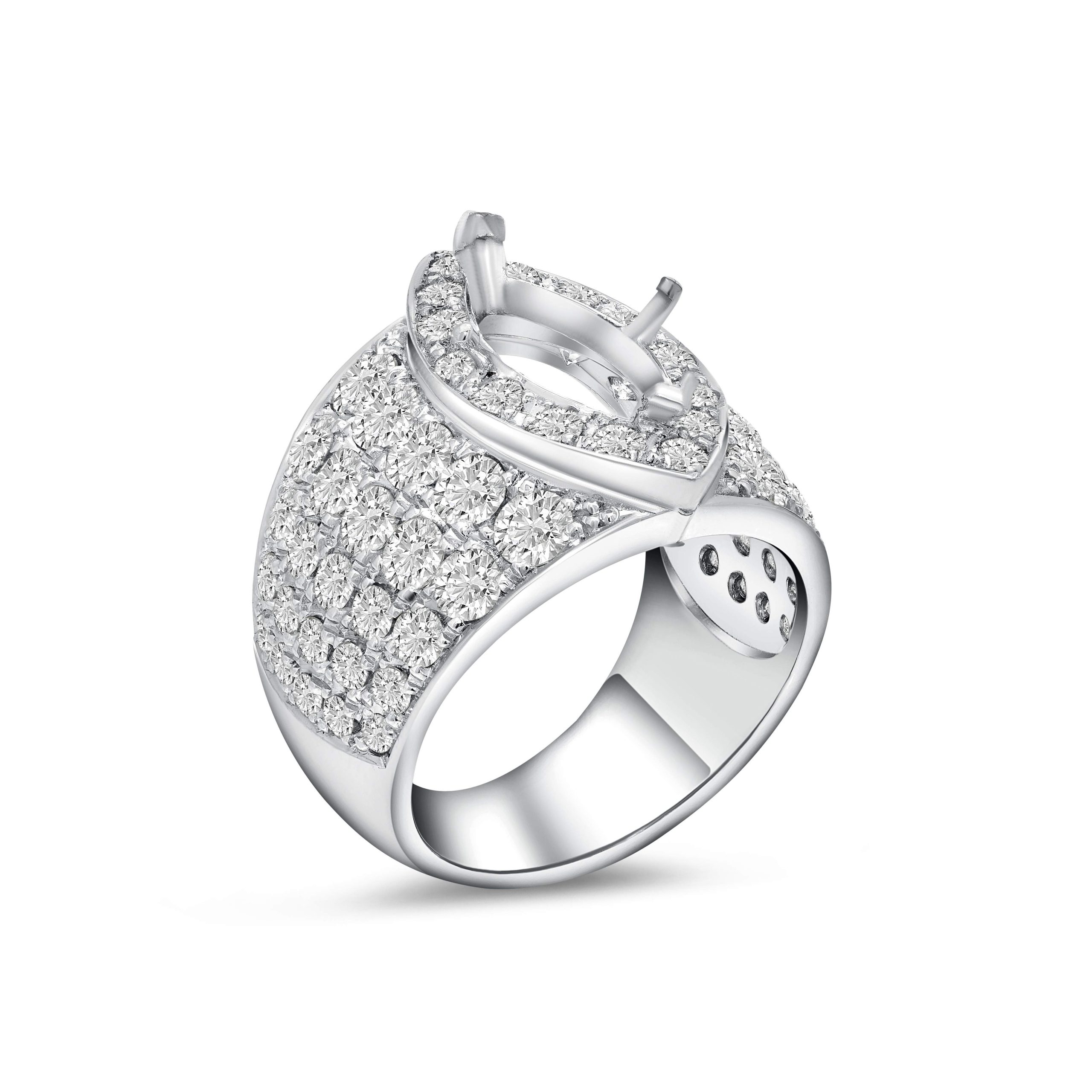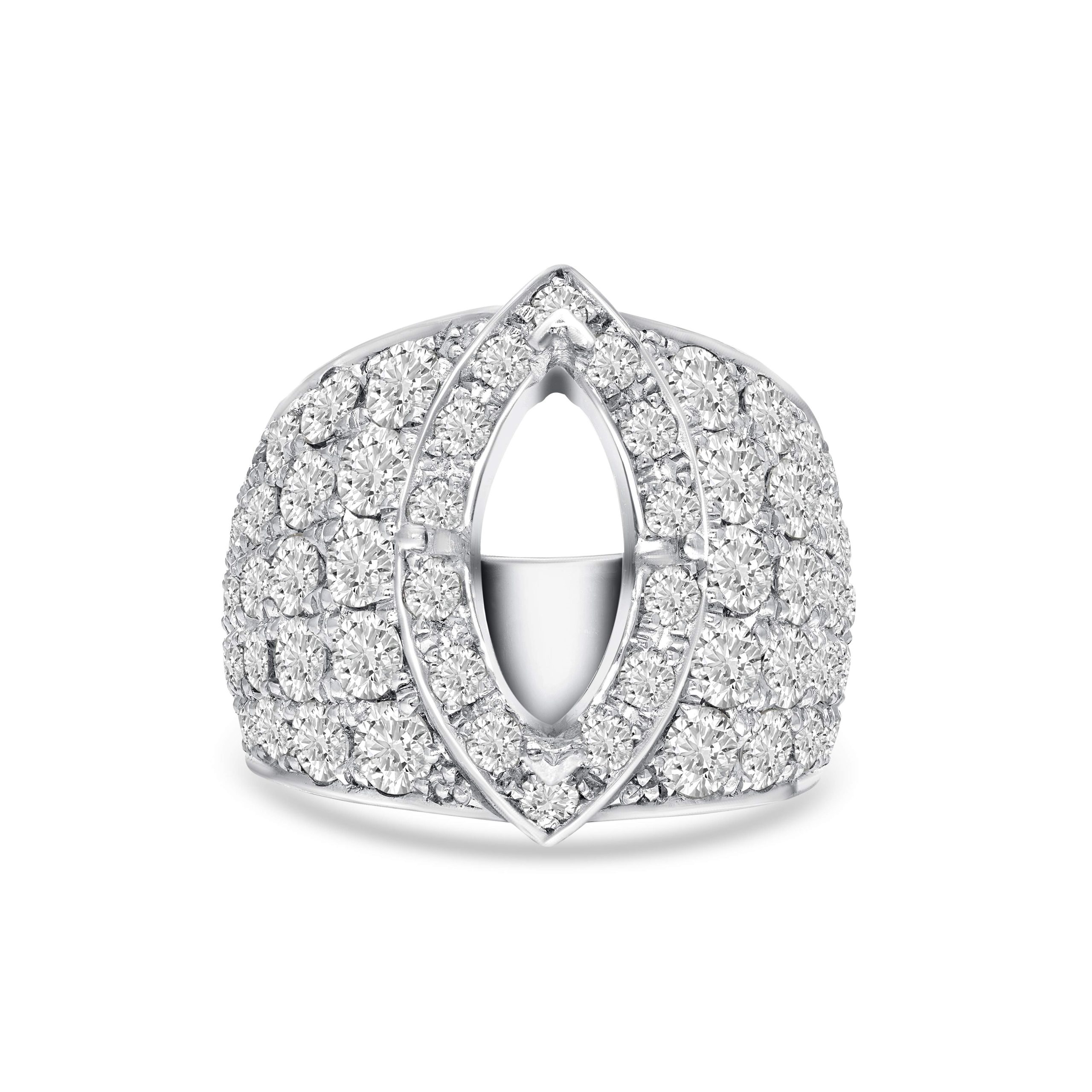 Embark on a journey of timeless elegance with our 14 karat white gold diamond semi-mount ring. This exquisite piece, adorned with 3.23cts. of round brilliant cut diamonds, captures the essence of sophistication. The open center invites a marquise shaped stone, allowing you to personalize and complete this radiant masterpiece. Meticulously crafted in white gold, the ring seamlessly blends classic charm with modern design, creating a captivating symbol of enduring love and individual style. Choose a marquise gemstone to make this semi-mount ring uniquely yours, a reflection of your distinctive taste and the promise of a lifetime.