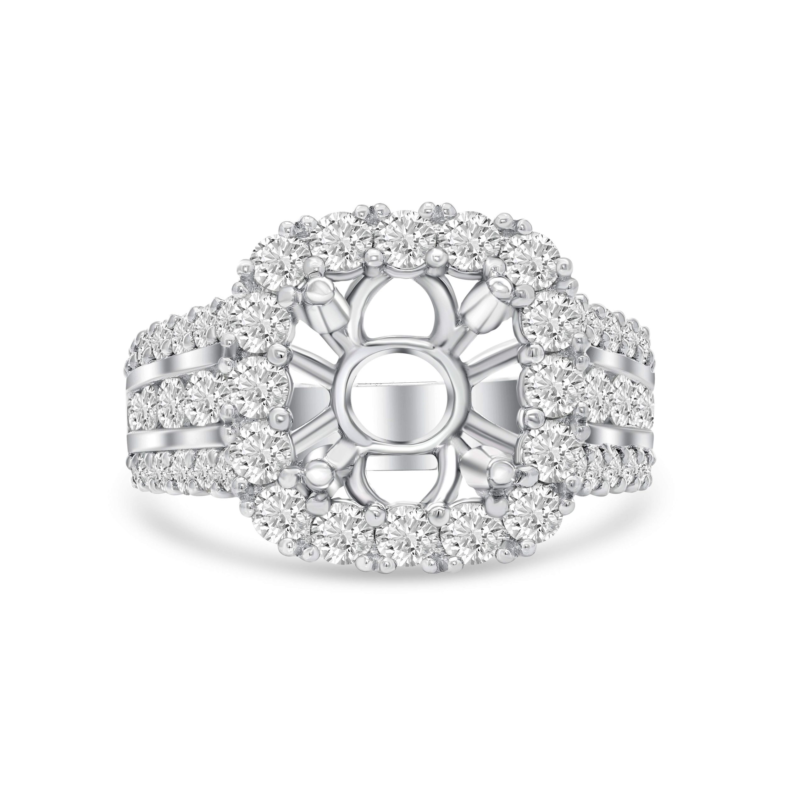 Elevate your style with our 14 karat white gold semi mount ring–a captivating blend of contemporary design and timeless beauty. This halo style ring boasts 1.84cts. of round brilliant cut diamonds, adding warmth and allure to the piece. Diamonds gracefully adorn the shank, enhancing the overall radiance. Meticulously crafted, this ring is a modern interpretation of sophistication, making it the perfect accessory for those who appreciate unique elegance and subtle luxury.