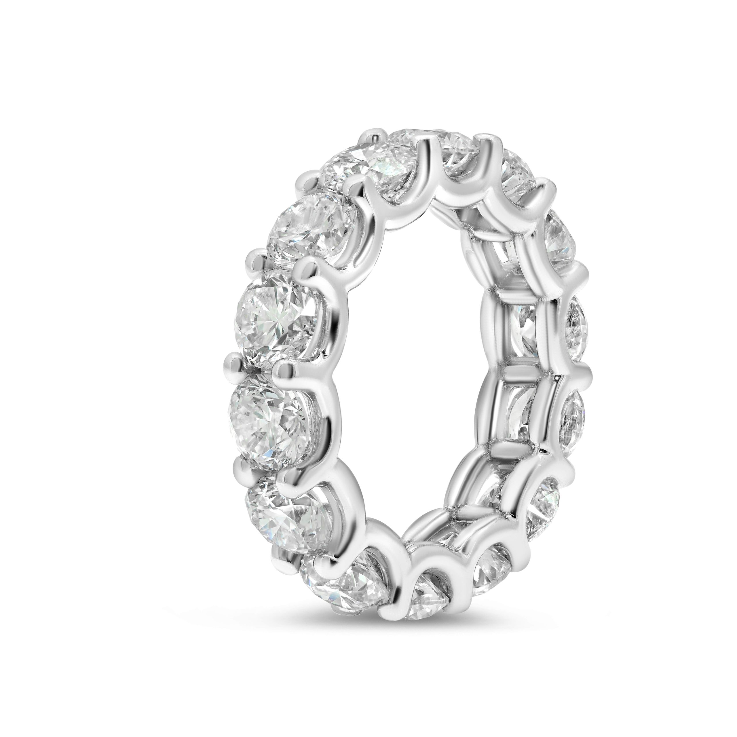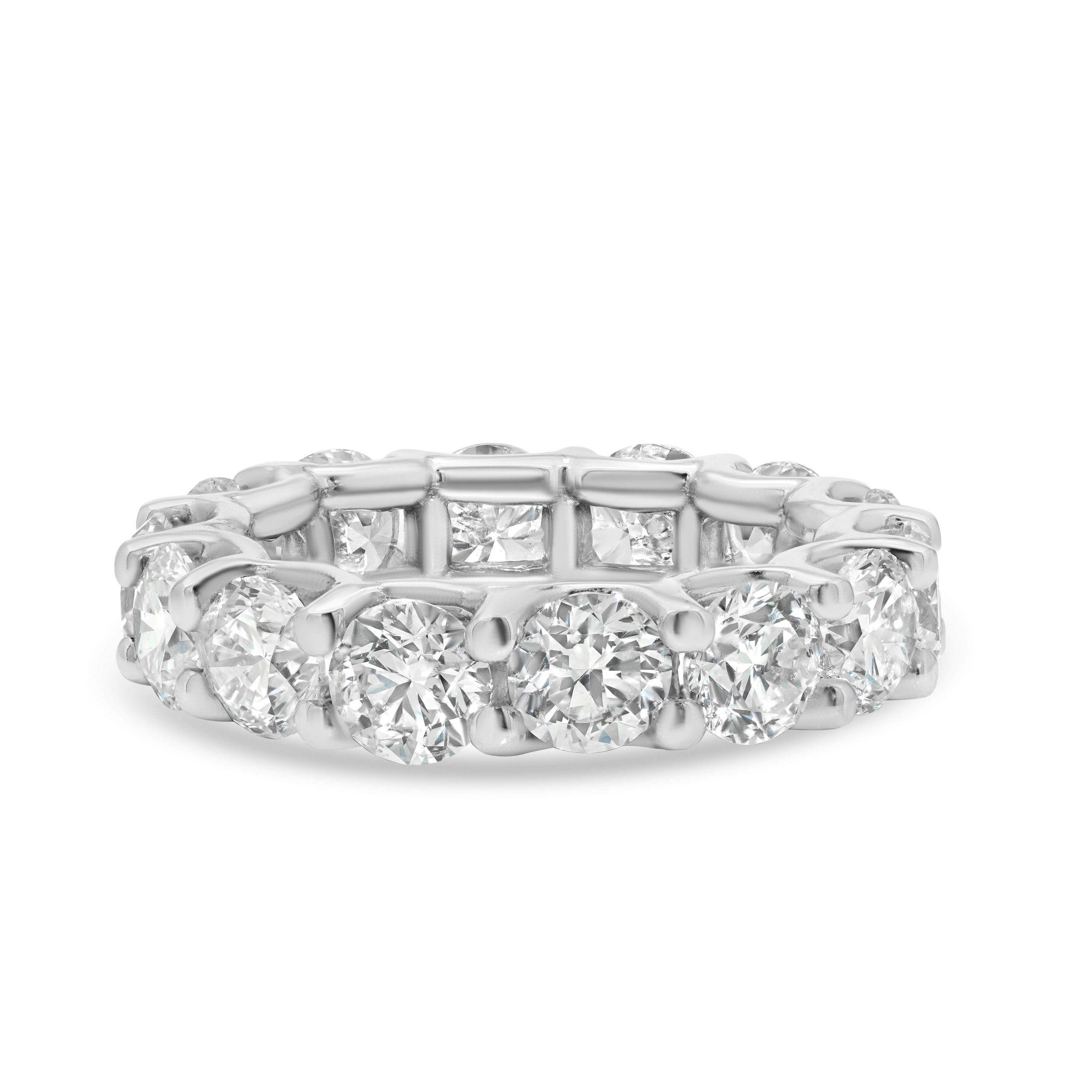 Indulge in the timeless allure of our classic 14 karat white gold eternity band, adorned with a mesmerizing 7.12cts. of rare round brilliant cut diamonds. Each gem sparkles with a warm and captivating glow, creating a sophisticated and enduring symbol of love. Meticulously crafted, this exquisite piece seamlessly marries tradition with contemporary style, making it a perfect embodiment of eternal commitment and refined beauty. Elevate your moments with this exceptional celebration of enduring love.