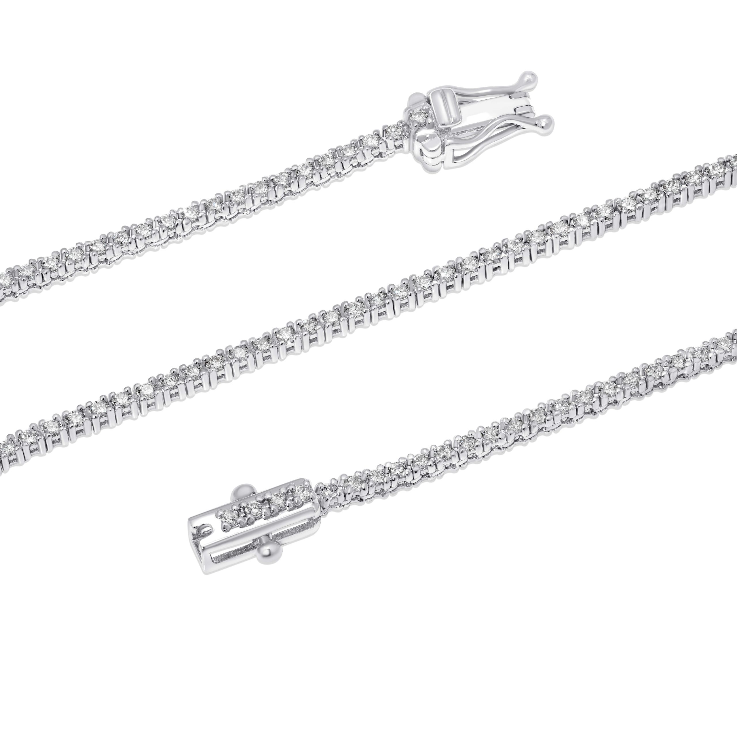 Elevate your daily style with our 14 karat white gold diamond tennis necklace, a timeless piece adorned with 2.07cts. of round brilliant cut diamonds. Meticulously set to perfection, this necklace seamlessly blends sophistication and versatility, making it the ideal everyday accessory. The continuous sparkle of diamonds against the white gold setting adds a touch of understated glamour to your ensemble. Effortlessly transition from day to night with this exquisite necklace that embodies enduring elegance and modern refinement. Make every day extraordinary with the brilliance of round-cut diamonds gracefully adorning your neckline.