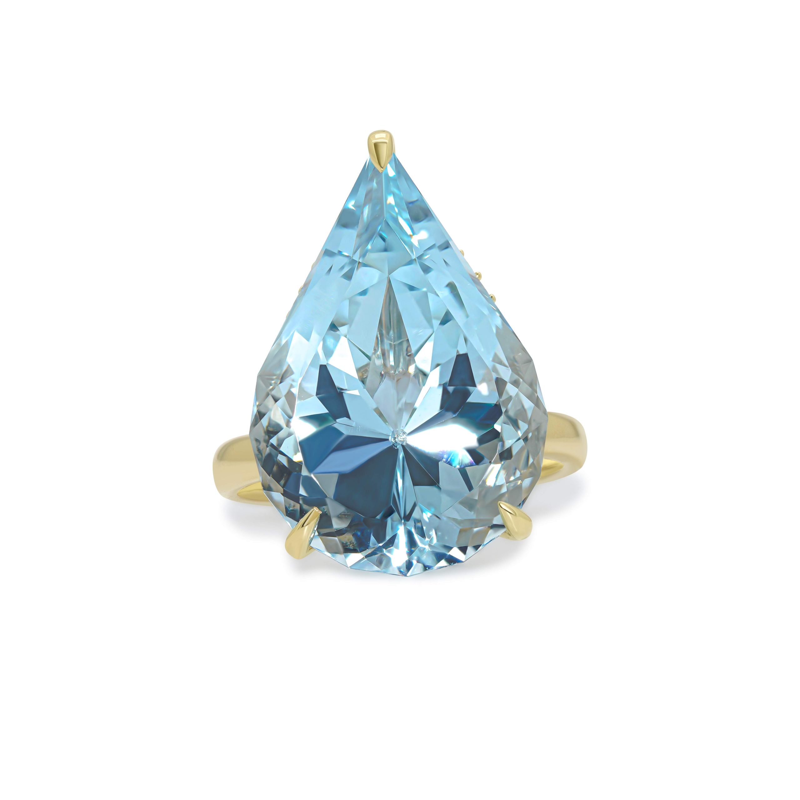 Introducing our exquisite 14 karat yellow gold double hidden halo ring, a true masterpiece of luxury and craftsmanship. This stunning ring features a dazzling .45cts. of round brilliant cut diamonds, intricately set in a double hidden halo design that enhances their sparkle and brilliance. At the center of this captivating piece is a magnificent 16.32ct. pear shaped aquamarine, radiating a mesmerizing blue hue that captures the essence of elegance. Crafted from high-quality 14 karat yellow gold, this ring is the perfect blend of timeless beauty and modern sophistication, making it an exceptional choice for any special occasion or as a standout addition to your fine jewelry collection.