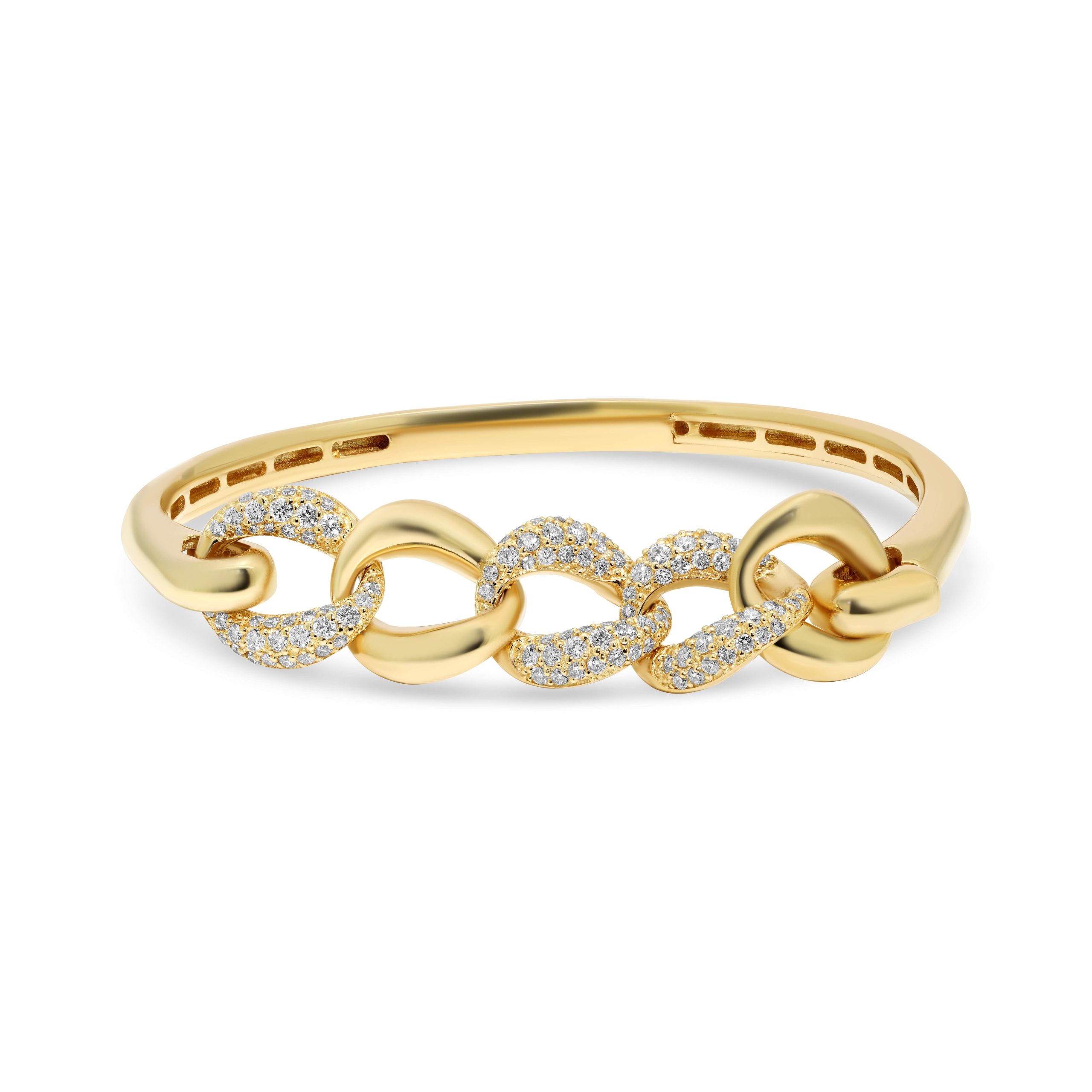 Step into contemporary luxury with our modern 14 karat yellow gold Cuban style linked bangle bracelet, a fusion of bold design and timeless elegance. This exquisite piece is adorned with 1.39cts. of round brilliant cut diamonds, meticulously set to accentuate the bracelet’s sleek curves. The result is a stunning harmony of modern flair and classic sparkle–a perfect accessory to elevate your style and make a statement. Indulge in the allure of this unique Cuban-inspired bracelet, where sophistication meets brilliance in a celebration of individuality and refinement.