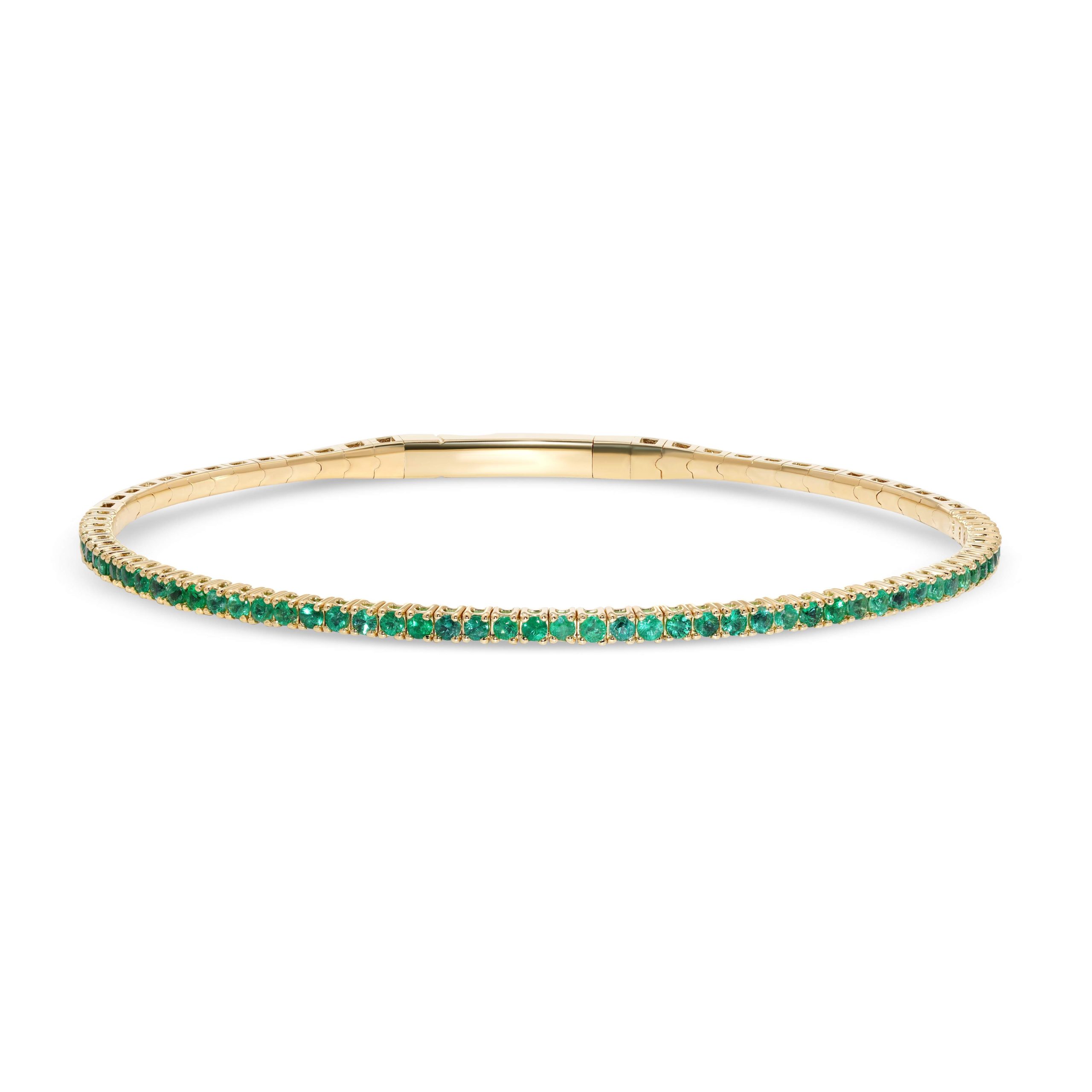 Adorn yourself in the timeless elegance of our 14 karat yellow gold emerald flexible bangle. Crafted with precision and care, this exquisite piece features a captivating array of round emeralds totaling .72cts. Each emerald is meticulously set within the flexible design, allowing for effortless movement while showcasing the rich green hues that evoke a sense of natural beauty and vitality. The lustrous yellow gold setting provides the perfect complement, enhancing the brilliance of each emerald with its warm and radiant tones. Elevate your ensemble with this enchanting bangle, a symbol of refined luxury and enduring sophistication.