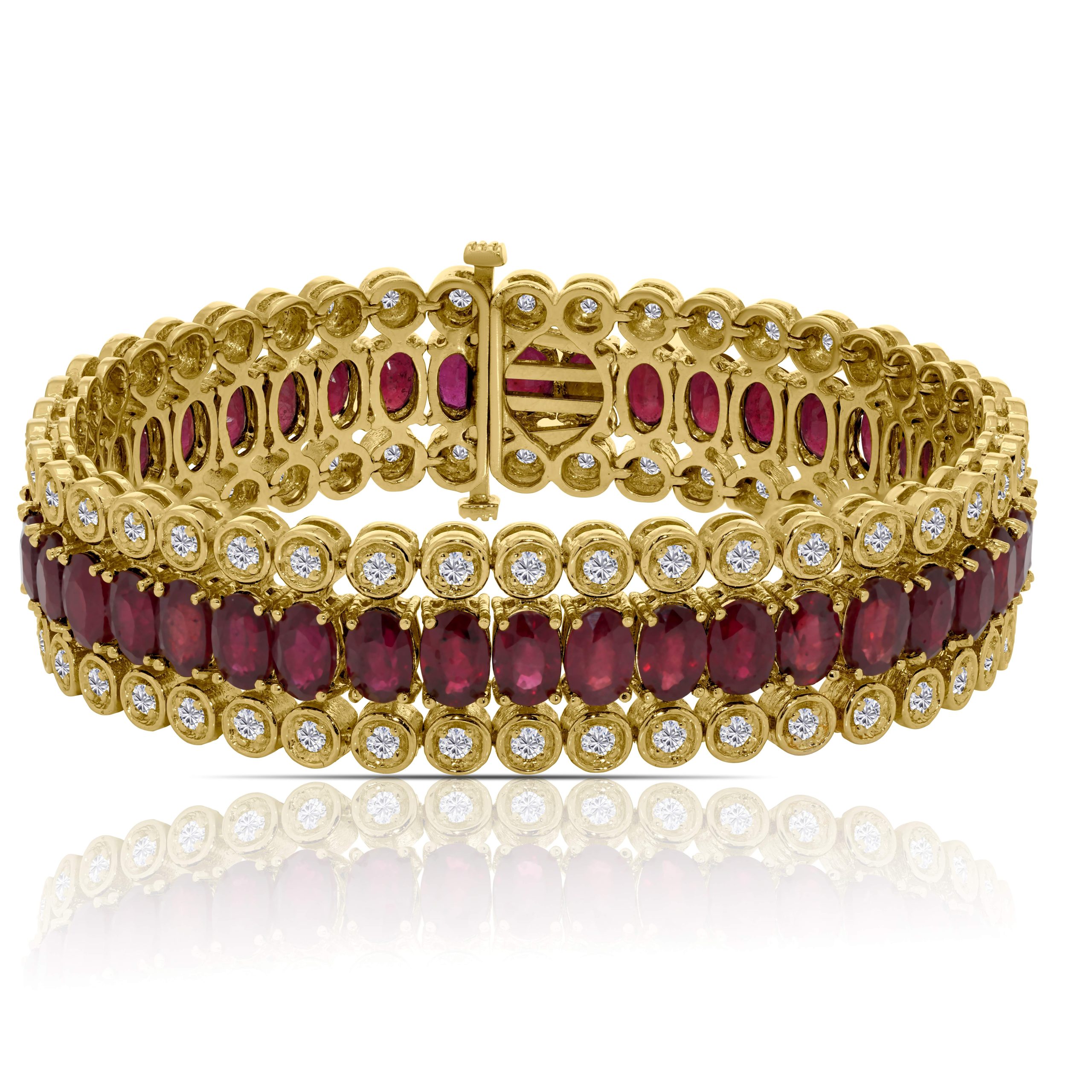 Introducing our exquisite 14 Karat Yellow Gold Estate-Inspired Bracelet, a timeless and sophisticated piece that captures the essence of vintage elegance. This remarkable bracelet features a stunning 31.96cts. of oval-shaped glass-filled rubies, reminiscent of cherished heirlooms. Framing these captivating rubies are 2.77cts. of round brilliant cut diamonds on either side, adding a contemporary sparkle to the classic design. With its estate-inspired charm, this bracelet combines the rich allure of rubies with the brilliance of diamonds, creating a piece that resonates with both history and style. Whether you’re dressing up for a special occasion or adding a touch of vintage glamour to your everyday look, this bracelet is the perfect choice. Elevate your jewelry collection with the enduring beauty of 14 karat yellow gold, and let this estate-inspired masterpiece be your statement of timeless sophistication and heritage.