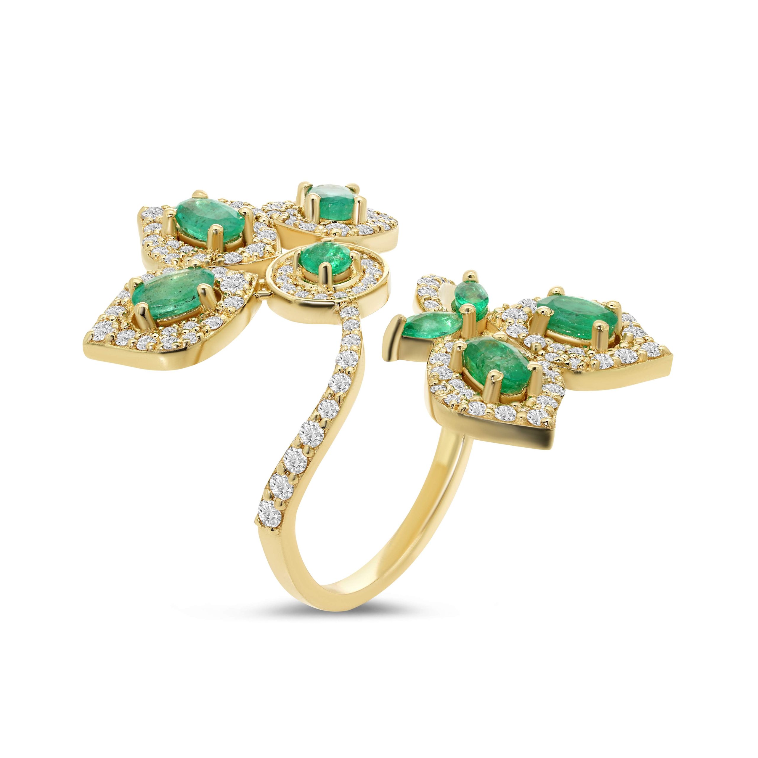 Experience the enchantment of nature’s beauty with our 14 karat yellow gold diamond and emerald leaf-inspired cocktail ring. Crafted to emulate delicate leaves, this ring features a captivating display of 1.29cts. of round brilliant cut diamonds, creating a mesmerizing sparkle. Adorning the design, 1.55cts. of vibrant emeralds breathe life into the piece, evoking the lushness of nature’s hues. With meticulous attention to detail, this ring captures the essence of elegance and sophistication, offering a timeless statement piece that effortlessly combines glamour and organic allure."