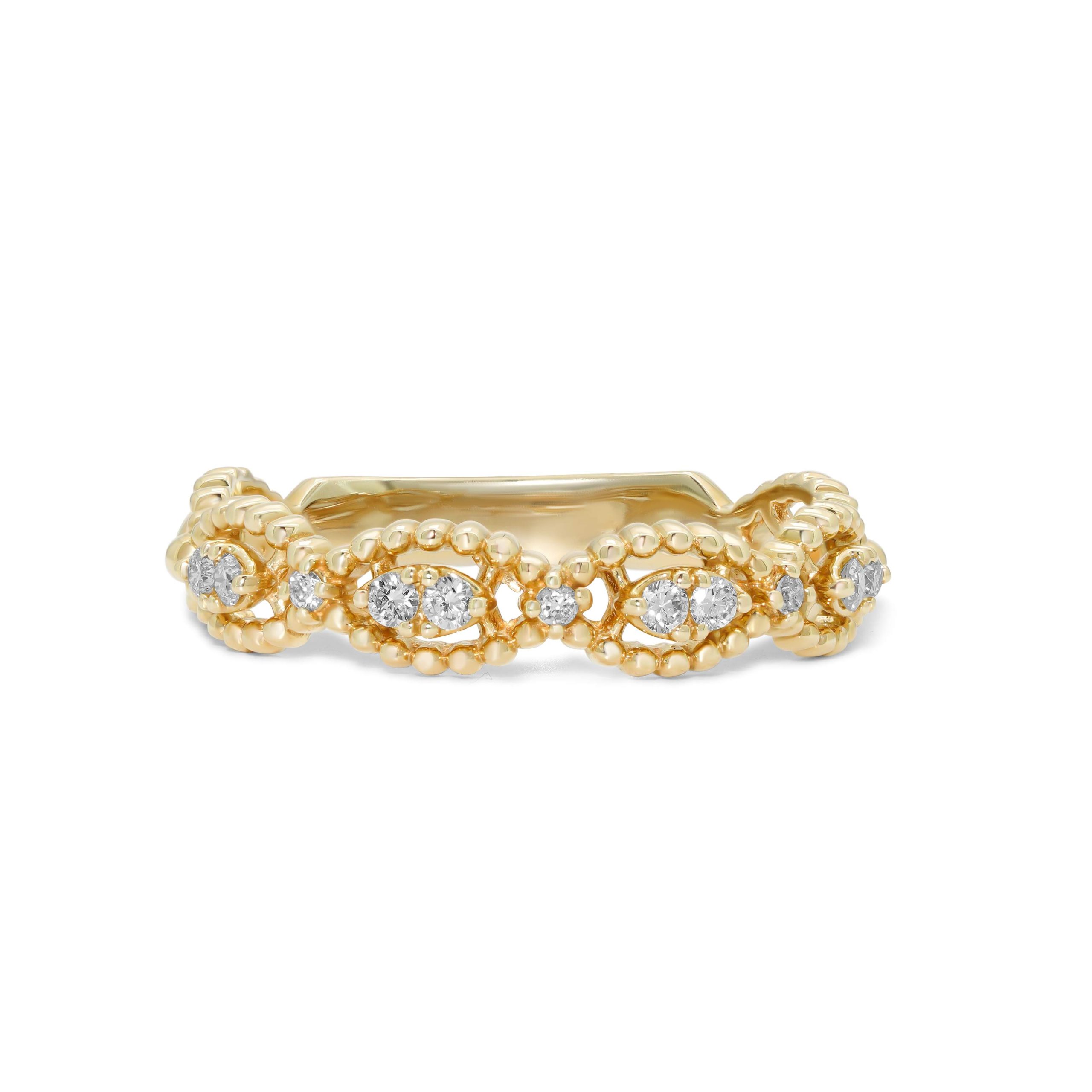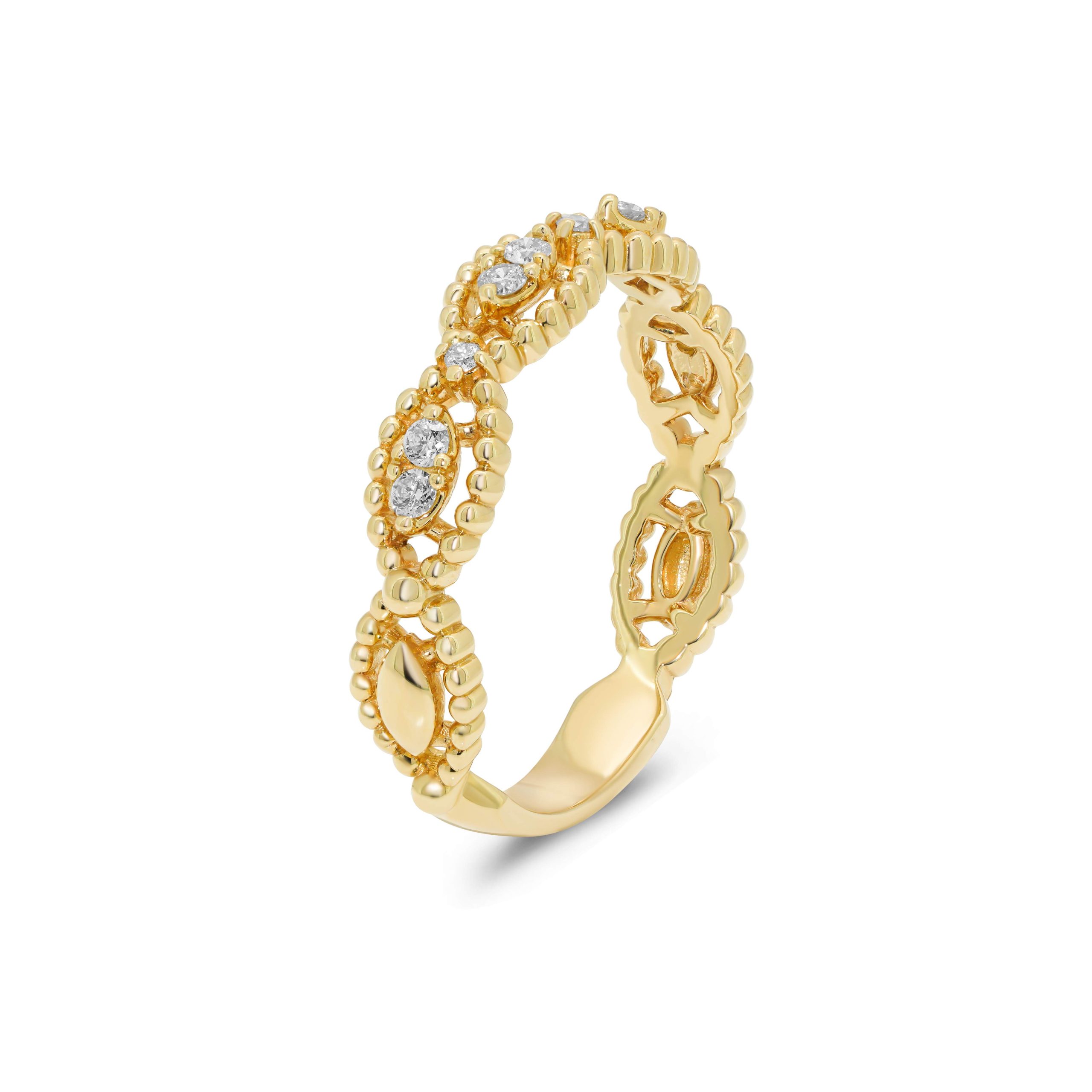 Elevate your everyday elegance with our exquisite 14 karat yellow gold diamond band, a timeless symbol of sophistication and style. Crafted with meticulous attention to detail, this band features two round brilliant cut diamonds in each segment, delicately surrounded by beaded gold balls for a touch of texture and dimension. With a total carat weight of 0.16cts., the diamonds add a subtle sparkle to this classic design, making it perfect for stacking or wearing alone as a statement piece. Embrace the timeless beauty and versatility of this radiant diamond band, destined to become a treasured addition to your jewelry collection.