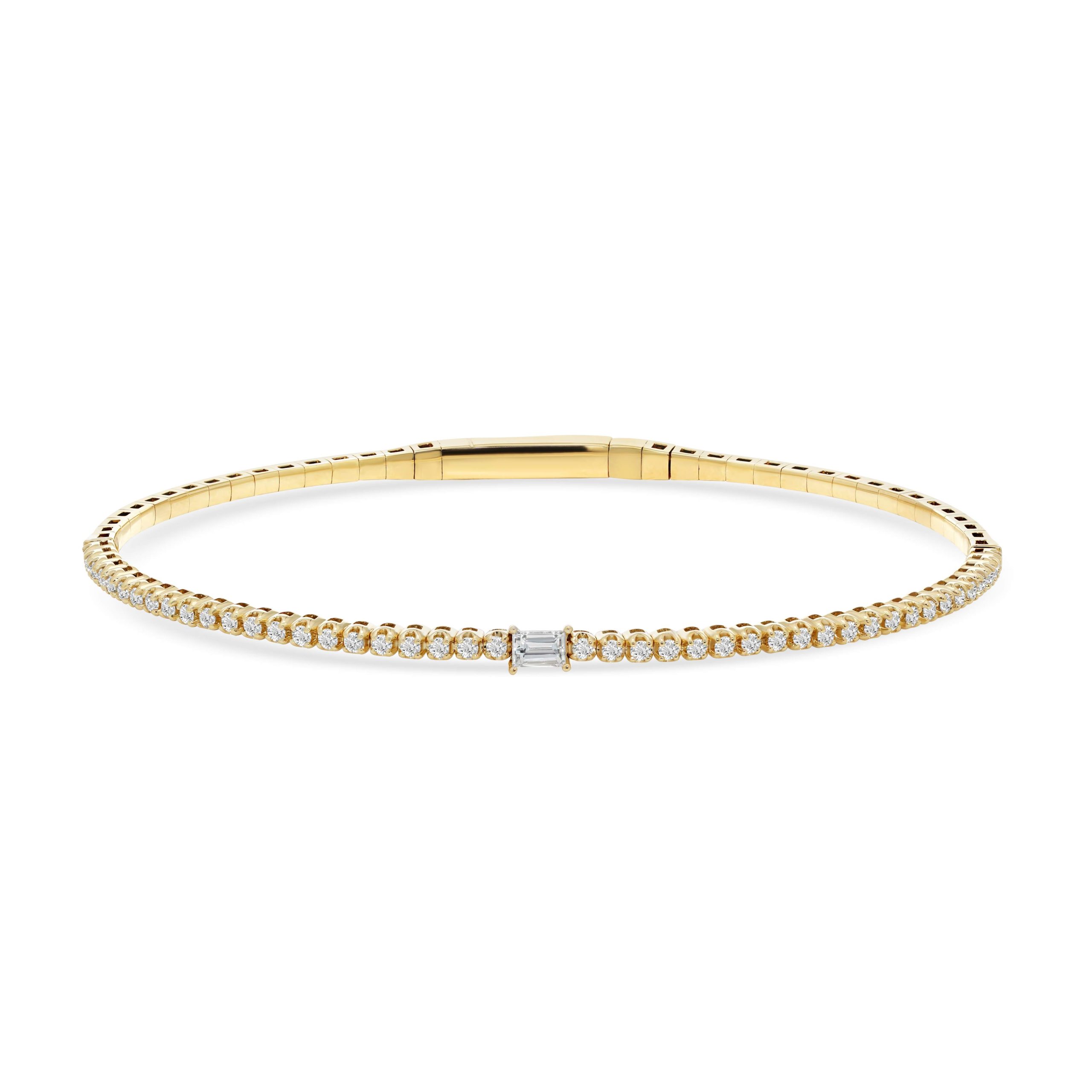 Discover sophistication in motion with our 14 karat yellow gold diamond flexible bangle, a true testament to elegance. Adorned with 0.44cts. of shimmering round brilliant cut diamonds encircling a striking centerpiece–a single, radiant 0.12ct. baguette diamond–this bangle reflects unparalleled grace and style. The flexibility of the design ensures a comfortable fit while the dazzling diamonds, meticulously set, offer a unique touch of refinement, making this piece a timeless addition to any ensemble.