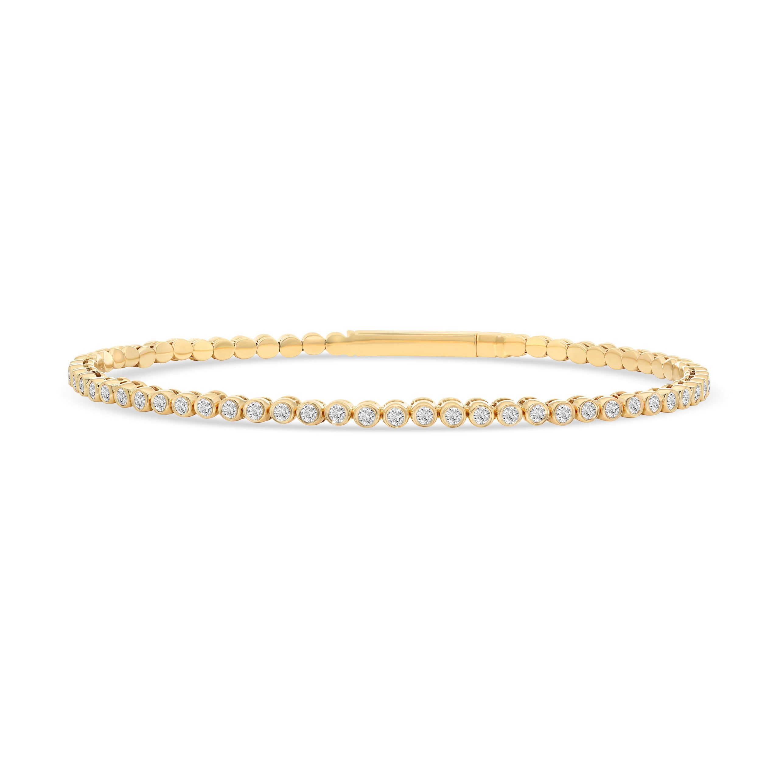 Indulge in the epitome of sophistication with our 14 karat yellow gold diamond flexible bangle. This exquisite piece boasts a dazzling array of 1.33cts. of round brilliant cut diamonds, carefully set within the flexible gold band. The seamless and graceful design offers both comfort and luxury, allowing the diamonds to radiate their mesmerizing brilliance against the backdrop of lustrous yellow gold. Elevate any attire with this statement piece, an embodiment of timeless elegance and refined craftsmanship, perfect for those who appreciate sophistication and glamour.