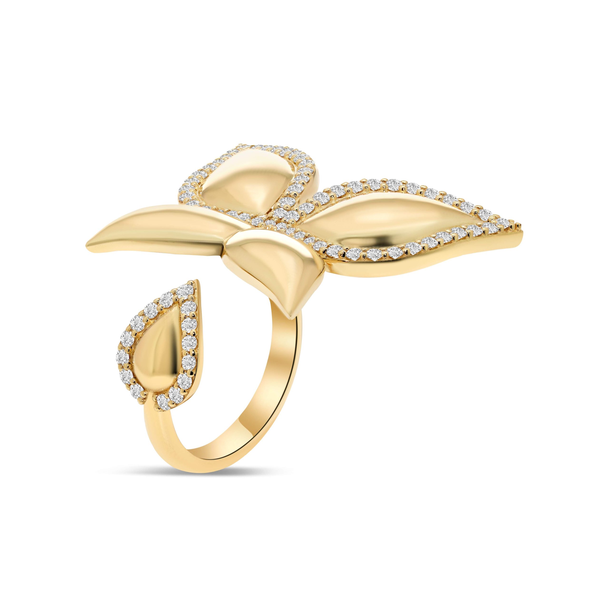 Step into a world of enchanting elegance with our 14 karat yellow gold diamond cocktail ring, a mesmerizing piece that embodies the beauty of nature. Adorned with .86cts. of exquisite round brilliant cut diamonds, arranged in a captivating floral and leaf-inspired design, this ring is a true work of art. The intricate craftsmanship beautifully complements the warmth of yellow gold, creating a mesmerizing contrast that captures the essence of natural beauty. Elevate your style with this unique cocktail ring, a stunning symbol of sophistication and grace for those who cherish nature inspired elegance.