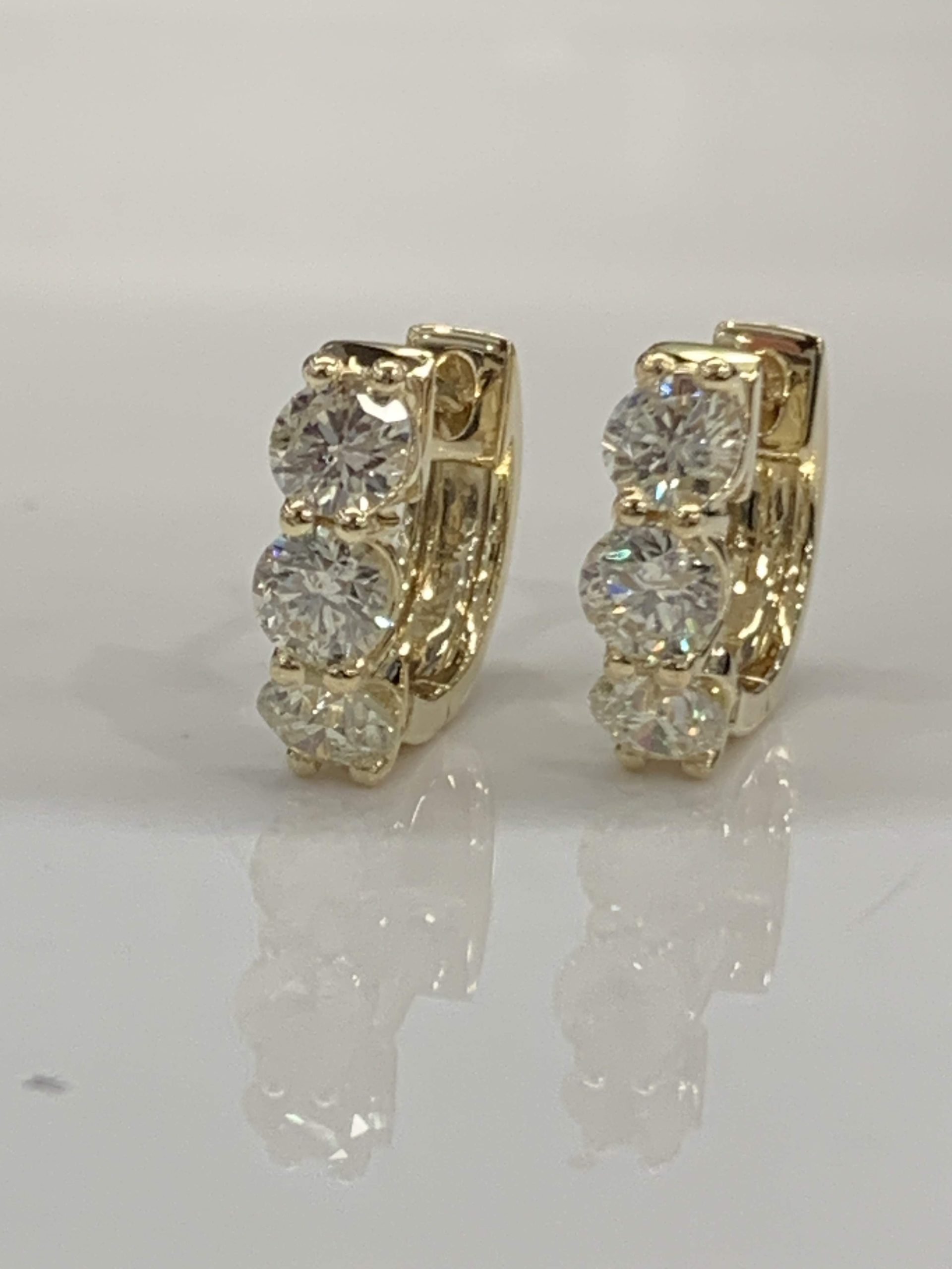 Discover timeless elegance with our pair of 14 karat yellow gold three stone diamond huggie earrings, capturing a total weight of 1.73cts. of exquisite round brilliant cut diamonds. These earrings exude sophistication and versatility, ideal for everyday wear or special occasions. The classic huggie design, adorned with three shimmering diamonds, reflects enduring style and grace. Elevate your look with these charming earrings, a perfect fusion of simplicity and brilliance, bringing a touch of refined luxury to any ensemble.