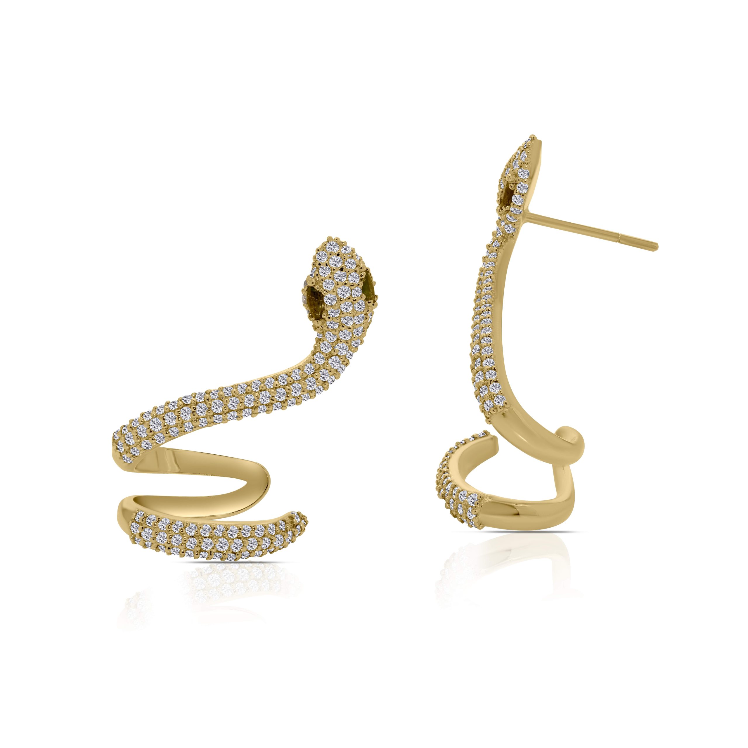 Unleash your daring sense of style with our extraordinary 14 karat yellow gold snake earrings, a mesmerizing fusion of elegance and mystique. These earrings boasts a mesmerizing 1.75cts. of round brilliant cut diamonds, intricately set to capture the essence of the slithering serpent. The pièce de résistance: exquisite emeralds, totaling .16cts., vividly capturing the enigmatic gaze of the serpentine creatures. These stunning earrings, with their captivating design, intricately embody the allure of nature’s serpents while exuding a timeless sophistication, perfect for those seeking a unique and bold fashion statement