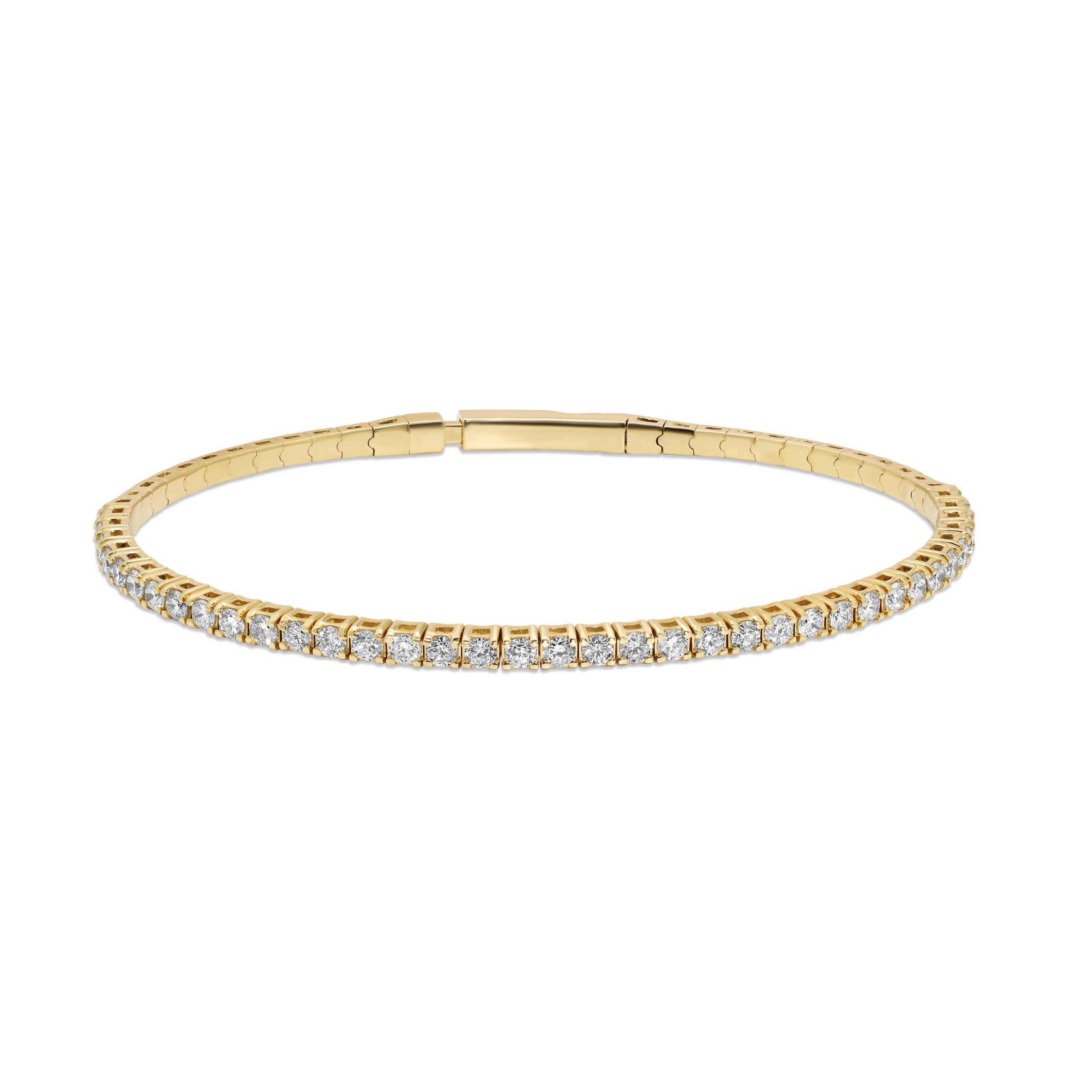 Introducing our latest creation, the 14 karat yellow gold flexible bangle–a stunning fusion of modern design and timeless allure. This exquisite bangle features 1.27cts. of round brilliant cut diamonds, meticulously set to illuminate the entire piece with a captivating sparkle. The flexible design not only ensures a comfortable and adjustable fit but also allows the diamonds to playfully catch the light with every movement. Crafted for those who appreciate the beauty of simplicity and sophistication, this yellow gold diamond bangle is more than an accessory–it’s a statement of refined elegance, adding a touch of radiance to any ensemble.