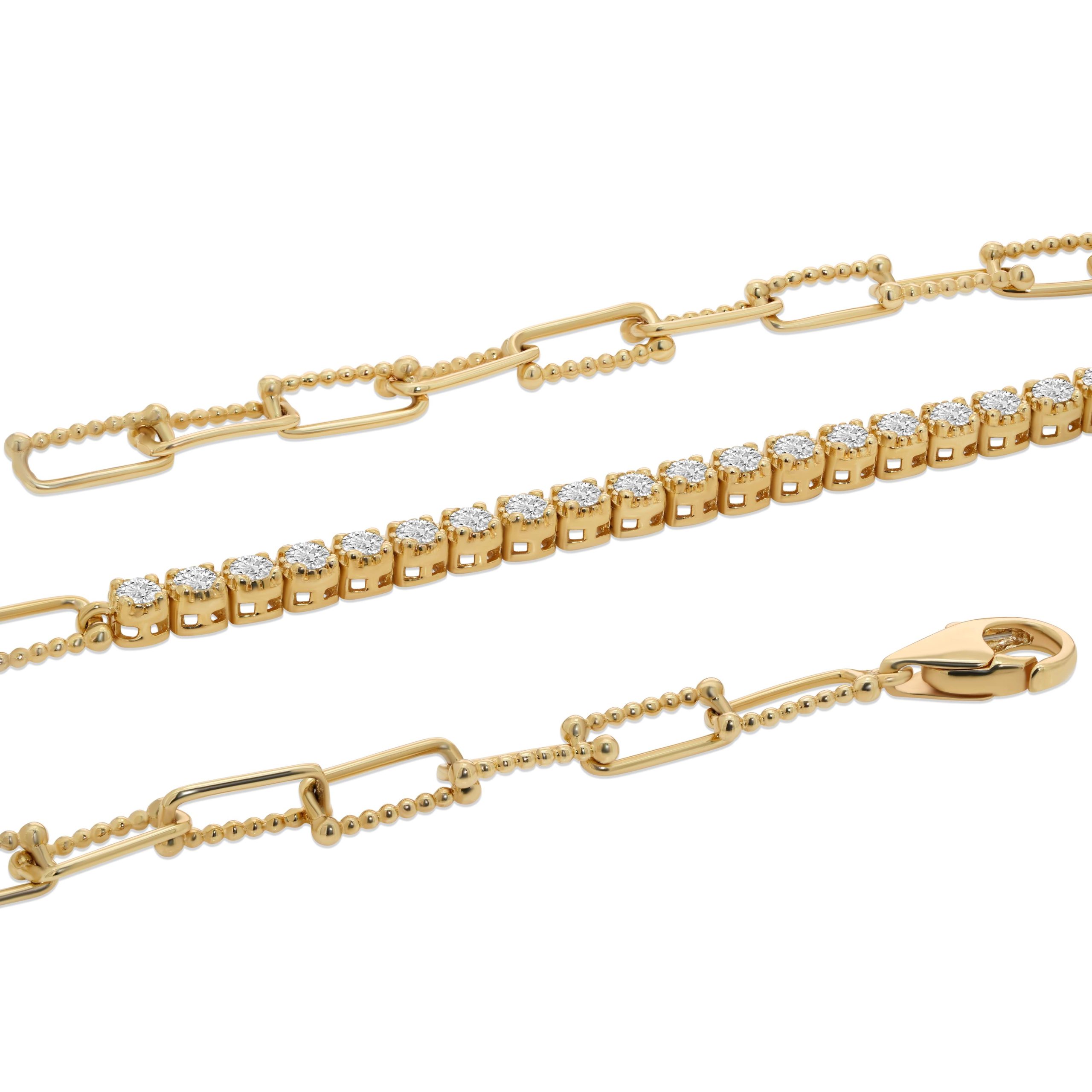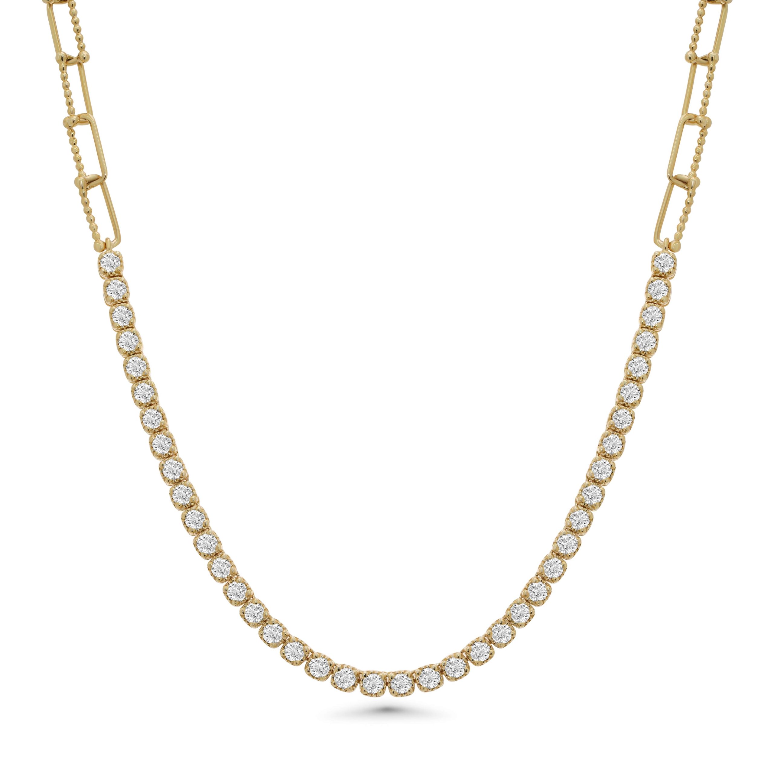 Introducing the epitome of elegance: our exquisite 14 karat yellow gold diamond tennis necklace. This stunning piece boasts a total of 1.79cts. of round brilliant cut diamonds elegantly set on the front section. The back part showcases a paperclip link style gold chain, adding a touch of versatility and style. The meticulously arranged diamonds create a mesmerizing sparkle, ensuring this necklace is a statement of sophistication and refinement. Elevate any look with this exquisite piece, ideal for adding a touch of luxury to any ensemble, whether it’s for a special occasion or everyday wear."
