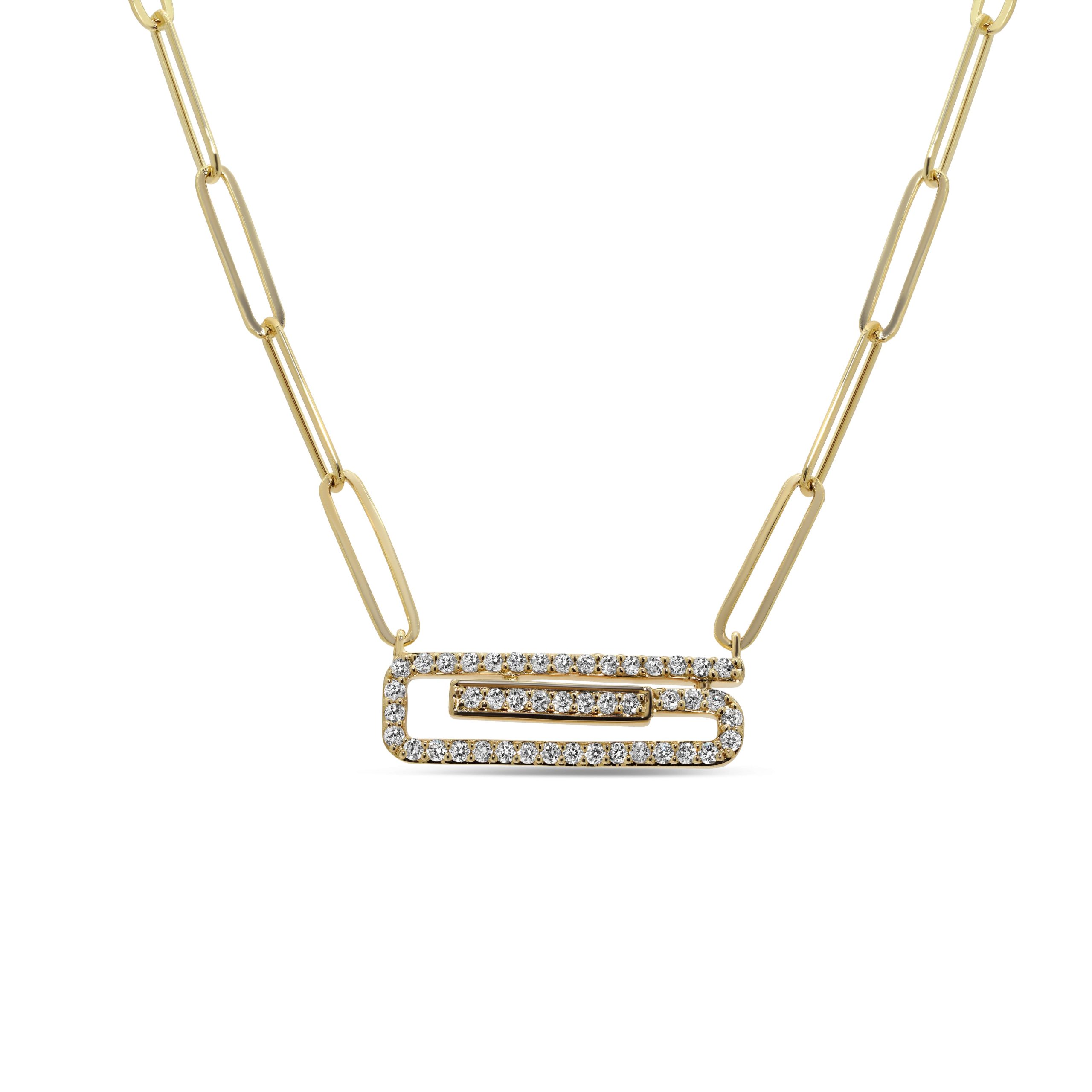Elevate your style with our 14 Karat Yellow Gold Diamond Paperclip Pendant, a modern and chic accessory that adds a touch of elegance to any outfit. This sleek pendant is adorned with 0.28cts. of round brilliant-cut diamonds, meticulously set to provide a subtle yet captivating sparkle. Crafted with meticulous attention to detail, this pendant combines the classic allure of yellow gold with the contemporary design of a paperclip link. The result is a piece that effortlessly transitions from casual to formal, making it a versatile addition to your jewelry collection. Whether you’re dressing up for a special occasion or adding a touch of glamour to your daily attire, this diamond paperclip pendant is a symbol of style and sophistication, perfect for the modern individual who appreciates both subtlety and elegance.