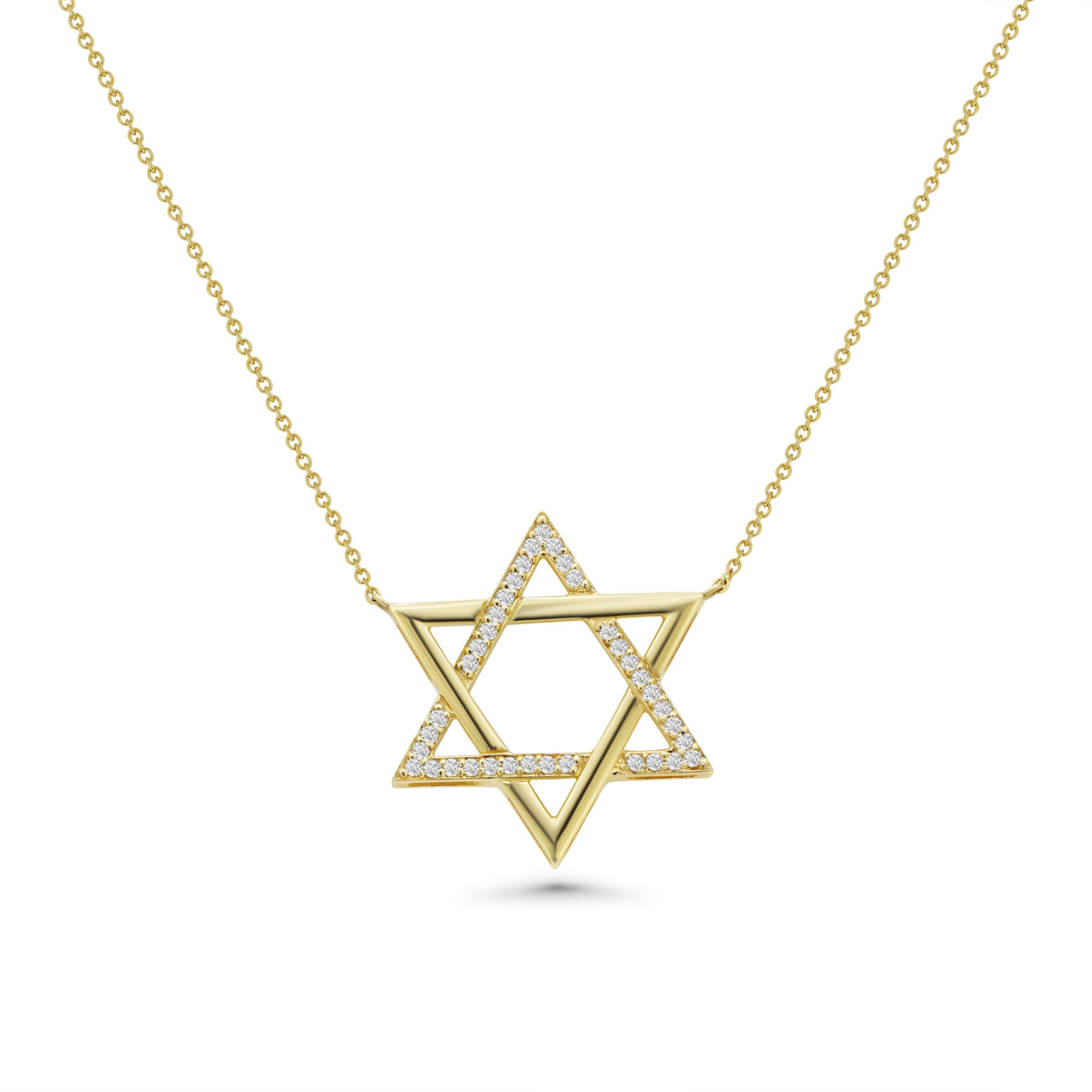Celebrate your faith with elegance through our 14 karat yellow gold Diamond Star of David pendant. This exquisite pendant features .49cts. of round brilliant cut diamonds, delicately set on one of the interlocking triangles, creating a stunning contrast and adding a touch of sparkle. The pendant is elegantly suspended on a linked chain attached to either side, ensuring it sits perfectly around your neck. This beautiful piece is a timeless symbol of faith and style, perfect for any occasion.