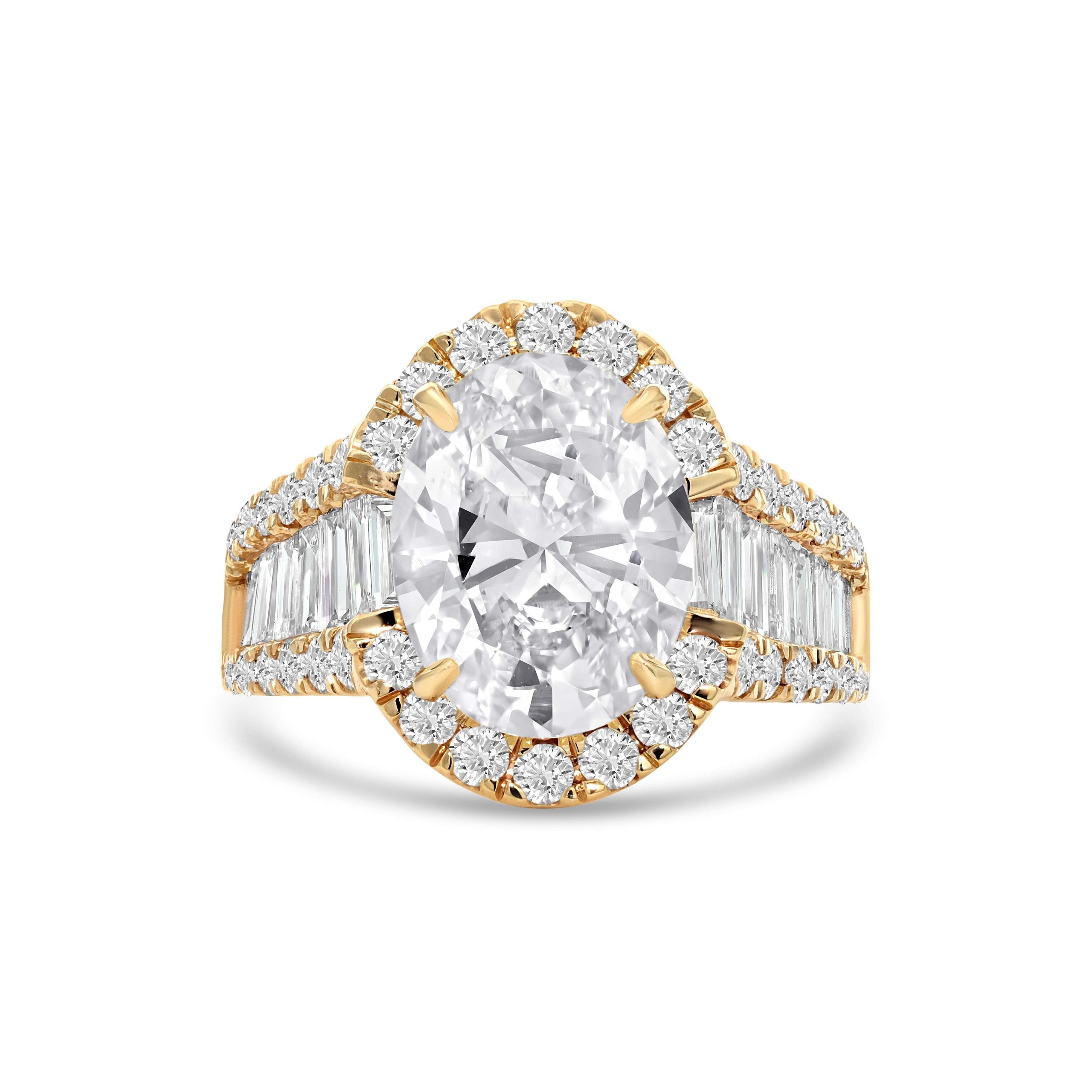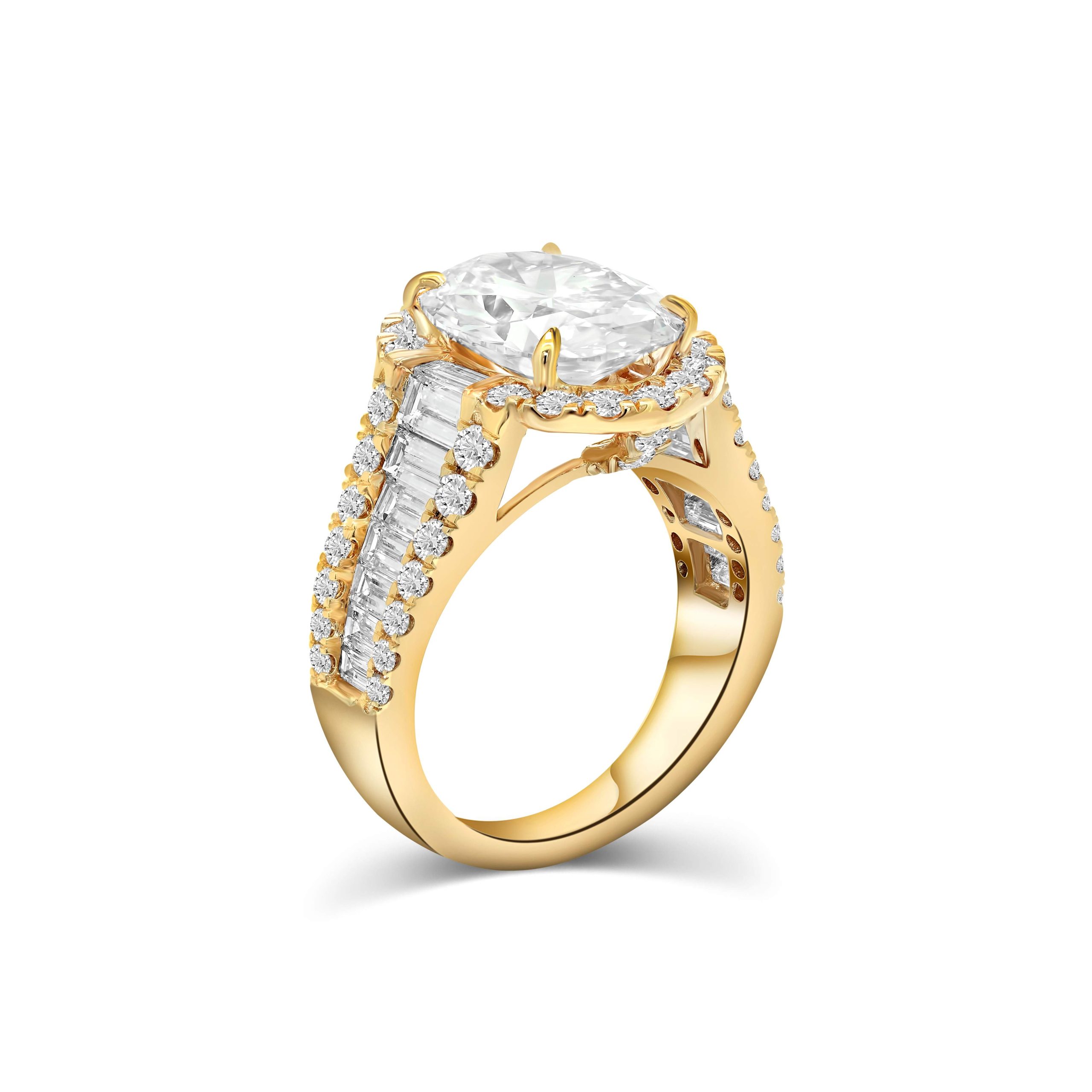 Indulge in opulence with our 14 karat yellow gold diamond setting–a true embodiment of luxury and style. This exquisite ring features a total of 2.34cts. of channel set baguette cut diamonds, complemented by round brilliant cut diamonds. At its heart lies a magnificent 4.04ct. oval diamond, EGL certified with a K color grade and VS2 quality. Meticulously crafted, this ring is a statement of sophistication and enduring beauty, promising to captivate and enchant for a lifetime.