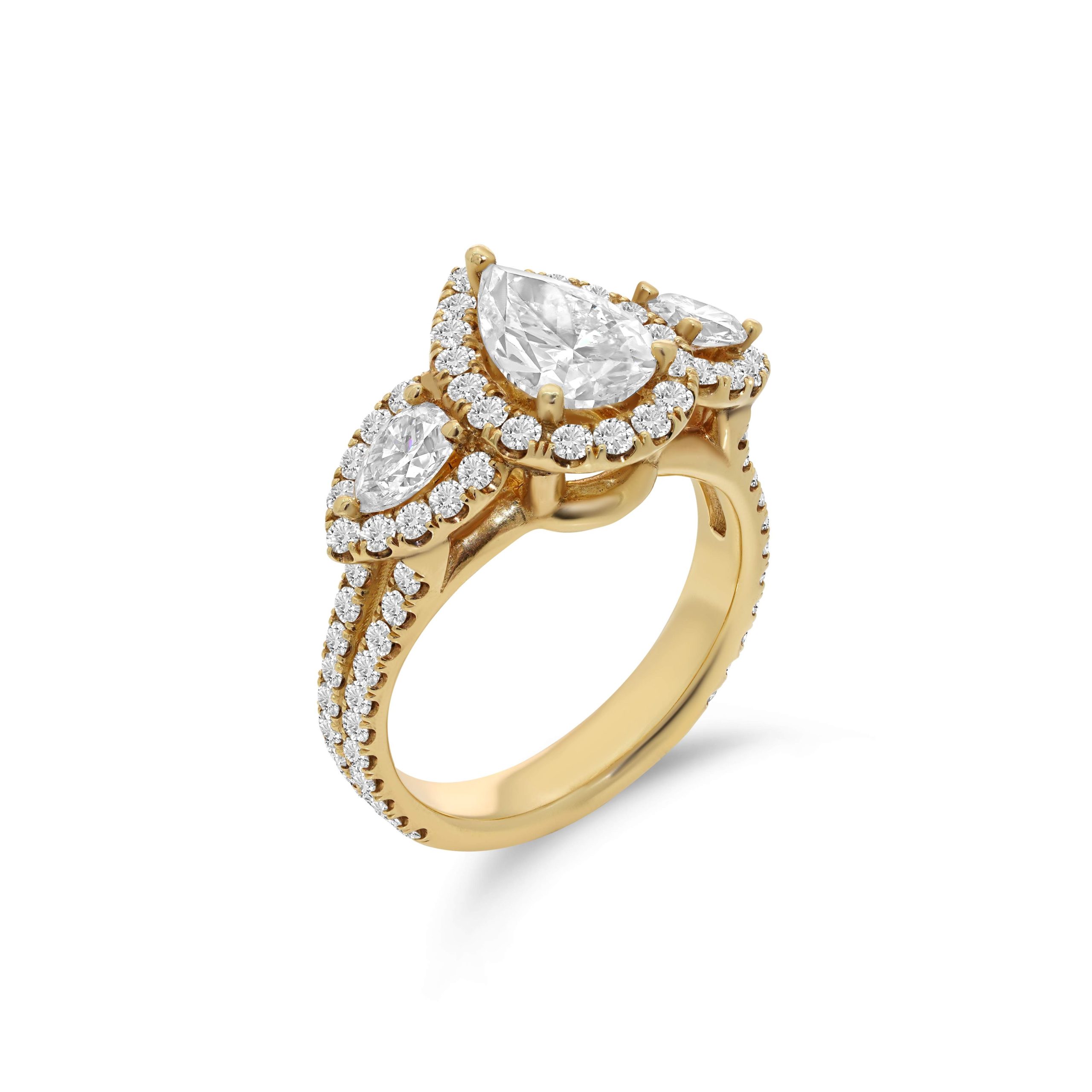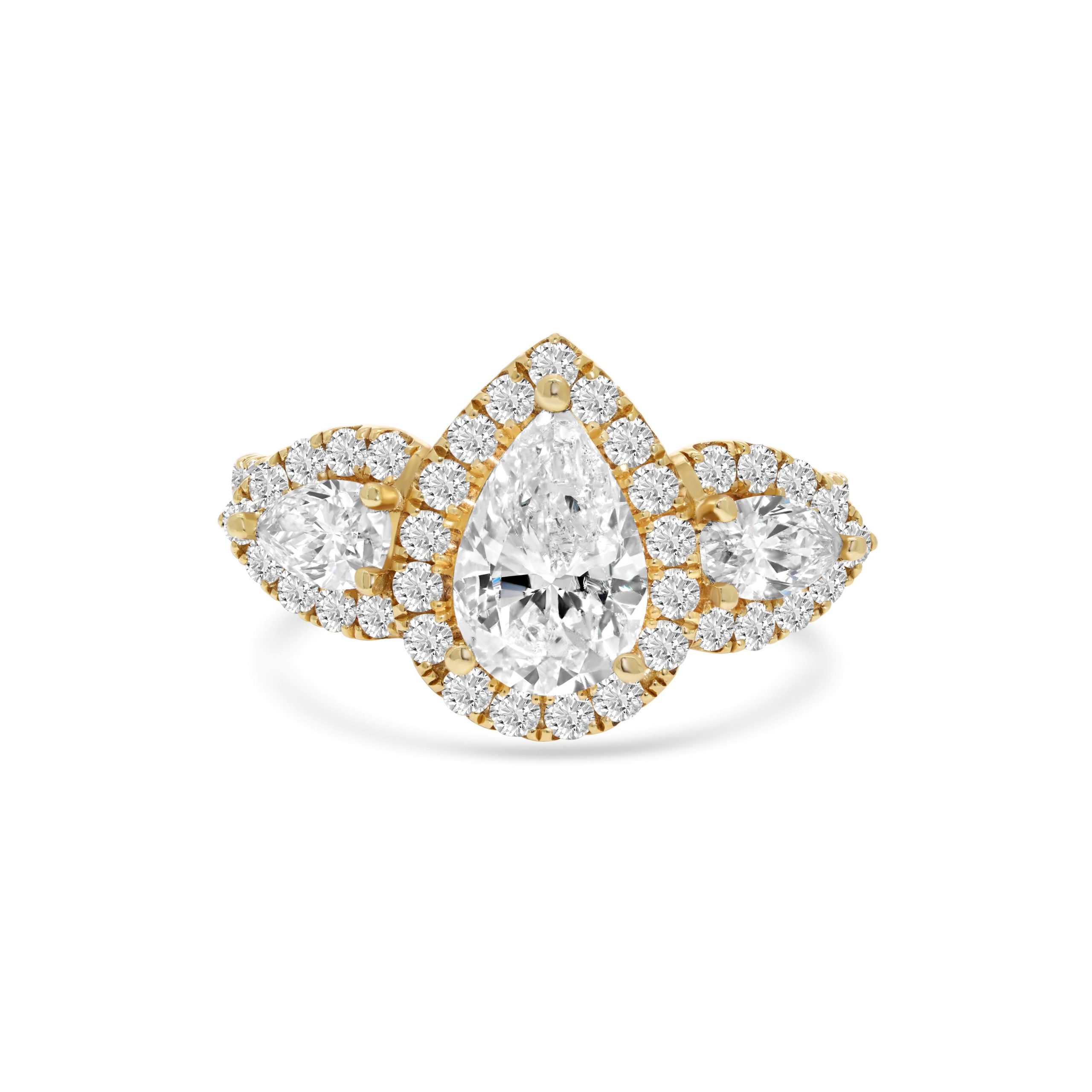 Indulge in timeless beauty with our exquisite 14 karat yellow gold three stone diamond ring. At its heart lies a single striking 1.32ct. pear shaped diamond, flanked gracefully by two .25ct. pear shaped diamonds, together forming a breathtaking trio. Surrounding this captivating arrangement are 1.07cts. of dazzling round brilliant cut diamonds, meticulously set to enhance the brilliance of the center stones. This ring exudes sophistication and elegance, making it a perfect symbol of enduring love or a statement piece for refined luxury in any collection.