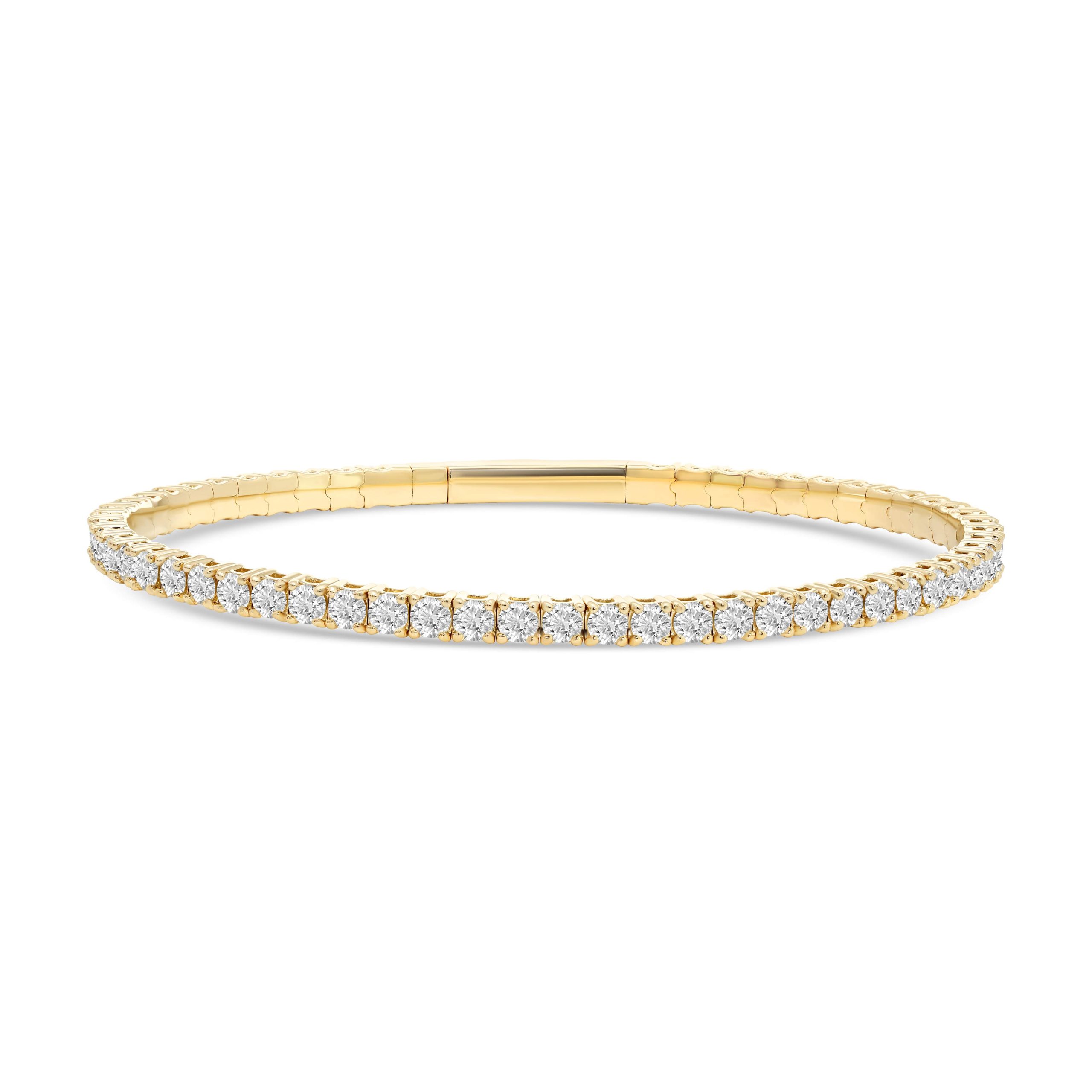 Step into opulent luxury with our 14 karat yellow gold, flexible diamond bangle. Featuring a captivating single row adorned with 3.13cts. of exquisite round brilliant cut diamonds, this piece epitomizes grace and allure. Crafted to seamlessly complement any style, indulge in the luminous beauty and timeless sophistication of this radiant accessory, designed to make every moment gleam with elegance.