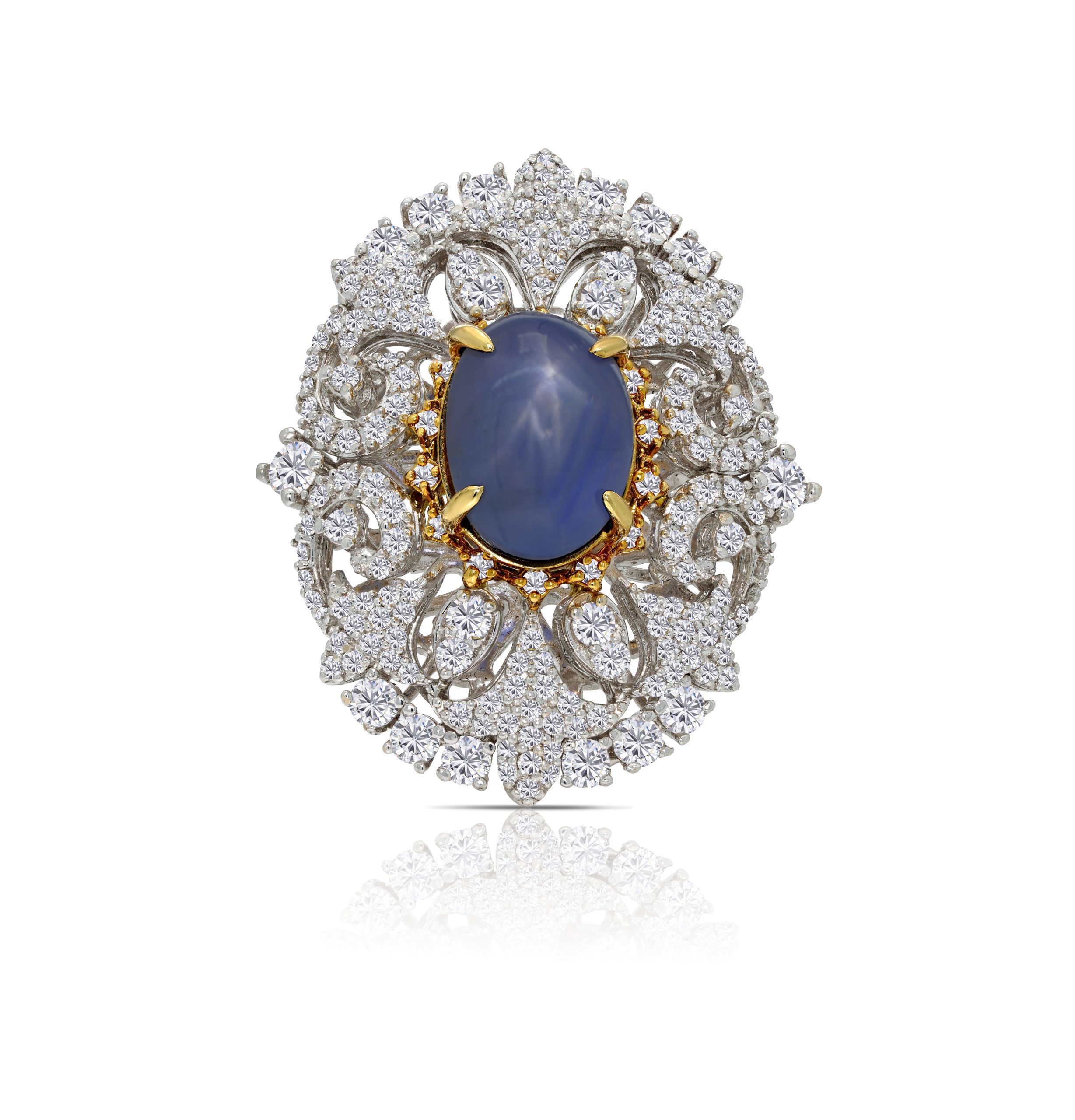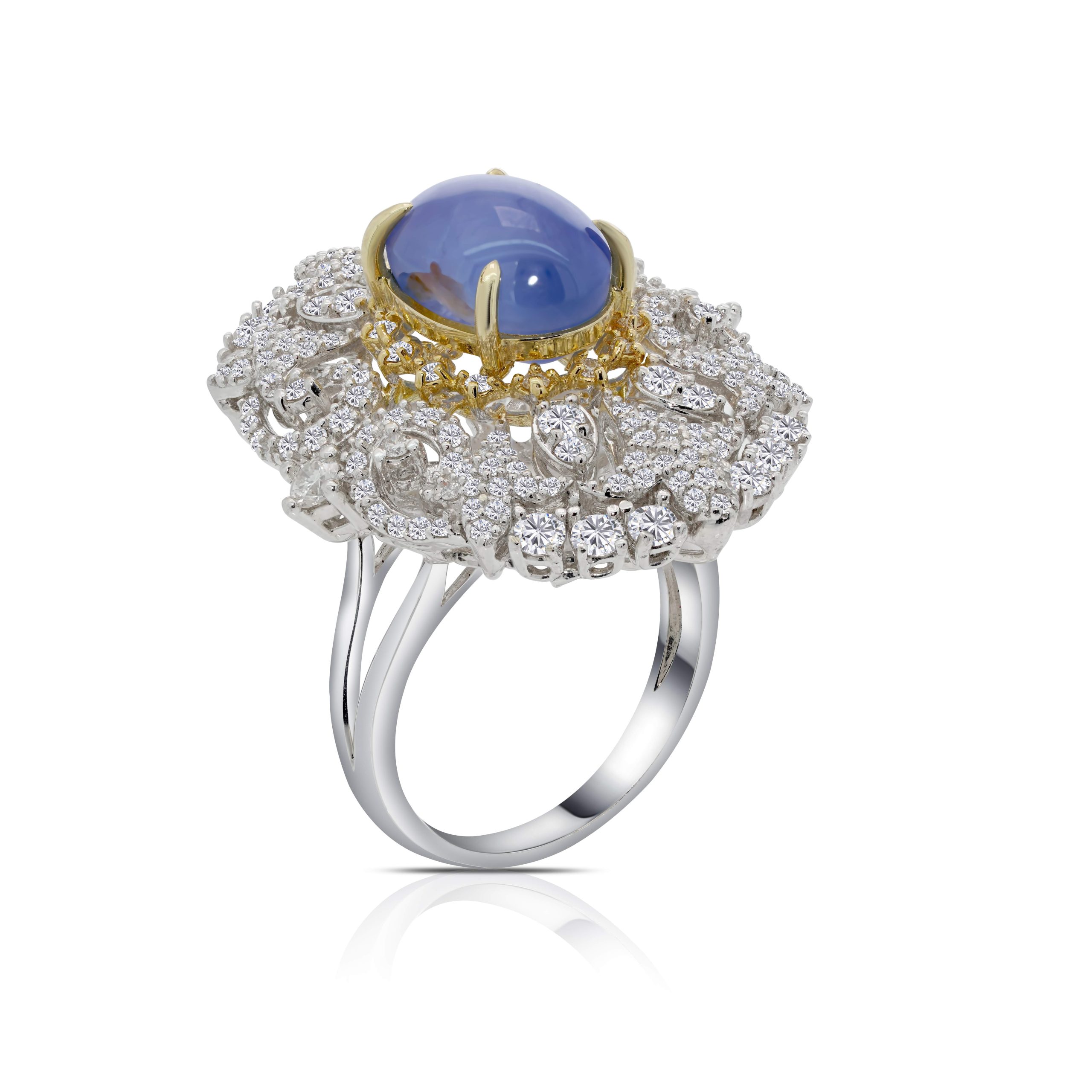 Introducing our exquisite 18 Karat Two-Tone Diamond Cocktail Ring, a true embodiment of luxury and uniqueness. This exceptional ring showcases a single, magnificent 7.92ct. star sapphire as its centerpiece, surrounded by 1.75cts. of round brilliant cut diamonds. The two-tone design adds a touch of sophistication, enhancing the beauty of this captivating gemstone and the brilliance of the diamonds. Whether you’re looking for a striking statement piece or a symbol of your individuality, this cocktail ring is a perfect choice. Elevate your style with the elegance of 18 karat gold and the allure of a star sapphire, making this ring the focal point of any occasion.